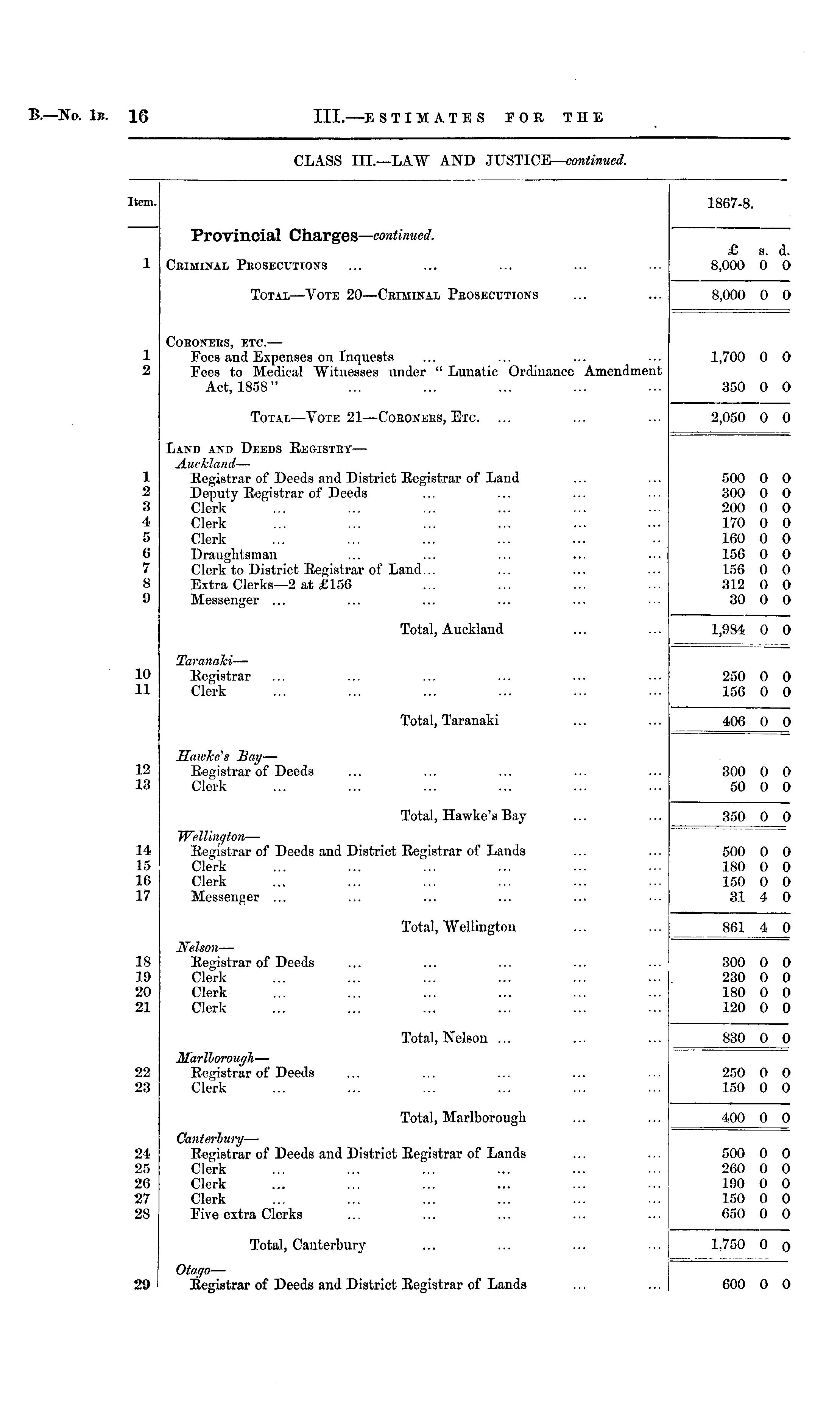 CLASS III.—LAW AND JUSTICE—continued. Item. 1867-8. Provincial Charges— continued. 1 Criminal Peosecutions £ 8,000 s. d. 0 O Total —Vote 20—Ceimdjal Peosecutions 8,000 0 0 1 1> COHOXEIIS, ETC. — Fees and Expenses on Inquests Fees to Medical Witnesses under " Lunatic Ordinance Amendment Act, 1858" 1,700 0 0 350 0 o Total —Vote 21 —Coeoxebs, Etc. ... 2,050 0 0 1 L> 8 4 5 6 7 8 9 Laxd and Deeds Registby— Auckland — Registrar of Deeds and District Registrar of Land Deputy Registrar of Deeds Clerk Clerk Clerk Draughtsman Clerk to District Registrar of Land... Extra Clerks—2 at £156 Messenger ... 500 300 200 170 160 156 156 312 30 0 0 0 0 0 0 0 0 0 O O 0 0 (► 0 0 o 0 Total, Auckland 1,984 0 0 10 11 TaranaJci — Registrar Clerk 250 156 0 0 0 0 Total, Taranaki 406 0 O 12 ia Haivkes Bat/ — Registrar of Deeds Clerk 300 50 0 0 0 o Total, Hawke's Bay 350 0 0 1 I. 15 h; 17 Wellington — Registrar of Deeds and District Registrar of Lands Clerk Clerk Messenger ... 500 180 150 31 0 0 0 0 0 0 4 0 Total, "Wellington 861 4 0 is L9 20 21 Nelson — Registrar of Deeds Clerk Clerk Clerk 300 230 180 120 0 0 0 0 0 0 0 0 Total, Nelson ... 830 0 0 -12 28 Marllorough — Registrar of Deeds Clerk 250 0 150 0 0 0 Total, Marlborough 400 0 0 25 26 '27 28 Canterbury — Registrar of Deeds and District Registrar of Lands Clerk Clerk Clerk Pive extra Clerks 500 200 190 150 650 0 0 0 0 0 0 0 0 0 0 Total, Canterbury 1..750 0 0 Otago — Registrar of Deeds and District Registrar of Lands 29 600 0 0