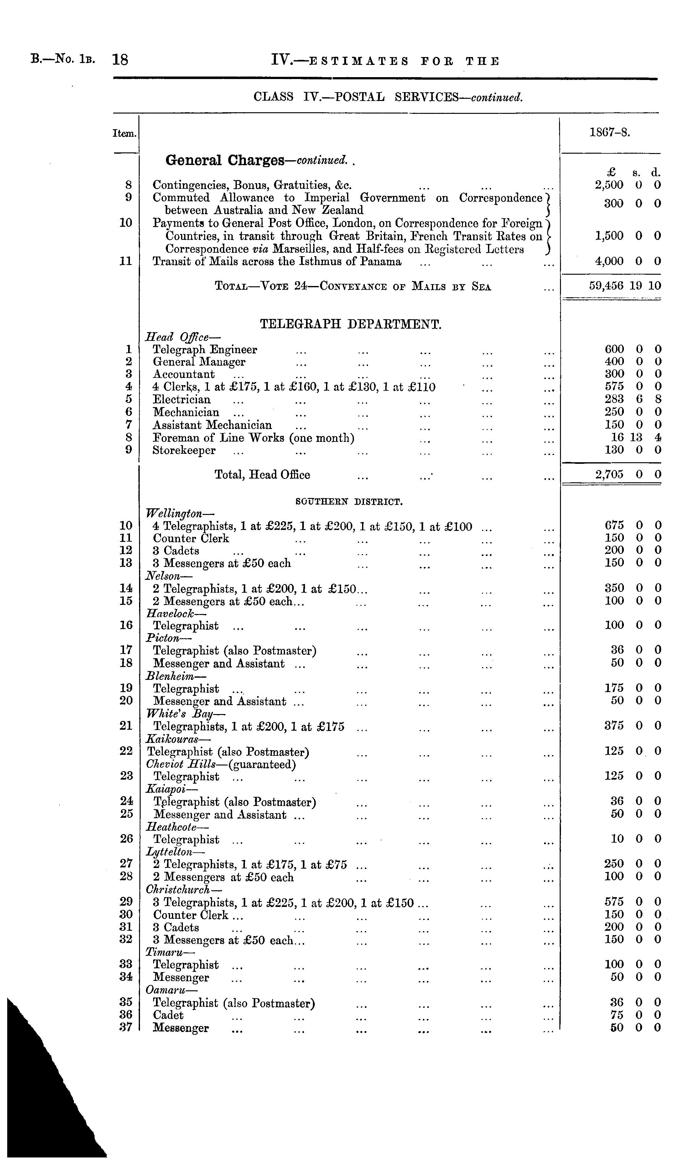 CLASS IV.—POSTAL SERVICES— continued, Item. 1S67-8. General Charges— continued. . 8 9 Contingencies, Bonus, Gratuities, &c. Commuted Allowance to Imperial Government on Correspondence ~) between Australia and New Zealand ) Payments to General Post Office, London, on Correspondence for Foreign S Countries, in transit through Great Britain, French Transit Hates on > Correspondence via Marseilles, and Half-fees on Registered Letters ) Transit of Mails across the Isthmus of Panama £ s. d. 2,500 0 0 300 0 0 10 1,500 0 0 11 4,000 0 0 Total —Vote 24—Conveyance of Mails by Sea 59,456 19 10 TELEGEAPH DEPARTMENT. 1 2 :: 4 6 6 7 S 9 Head Office — Telegraph Engineer General Manager Accountant 4 Clerks, 1 at £.175, 1 at £160, 1 at £130, 1 at £110 ' ... Electrician Mechanician Assistant Mechanician Foreman of Line Works (one month) Storekeeper ... ... ... ... 600 0 •100 0 300 0 575 0 283 6 250 0 150 0 16 13 130 0 0 0 0 0 8 6 o 4 0 Total, Head Office 2,705 0 0 SOUTnEEIf DISTRICT. 10 11 12 13 14 15 1G 17 18 19 20 21 22 23 Wellinr/ton — 4 Telegraphists, 1 at £225, 1 at £200, 1 at £150, 1 at £100 ... Counter Clerk 3 Cadets 3 Messengers at £50 each Nelson — 2 Telegraphists, 1 at £200, 1 at £150... 2 Messengers at £50 each... Havelock — Telegraphist Plcton —■ Telegraphist (also Postmaster) Messenger and Assistant ... Ulcnlieim — Telegraphist ... Messenger and Assistant ... White's Bay — Telegraphists, 1 at £200,1 at £175 ... Kailcouras —■ Telegraphist (also Postmaster) Cheviot Hills —(guaranteed) Telegraphist ... Kaiapoi — Tplegraphist (also Postmaster) Messenger and Assistant ... Heathcote — Telegraphist Lyttelton — 2 Telegraphists, 1 at £175, 1 at £75 ... 2 Messengers at £50 each ... ... Christchurch — 3 Telegraphists, 1 at £225, 1 at £200,1 at £150 ... Counter Clerk ... 3 Cadets 3 Messengers at £50 each... Timaru — Telegraphist ... Messenger Oamaru — Telegraphist (also Postmaster) Cadet Messenger 675 150 200 150 350 100 100 36 50 175 50 375 125 125 0 0 0 0 0 0 0 0 0 0 0 0 0 0 0 0 0 0 0 0 0 0 0 0 0 0 0 0 24 25 36 50 0 0 0 0 26 10 0 0 27 28 250 100 0 0 0 0 29 30 31 32 575 150 200 150 0 0 0 0 0 0 0 0 33 34 100 50 0 0 0 0 35 36 37 36 75 50 0 0 0 0 0 0