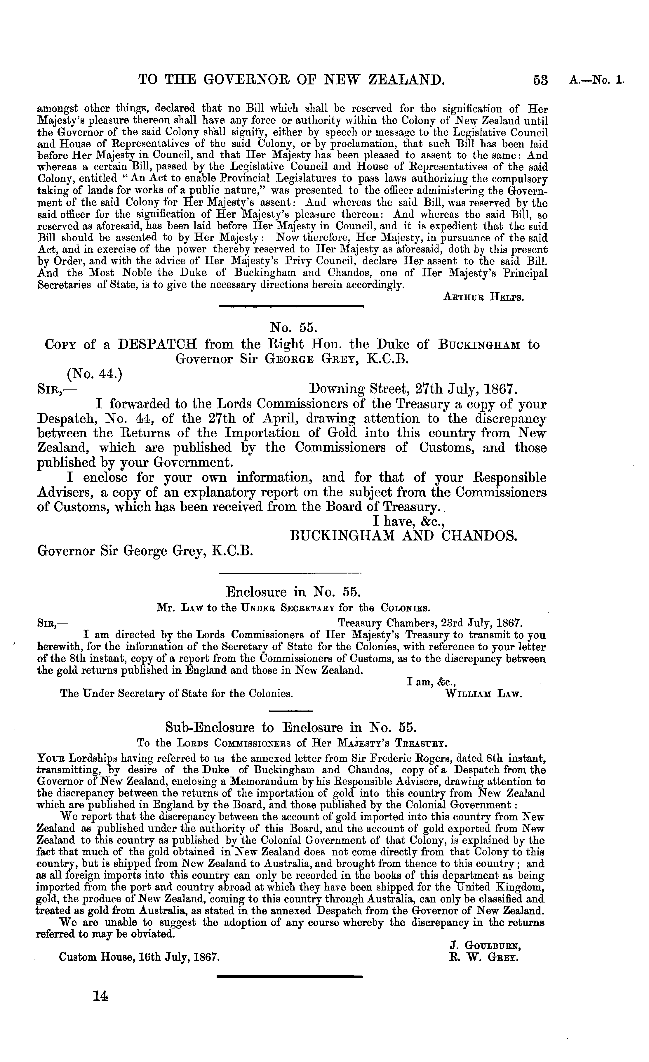 No. 55. Copy of a DESPATCH from the Right Hon. the Duke of Buckingham to Governor Sir George Grey, K.C.B. (No. 44.) Sir,— Downing Street, 27th July, 1867. I forwarded to the Lords Commissioners of the Treasury a copy of your Despatch, No. 44, of the 27th of April, drawing attention to the discrepancy between the Returns of the Importation of Gold into this country from New Zealand, which are published by the Commissioners of Customs, and those published by your Government. I enclose for your own information, and for that of your .Responsible Advisers, a copy of an explanatory report on the subject from the Commissioners of Customs, which has been received from the Board of Treasury.. have &c. BUCKINGHAM AND CHANDOS. Governor Sir George Grey, K.C.B.
