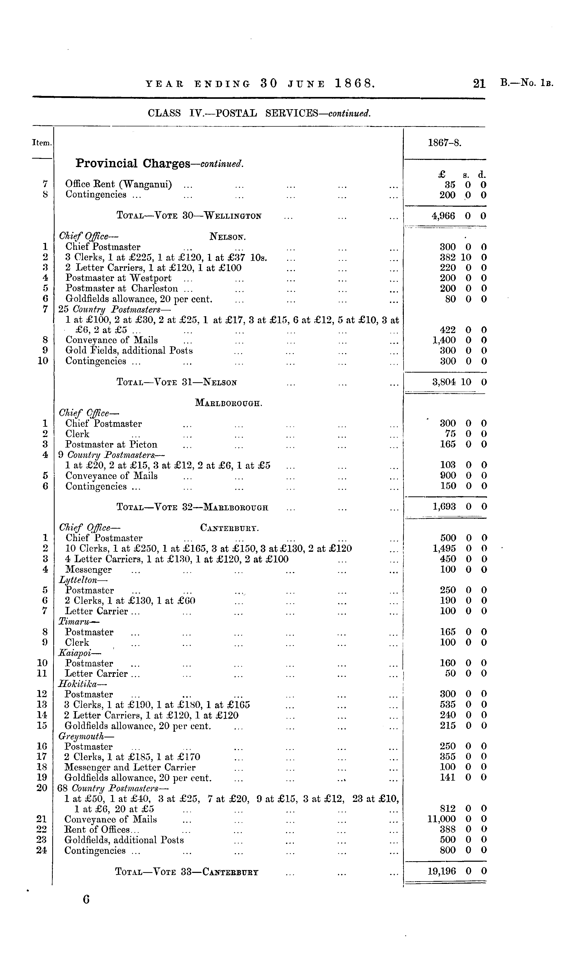 CLASS IV.—POSTAL SERVICES— continued. Item. 1867-8. Provincial Charges— continued. 7 s Office Eent (Wanganui) Contingencies ... £ s. d. 35 0 0 200 0 0 Total—Vote 30 —"Wellington 4,966 0 o l •> :: 4 5 6 7 Chief Office —■ Nelson. Chief Postmaster 3 Clerks, 1 at £225, 1 at £120, 1 at £37 10s. 2 Letter Carriers, 1 at £120, 1 at £100 Postmaster at Westport Postmaster at Charleston ... Goldfields allowance, 20 per cent. 25 Country Postmasters — 1 at £100, 2 at £30, 2 at £25, 1 at £17. 3 at £15, 6 at £12, 5 at £10, 3 at £6, 2 at £5 ... Conveyance of Mails Gold Fields, additional Posts Contingencies ... 300 0 382 10 220 0 200 0 200 0 80 0 0 0 0 0 0 0 8 !> 10 422 0 1,400 0 300 0 300 0 0 0 0 0 Total—Vote 31—Nelson 3,804 10 0 Maelboeough. 1 :: 4 Chief Office— Chief Postmaster Clerk Postmaster at Picton 9 Country Postmasters. — 1 at £20, 2 at £15, 3 at £12, 2 at £6, 1 at £5 Conveyance of Mails Contingencies ... 300 75 165 0 0 0 0 0 0 6 6 103 900 150 0 0 0 0 0 0 Total—Vote 32—Maelboeoitgh 1,693 0 0 1 3 4 5 6 7 8 !) 10 11 12 13 14 15 Chief Office — Canteebuet. Chief Postmaster 10 Clerks, 1 at £250, 1 at £165, 3 at £150, 3 at £130, 2 at £120 4 Letter Carriers, 1 at £130, 1 at £120, 2 at £100 Messenger Lyttelton —■ Postmaster ... ... ..^ 2 Clerks, 1 at £130, 1 at £60 Letter Carrier ... Timaru — Postmaster Clerk Kaiapoi — Postmaster Letter Carrier ... Holcitika —■ Postmaster 3 Clerks, 1 at £190, 1 at £180, 1 at £1G5 2 Letter Carriers, 1 at £120, 1 at £120 Goldfields allowance, 20 per eent. Grei/mouth — Postmaster 2 Clerks, 1 at £185, 1 at £170 Messenger and Letter Carrier Goldfields allowance, 20 per cent. 68 Country Postmasters —■ 1 at £50, 1 at £40, 3 at £25, 7 at £20, 9 at £15, 3 at £12, 23 at £10, 1 at £G, 20 at £5 Conveyance of Mails Rent of Offices... Goldfields, additional Posts Contingencies ... 500 1,4-95 450 100 250 190 100 165 100 160 50 300 535 240 215 0 0 0 0 0 0 0 0 0 0 0 0 0 0 0 0 0 0 0 0 0 0 0 0 0 0 0 0 0 0 16 17 18 19 20 250 355 100 141 0 0 0 0 0 0 0 0 21 24 812 11.000 388 500 800 0 0 0 0 0 0 0 o 0 0 Total —Vote 33 —Canteebuet 19,196 0 0 G