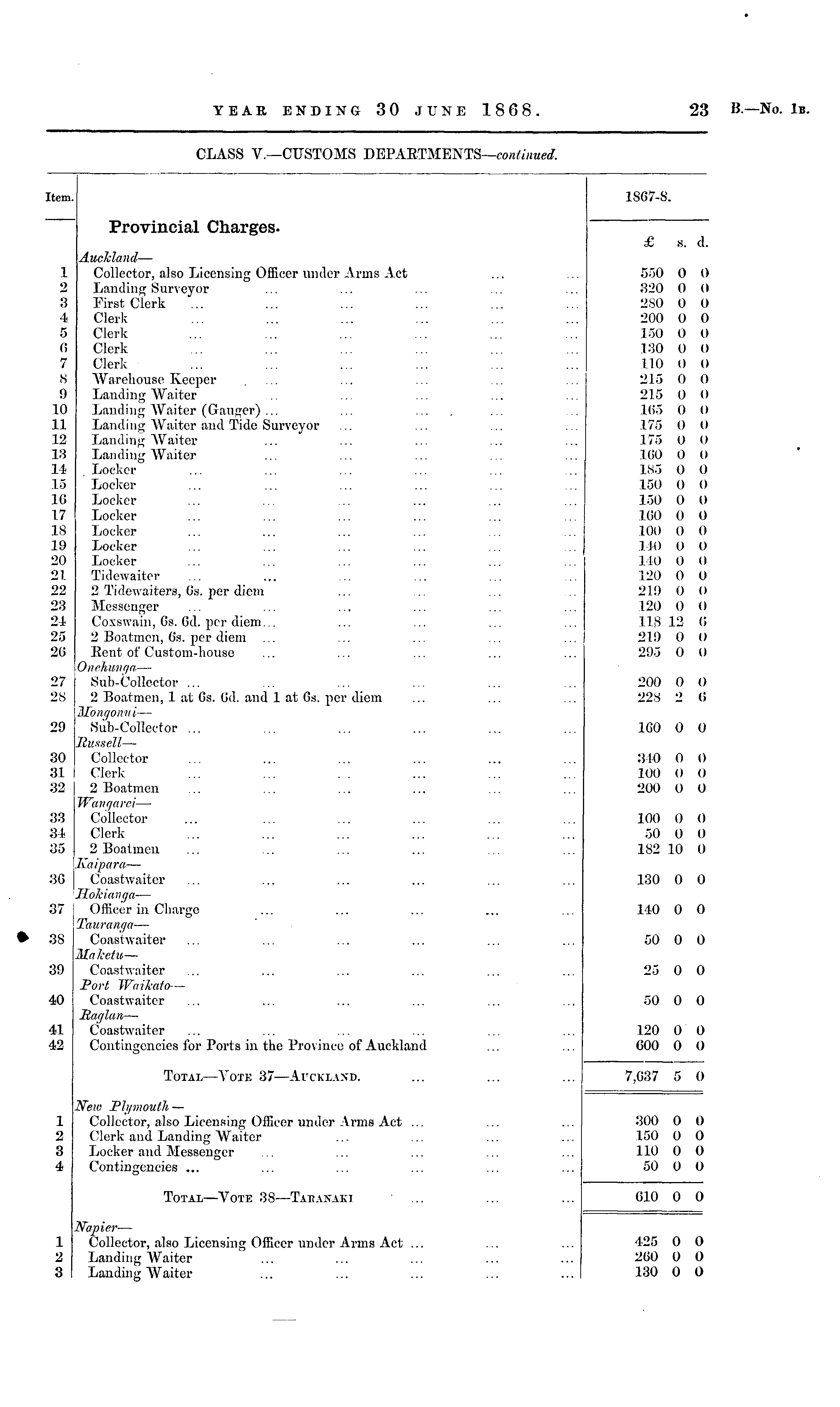 CLASS V.—CUSTOMS DEPARTMENTS— continued. Item. 18G7-S. Provincial Charges. 1 2 3 4 5 6 7 8 !) 10 11 12 18 14 15 16 17 18 19 20 21 22 23 24 25 26 Auckland — Collector, also Licensing Officer under Arms Act Landing Surveyor First Clerk Clerk Clerk Clerk Clerk Warehouse Keeper .... Landing Waiter Landing Waiter (Ganger) ... Landing Waiter and Tide Surveyor Landing Waiter Landing Waiter Locker Locker Locker Locker Locker Locker Locker Tidewaiter 2 Tidewaiters, Gs. per diem Messenger Coxswain, Gs. Gd. per diem.,. 2 Boatmen, 6s. per diem ... Eent of Custom-honse Onehunga — Sub-Collector ... 2 Boatmen, 1 at Cs. Gd. and 1 at Gs. per diem Mongonui — Sub-Collector ... Russell — Collector Clerk 2 Boatmen Wangarei — Collector Clerk 2 Boatmen Kaipara — Coastwaiter 'Jlohlanqa — Officer in Charge £ s. d. 550 0 0 320 0 0 2 SO 0 0 200 0 0 150 0 0 130 0 0 110 0 0 215 0 0 215 0 o 165 0 0 175 () o 175 0 O 100 0 0 185 0 0 150 0 0 150 0 0 160 0 0 100 0 0 140 0 0 140 0 0 120 0 0 219 0 0 120 0 0 118 12 G 219 0 0 295 0 0 27 28 200 0 0 228 2 G 29 1G0 0 0 30 31 32 310 0 0 100 0 0 200 0 0 33 34 35 100 0 0 50 0 0 1S2 10 0 3G 130 0 0 37 f 140 0 0 | i 38 39 40 Tiniraiigti — Coastwaiter Malcetu — Coastwaiter Port WaiJcato— Coastwaiter Raglan — Coastwaiter Contingencies for Ports in the Province of Auckland 50 0 0 25 0 0 50 0 0 41 42 120 0 0 600 0 0 Total—Vote 37 —Auckland. 7,G37 5 0 1 •_> 8 4 New Plymouth — Collector, also Licensing Officer under Arms Act ... Clerk and Landing Waiter Locker and Messenger Contingencies ... 300 150 110 50 0 0 0 0 o 0 (• o Total—Vote 88—Tabajtaki ' ... 610 0 0 1 2 8 Napier — Collector, also Licensing Officer under Arms Act ... Landing Waiter Landing Waiter 425 260 130 0 0 0 0 0 0