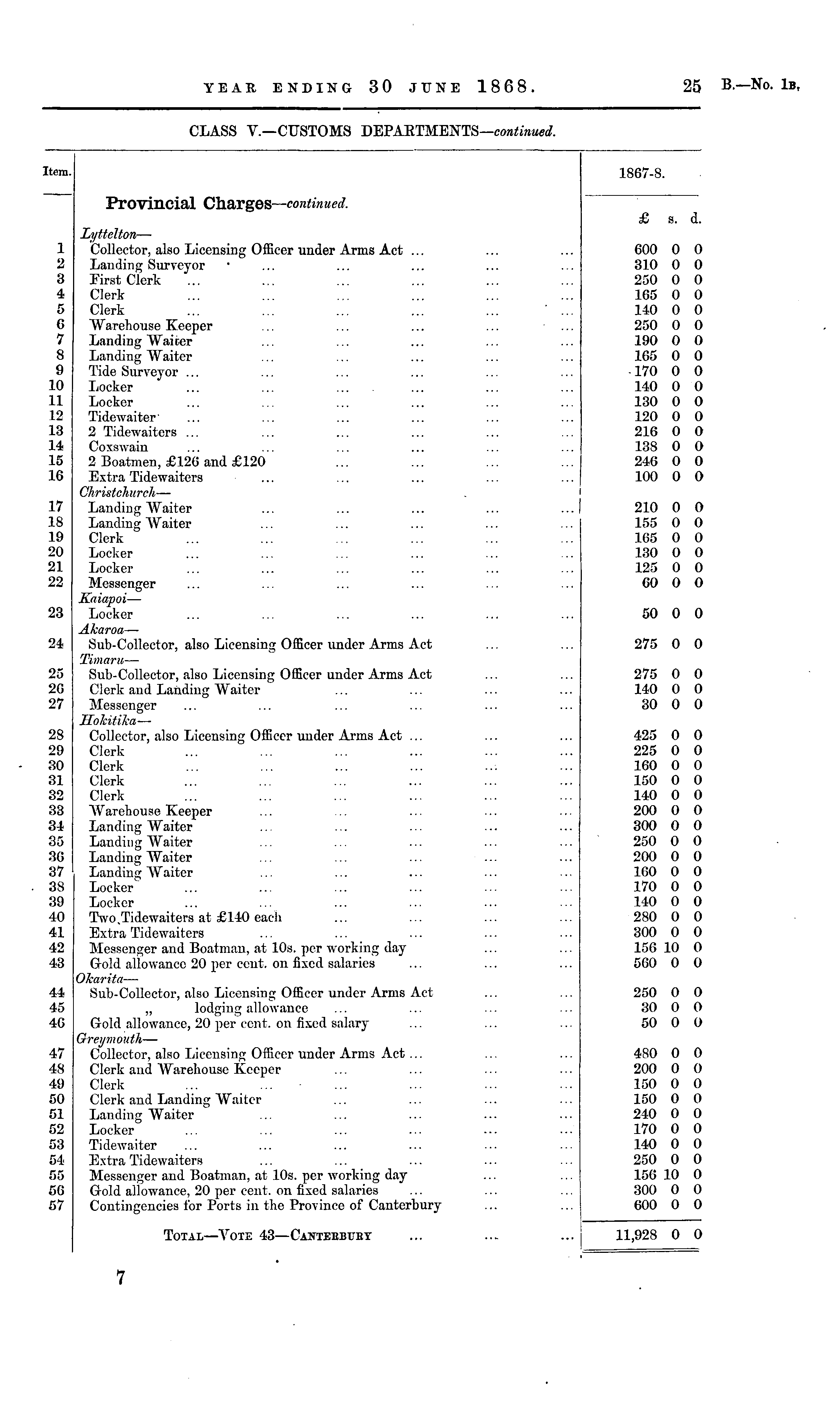 CLASS V.—CUSTOMS DEPARTMENTS— continued. Item. 18G7-8. Provincial Charges— continued. Li/ltclton — Collector, also Licensing Officer under Arms Act ... Landing Surveyor First Clerk Clerk Clerk "Warehouse Keeper Landing Waiter Landing Waiter Tide Surveyor ... Locker Locker Tidewaiter 2 Tidewaiters ... Coxswain 2 Boatmen, £126 and £120 Extra Tidewaiters Cliristchurch — Landing "Waiter Landing Winter Clerk Locker Locker Messenger Kaiapoi — Locker Akaroa — Sub-Collector, also Licensing Officer under Arms Act Timaru — Sub-Collector, also Licensing Officer under Arms Act Clerk and Landing "Waiter Messenger Sokitika — Collector, also Licensing Officer under Arms Act ... Clerk Clerk Clerk Clerk Warehouse Keeper Landing Waiter Landing Waiter Landing Waiter Landing Waiter Locker Locker Two .Tidewaiters at £140 eat-li Extra Tidewaiters Messenger and Boatman, at 10s. per working day Gold allowance 20 per cent, on fixed salaries OJcarita — Sub-Collector, also Licensing Officer under Arms Act „ lodging allowance Gold allowance, 20 per cent, on fixed salary Grri/inoiith — Collector, also Licensing Officer under Arms Act... Clerk and Warehouse Keeper Clerk ... ... • Clerk and Landing Waiter Landing Waiter Locker Tidewaiter Extra Tidewaiters Messenger and Boatman, at 10s. per working day Gold allowance, 20 per cent, on fixed salaries Contingencies for Ports in the Province of Canterbury £ s. d. 1 2 3 4 5 6 7 S 0 10 11 12 13 14 15 16 GOO 0 310 0 250 0 165 0 140 0 250 0 190 0 165 0 170 0 140 0 130 0 120 0 216 0 138 0 246 0 100 0 0 0 0 0 0 0 0 0 0 0 0 0 0 0 0 0 17 18 19 20 21 22 210 0 155 0 165 0 130 0 125 0 60 0 0 0 0 0 0 0 23 50 0 0 24 275 0 0 25 20 27 275 0 140 0 30 0 0 0 0 28 2!) 30 31 32 33 34 35 36 37 38 39 40 41 42 43 425 0 225 0 160 0 150 0 140 0 200 0 300 0 250 0 200 0 160 0 170 0 140 0 280 0 300 0 156 10 5G0 0 0 0 0 0 0 0 0 0 0 0 0 0 0 0 0 0 44 45 4G 250 0 30 0 50 0 0 0 0 47 ■is 49 50 51 52 53 54 55 50 57 480 0 200 0 150 0 150 0 240 0 170 0 140 0 250 0 156 10 300 0 600 0 0 0 0 0 0 0 0 0 0 0 0 Total—Vote 43 —Caktebbuby 11,928 0 0 7