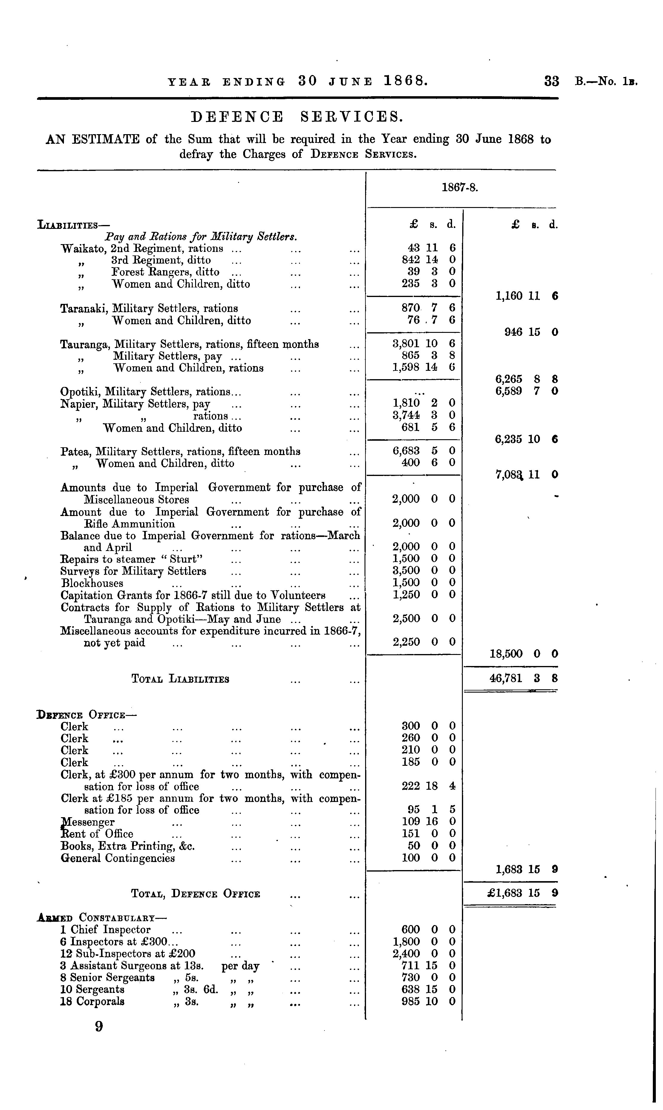 DEFENCE SEEVI CES. AN ESTIMATE of the Sum that will be required in ti defray the Charges of Defence he Year ending 30 June 1868 to Services. 186' ■-8. Liabilities— Pay and Rations for military Settlers. Waikato, 2nd Regiment, rations ... „ 3rd Regiment, ditto „ Forest Rangers, ditto „ Women and Children, ditto £ s. d. 43 11 6 842 14 0 39 3 0 235 3 0 £ a. d. 1,160 11 6 Taranaki, Military Settlers, rations „ Women and Children, ditto 870 7 76 .7 946 15 0 Tauranga, Military Settlers, rations, fifteen months ,, Military Settlers, pay ... „ Women and Children, rations 3,801 10 865 3 1,598 14 (i 8 6 6,265 8 8 6,589 7 0 Opotiki, Military Settlers, rations... Napier, Military Settlers, pay „ „ rations... Women and Children, ditto 1,810 2 3,744 3 681 5 0 o <; 6,235 10 6 Patea, Military Settlers, rations, fifteen months „ Women and Children, ditto 6,683 400 5 6 0 0 7,08^ 11 0 Amounts due to Imperial Government for purchase of Miscellaneous Stores Amount due to Imperial Government for purchase of Rifle Ammunition Balance due to Imperial Government for rations—March and April Repairs to steamer " Sturt" Surveys for Military Settlers Blockhouses Capitation Grants for 1866-7 still due to Volunteers Contracts for Supply of Rations to Military Settlers at Tauranga and Opotiki —May and June ... Miscellaneous accounts for expenditure incurred in 1866-7, not yet paid 2,000 2,000 2,000 1,500 3,500 1,500 1,250 0 0 0 0 0 0 0 0 0 () o 0 0 0 2,500 0 0 18,500 0 0 2,250 0 0 Total Liabilities 46,781 3 S Defence Office— Clerk Clerk Clerk Clerk Clerk, at £300 per annum for two months, ■with compensation for loss of office Clerk at £185 per annum for two months, with compensation for loss of office 300 0 260 0 210 0 185 0 0 0 0 0 222 18 4 Messenger Rent of Office Books, Extra Printing, &c. General Contingencies 95 1 109 16 151 0 50 0 100 0 5 0 0 0 0 1,683 15 0 Total, Defence Office £1,683 15 9 Akmed Constabulary— 1 Chief Inspector 6 Inspectors at £300... 12 Sub-Inspectors at £200 3 Assistant Surgeons at 13s. per day 8 Senior Sergeants ,, 5s. „ „ 10 Sergeants „ 3s. 6d. „ „ 18 Corporals „ 3s. „ „ 600 0 1,800 0 2,400 0 711 15 730 0 638 15 985 10 0 0 0 0 0 0 0 9