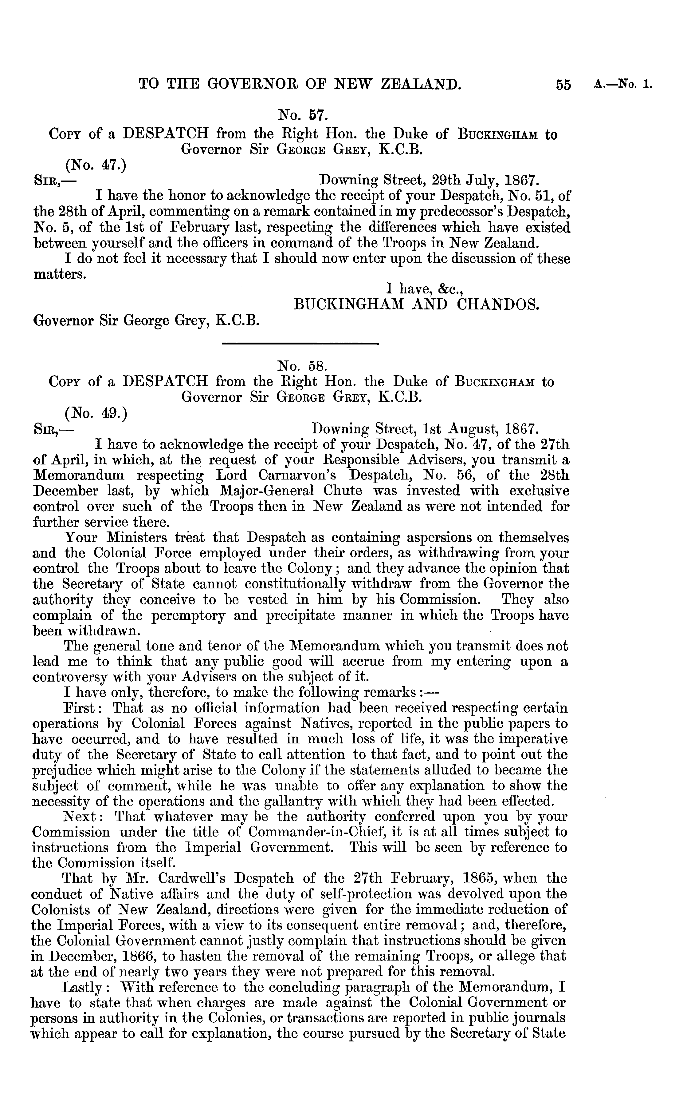 No. 58. Copy of a DESPATCH from the Right Hon. the Duke of Buckingham to Governor Sir George Grey, K.C.B. (No. 49.) Sir, — Downing Street, 1st August, 1867. I have to acknowledge the receipt of your Despatch, No. 47, of the 27th of April, in which, at the request of your Responsible Advisers, you transmit a Memorandum respecting Lord Carnarvon's Despatch, No. 56, of the 28th December last, by which Major-General Chute was invested with exclusive control over such of the Troops then in New Zealand as were not intended for further service there. Your Ministers treat that Despatch as containing aspersions on themselves and the Colonial Force employed under their orders, as withdrawing from your control the Troops about to leave the Colony; and they advance the opinion that the Secretary of State cannot constitutionally withdraw from the Governor the authority they conceive to be vested in him by his Commission. They also complain of the peremptory and precipitate manner in which the Troops have been withdrawn. The general tone and tenor of the Memorandum which you transmit does not lead me to think that any public good will accrue from my entering upon a controversy with your Advisers on the subject of it. I have only, therefore, to make the following remarks : — First: That as no official information had been received respecting certain operations by Colonial Forces against Natives, reported in the public papers to have occurred, and to have resulted in much loss of life, it was the imperative duty of the Secretary of State to call attention to that fact, and to point out the prejudice which might arise to the Colony if the statements alluded to became the subject of comment, while he was unable to offer any explanation to show the necessity of the operations and the gallantry with which they had been effected. Next: That whatever may be the authority conferred upon you by your Commission under the title of Commander-in-Chief, it is at all times subject to instructions from the Imperial Government. This will be seen by reference to the Commission itself. That by Mr. Cardwell's Despatch of the 27th February, 1865, when the conduct of Native affairs and the duty of self-protection was devolved upon the Colonists of New Zealand, directions were given for the immediate reduction of the Imperial Forces, with a view to its consequent entire removal; and, therefore, the Colonial Government cannot justly complain that instructions should be given in December, 1866, to hasten the removal of the remaining Troops, or allege that at the end of nearly two years they were not prepared for this removal. Lastly : With reference to the concluding paragraph of the Memorandum, I have to state that when charges are made against the Colonial Government or persons in authority in the Colonies, or transactions are reported in public journals which appear to call for explanation, the course pursued by the Secretary of State
