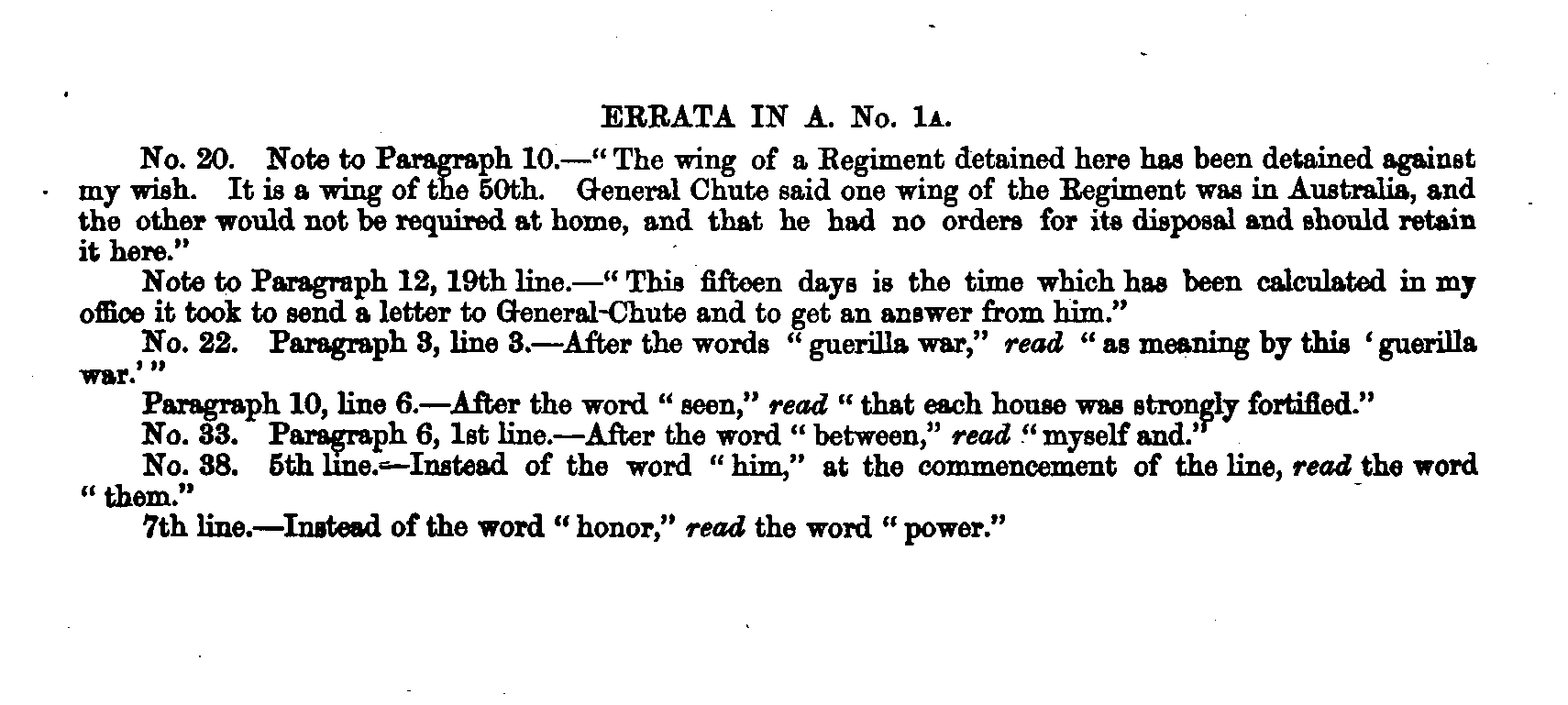 No. 20. Note to Paragraph 10. —" Tho wing of a Begiment detained here ha9 been detained against my wish. It is a wing of the 50th. General Chute said one wing of the Begiment was in Australia, and the other would not be required at home, and that he had no orders for its disposal and should retain it here." Note to Paragraph 12, 19th line.—" This fifteen days is the time which has been calculated in my office it took to send a letter to General-Chute and to get an answer from him." No. 22. Paragraph 3, line 3.—After the words " guerilla war," read, "as meaning by this ' guerilla war.'" Paragraph 10, line 6.—After the word " seen," read " that each house was strongly fortified." No. 33. Paragraph 6, Ist line.—After the word " between," read " myself and." No. 38. 6th line. —Instead of the word " him," at the commencement of the line, read the word " them." 7th line. —Instead of the word " honor," read the word " power."