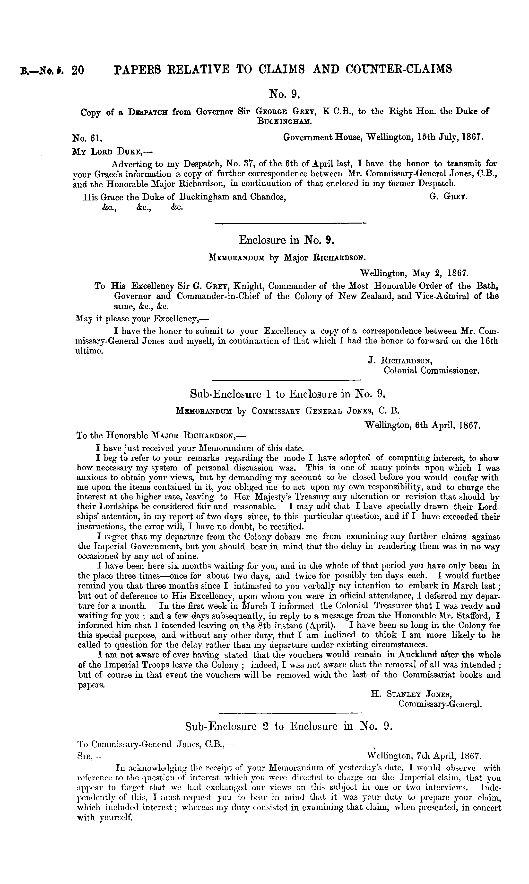 Sub-Enclosure 2 to Enclosure in No. 9. To Commissary-General Jones, C.B., — t Sir, — Wellington, 7th April, 1867. In acknowledging the receipt of your Memorandum of yesterday's date, I would observe with reference to the question of interest which you were directed to charge on the Imperial claim, that you appear to forget that we had exchanged our views on this subject in one or two interviews. Independently of this, I must request you to bear in mind that it was your duty to prepare your claim, which included interest; whereas my duty consisted in examining that claim, when presented, in concert with yourself.