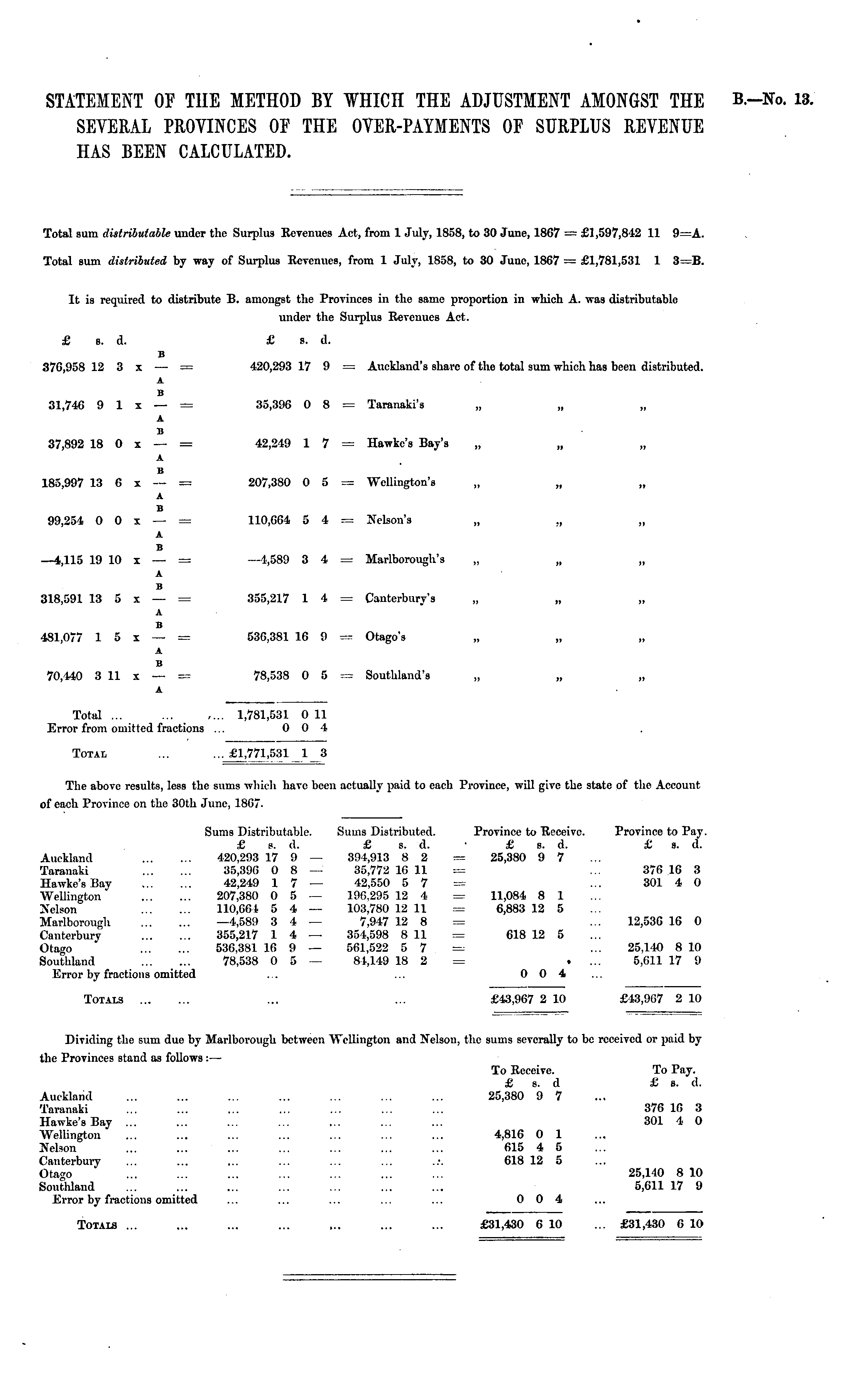 Total sum distributable under the Surplus Revenues Act, from 1 July, 1858, to 30 June, 1867 = £1,597,842 11 9=A. Total sum distributed by way of Surplus Revenues, from 1 July, 1858, to 30 Juuc, 1867 = £1,781,531 1 3=B. It is required to distribute B. amongst the Provinces in the same proportion in which A. was distributable under the Surplus Revenues Act. £ 8. d. £ s. d. B 376,958 12 3 x — = 420,293 17 9 = Auckland's share of the total sum which has been distributed. A B 31,746 9 1 x — = 35,396 0 8 = Taranaki's „ A B 37,892 18 0 x — = 42,249 17 = Hawkc's Bay's A B 183,997 13 6 x — = 207,380 0 5 = Wellington's A B 99,234 0 0 x — = 110,664 5 4 = Nelson's „ „ „ A B —4,115 19 10 x — = —4,589 3 4 = Marlborough's „ „ „ A B 31S.591 13 5 x — = 355,217 14 = Canterbury's „ „ A B 481,077 1 5 x — = 536,381 16 9 = Otago's A B 70,140 3 11 x — = 78,538 0 5 = Southland's „ „ „ A Total ... 1,781,531 0 11 Error from omitted fractions ... 0 0 4 Total ... ... £1,771,531 1 3 Total The above results, less the sums which have been actually paid to each Province, will give the state of the Account of each Province on the 30th June, 1867. Sums Distributable. Sums Distributed. Province to Receive. Province to Pay. £ s. (I. £ s. d. £ s. d. £ s. d. Auckland 420,293 17 9 — 394,913 8 2 = 25,380 9 7 'taranaki 35,396 0 8 — 35,772 16 11 = ... 376 16 3 Hawke'sBay 42,249 1 7 — 42,550 5 7= ... 301 4 0 Wellington 207,380 0 5 — 196,295 12 4 = 11,084 8 1 Nelson 110,661 5 4 — 103,780 12 11 = 6,883 12 5 Marlborough —4,589 3 4 — 7,947 12 8 = ... 12,536 16 0 Canterbury 355,217 1 4 — 354,598 8 11 = 618 12 5 Otago 536.381 16 9 — 561,522 5 7= ... 25,140 8 10 Southland 78,538 0 5 — 84,149 18 2 = . ... 5,611 17 9 Error by fractious omitted ... ... 004... Totals ... ... £43,967 2 10 £43,967 2 10 Dividing the sum due by Marlborough between Wellington and Nelson, the sums severally to be received or paid by the Provinces stand as follows : — To Receive. To Pay. £ s. d £ s. d. Auckland ... ... ... ... ... ... ... 25,380 9 7 Taranaki 376 16 3 Hawke'sBay ... ... ... ... ... ... ... 301 4 0 Wellington ... ... ... ... ... ... ... 4,816 0 1 Nelson ... ... ... ... ... ... ... 615 4 5 Canterbury ... ... ... ... ... ... ..-. 618 12 5 Ota<*o ... ... ... ... ... ... ... 25,110 8 10 Southland ... ... ... ... ... ... ... 5,611 17 9 Error by fractions omitted ... ... ... ... ... 004 Totals ... ... ... ... ... ... ... £31,430 6 10 ... £31,430 6 10