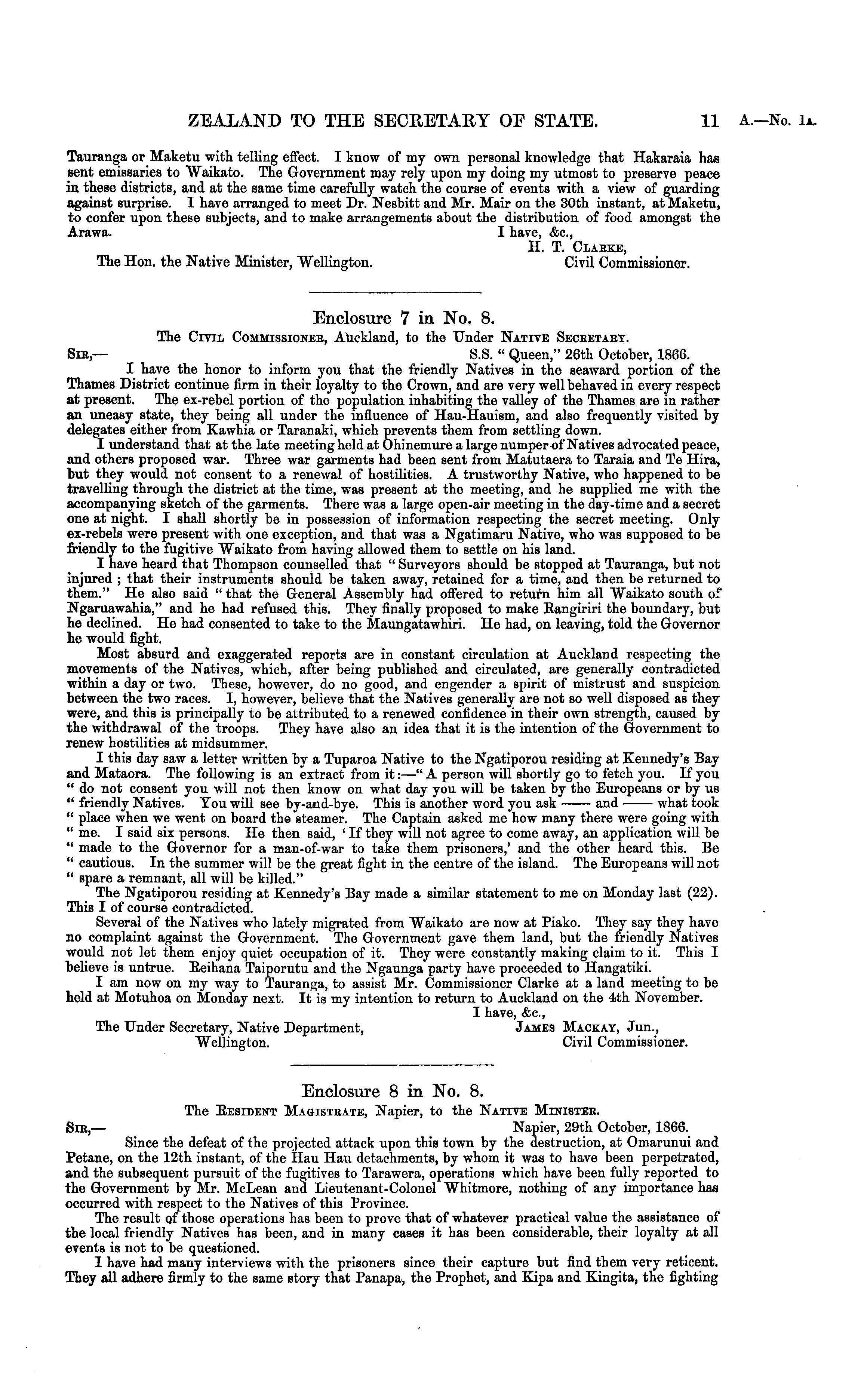 Enclosure 7 in No. 8. The CrviL Commissioner, Auckland, to the Under Native Secretary. Sir— S.S. " Queen," 26th October, 1866. I have the honor to inform you that the friendly Natives in the seaward portion of the Thames District continue firm in their loyalty to the Crown, and are very well behaved in every respect at present. The ex-rebel portion of the population inhabiting the valley of the Thames are in rather an uneasy state, they being all under the influence of Hau-Hauism, and also frequently visited by delegates either from Kawhia or Taranaki, which prevents them from settling down. I understand that at the late meeting held at Ohinemure a large numper of Natives advocated peace, and others proposed war. Three war garments had been sent from Matutaera to Taraia and Te Hira, but they would not consent to a renewal of hostilities. A trustworthy Native, who happened to be travelling through the district at the time, was present at the meeting, and he supplied me with the accompanying sketch of the garments. There was a large open-air meeting in the day-time and a secret one at night. I shall shortly be in possession of information respecting the secret meeting. Only ex-rebels were present with one exception, and that was a Ngatimaru Native, who was supposed to be friendly to the fugitive Waikato from having allowed them to settle on his land. I have heard that Thompson counselled that " Surveyors should be stopped at Tauranga, but not injured ; that their instruments should be taken away, retained for a time, and then be returned to them." He also said " that the General Assembly had offered to return him all Waikato south of Ngaruawahia," and he had refused this. They finally proposed to make Bangiriri the boundary, but he declined. He had consented to take to the Maungatawhiri. He had, on leaving, told the Governor he would fight. Most absurd and exaggerated reports are in constant circulation at Auckland respecting the movements of the Natives, which, after being published and circulated, are generally contradicted within a day or two. These, however, do no good, and engender a spirit of mistrust and suspicion between the two races. I, however, believe that the Natives generally are not so well disposed as they were, and this is principally to be attributed to a renewed confidence in their own strength, caused by the withdrawal of the troops. They have also an idea that it is the intention of the Government to renew hostilities at midsummer. I this day saw a letter written by a Tuparoa Native to the Ngatiporou residing at Kennedy's Bay and Mataora. The following is an extract from it: —" A person will shortly go to fetch you. If you " do not consent you will not then know on what day you will be taken by the Europeans or by us " friendly Natives. Tou will see by-and-bye. This is another word you ask and what took " place when we went on board the steamer. The Captain asked me how many there were going with " me. I said six persons. He then said, 'If they will not agree to come away, an application will be " made to the Governor for a man-of-war to take them prisoners,' and the other heard this. Be " cautious. In the summer will be the great fight in the centre of the island. The Europeans will not " spare a remnant, all will be killed." The Ngatiporou residing at Kennedy's Bay made a similar statement to me on Monday last (22). This I of course contradicted. Several of the Natives who lately migrated from Waikato are now at Piako. They say they have no complaint against the Government. The Government gave them land, but the friendly Natives would not let them enjoy quiet occupation of it. They were constantly making claim to it. This I believe is untrue. Beihana Taiporutu and the Ngaunga party have proceeded to Hangatiki. I am now on my way to Tauranga, to assist Mr. Commissioner Clarke at a land meeting to be held at Motuhoa on Monday next. It is my intention to return to Auckland on the 4th November. I have, &c., The Under Secretary, Native Department, James Mackay, Jun., Wellington. Civil Commissioner.