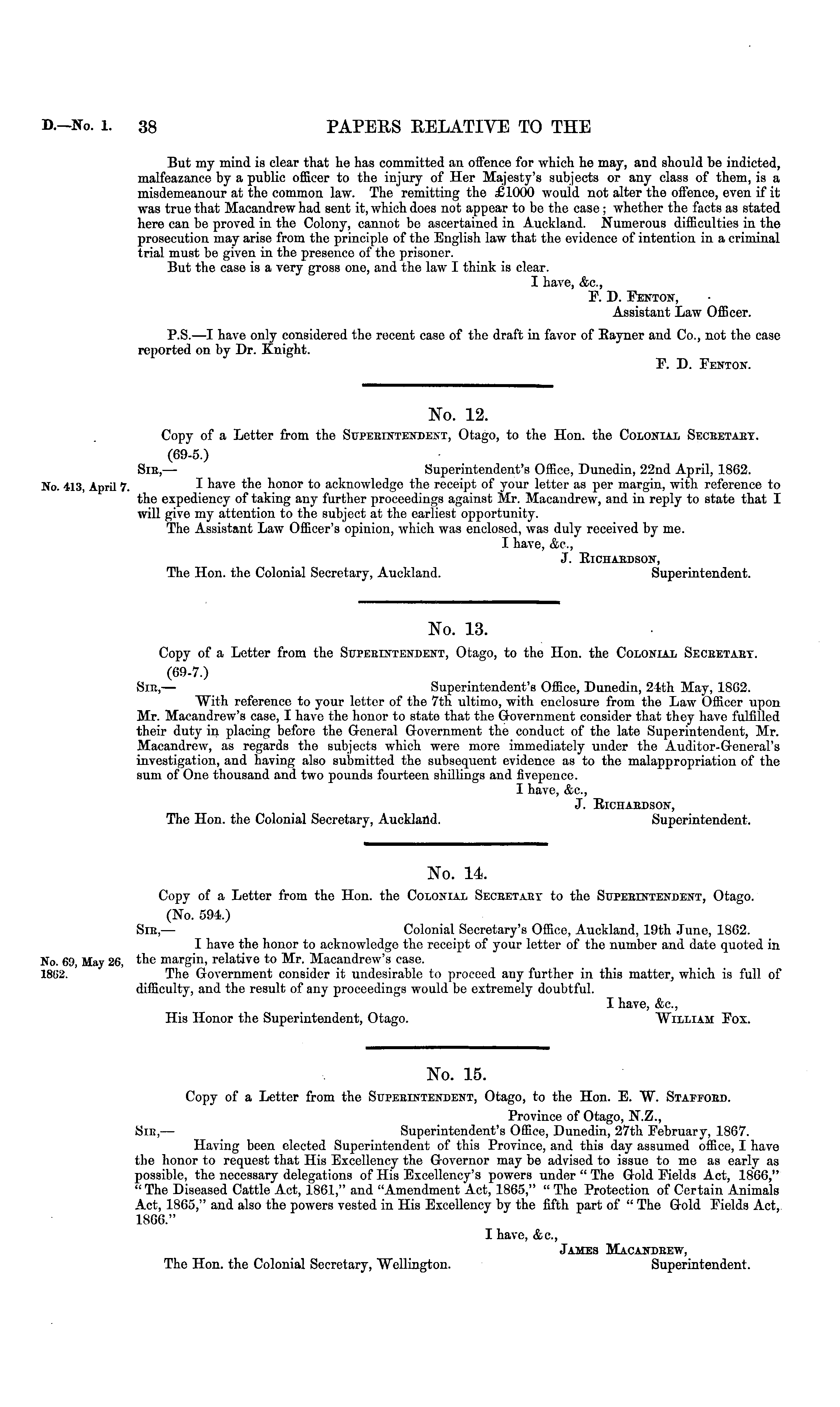 But my mind is clear that he has committed an offence for which he may, and should be indicted, malfeazance by a public officer to the injury of Her Majesty's subjects or any class of them, is a misdemeanour at the common law. The remitting the £1000 would not alter the offence, even if it was true that Macandrew had sent it, which does not appear to be the case; whether the facts as stated here can be proved in the Colony, cannot be ascertained in Auckland. Numerous difficulties in the prosecution may arise from the principle of the English law that the evidence of intention in a criminal trial must be given in the presence of the prisoner. But the case is a very gross one, and the law I think is clear. I have, &c, F. D. Fenton, Assistant Law Officer. P.S. —I have only considered the recent case of the draft in favor of Eayner and Co., not the case reported on by Dr. Knight. F. D. Fenton.