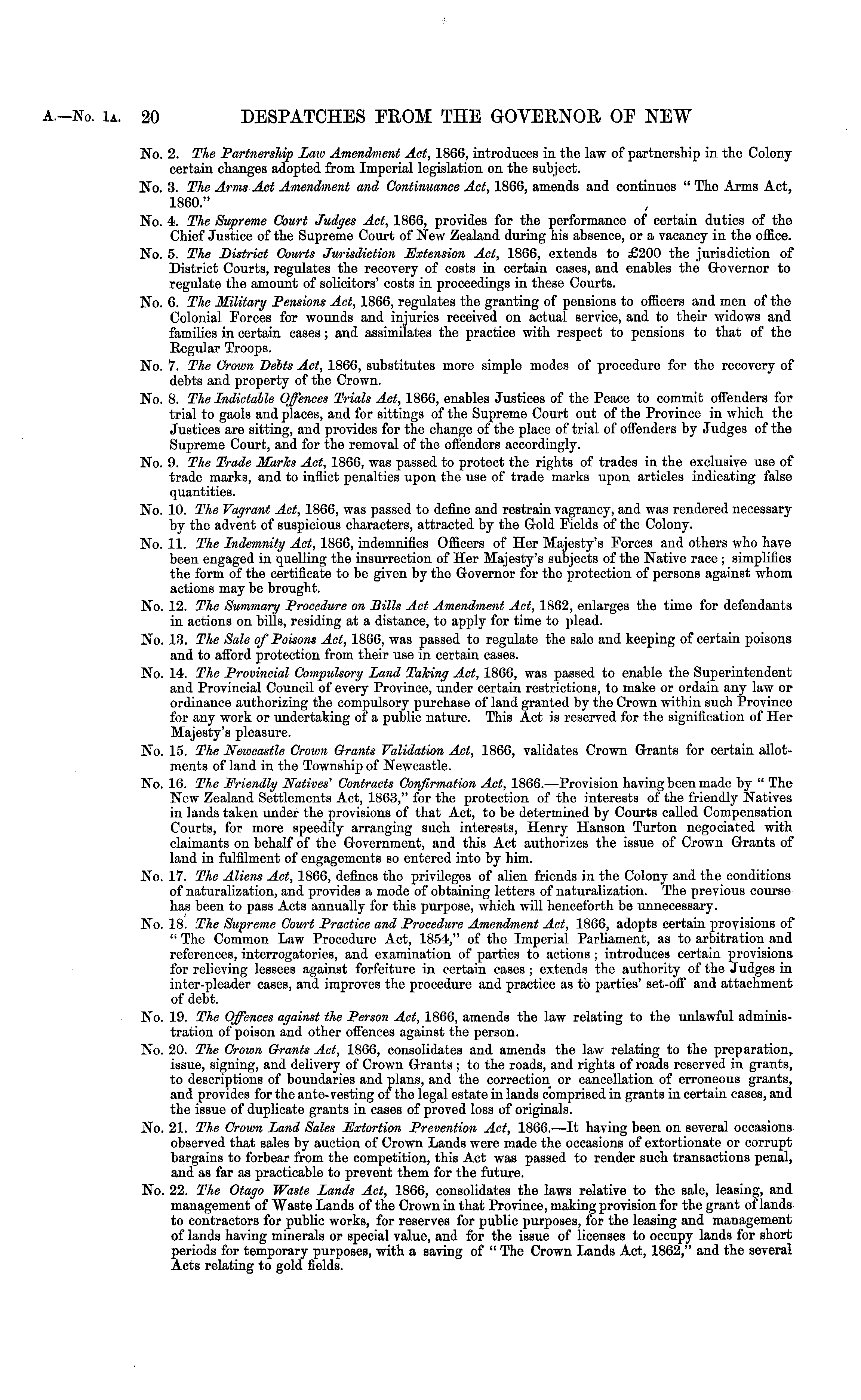 No. 2. The Partnership Law Amendment Act, 1866, introduces in the law of partnership in the Colony certain changes adopted from Imperial legislation on the subject. No. 3. The Arms Act Amendment and Continuance Act, 1866, amends and continues " The Arms Act, 1860." No. 4. The Supreme Court Judges Act, 1866, provides for the performance of certain duties of the Chief Justice of the Supreme Court of New Zealand during his absence, or a vacancy in the office. No. 5. The District Courts Jurisdiction Extension Act, 1866, extends to £200 the jurisdiction of District Courts, regulates the recovery of costs in certain cases, and enables the Governor to regulate the amount of solicitors' costs in proceedings in these Courts. No. 6. The Military Pensions Act, 1866, regulates the granting of pensions to officers and men of the Colonial Forces for wounds and injuries received on actual service, and to their widows and families in certain cases; and assimilates the practice with respect to pensions to that of the Begular Troops. No. 7. The Crown Debts Act, 1866, substitutes more simple modes of procedure for the recovery of debts and property of the Crown. No. 8. The Indictable Offences Trials Act, 1866, enables Justices of the Beace to commit offenders for trial to gaols and places, and for sittings of the Supreme Court out of the Province in which the Justices are sitting, and provides for the change of the place of trial of offenders by Judges of the Supreme Court, and for the removal of the offenders accordingly. No. 9. The Trade Marks Act, 1866, was passed to protect the rights of trades in the exclusive use of trade marks, and to inflict penalties upon the use of trade marks upon articles indicating false quantities. No. 10. The Vagrant Act, 1866, was passed to define and restrain vagrancy, and was rendered necessary by the advent of suspicious characters, attracted by the Gold Fields of the Colony. No. 11. The Indemnity Act, 1866, indemnifies Officers of Her Majesty's Forces and others who have been engaged in quelling the insurrection of Her Majesty's subjects of the Native race ; simplifies the form of the certificate to be given by the Governor for the protection of persons against whom actions may be brought. No. 12. The Summary Procedure on Bills Act Amendment Act, 1862, enlarges the time for defendants in actions on bills, residing at a distance, to apply for time to plead. No. 13. The Sale of Poisons Act, 1866, was passed to regulate the sale and keeping of certain poisons and to afford protection from their use in certain cases. No. 14. The Provincial Compulsory Land Taking Act, 1866, was passed to enable the Superintendent and Provincial Council of every Province, under certain restrictions, to make or ordain any law or ordinance authorizing the compulsory purchase of land granted by the Crown within sueh Province for any work or undertaking of a public nature. This Act is reserved for the signification of Her Majesty's pleasure. No. 15. The Newcastle Crown Grants Validation Act, 1866, validates Crown Grants for certain allotments of land in the Township of Newcastle. No. 16. The Friendly Natives'1 Contracts Confirmation Act, 1866. —-Provision having been made by " The New Zealand Settlements Act, 1863," for the protection of the interests of the friendly Natives in lands taken under the provisions of that Act, to be determined by Courts called Compensation Courts, for more speedily arranging such interests, Henry Hanson Turton negociated with claimants on behalf of the Government, and this Act authorizes the issue of Crown Grants of land in fulfilment of engagements so entered into by him. No. 17. The Aliens Act, 1866, defines the privileges of alien friends in the Colony and the conditions of naturalization, and provides a mode of obtaining letters of naturalization. The previous course has been to pass Acts annually for this purpose, which will henceforth be unnecessary. No. 18. The Supreme Court Practice and Procedure Amendment Act, 1866, adopts certain provisions of " The Common Law Procedure Act, 1854," of the Imperial Parliament, as to arbitration and references, interrogatories, and examination of parties to actions ; introduces certain provisions for relieving lessees against forfeiture in certain cases ; extends the authority of the Judges in inter-pleader cases, and improves the procedure and practice as to parties' set-off and attachment of debt. No. 19. The Offences against the Person Act, 1866, amends the law relating to the unlawful administration of poison and other offences against the person. No. 20. The Crown Grants Act, 1866, consolidates and amends the law relating to the preparation, issue, signing, and delivery of Crown Grants ; to the roads, and rights of roads reserved in grants, to descriptions of boundaries and plans, and the correction or cancellation of erroneous grants, and provides for the ante-vesting of the legal estate in lands comprised in grants in certain cases, and the issue of duplicate grants in cases of proved loss of originals. No. 21. The Croion Land Sales Extortion Prevention Act, 1866. —It having been on several occasions observed that sales by auction of Crown Lands were made the occasions of extortionate or corrupt bargains to forbear from the competition, this Act was passed to render such transactions penal, and as far as practicable to prevent them for the future. No. 22. The Otago Waste Lands Act, 1866, consolidates the laws relative to the sale, leasing, and management of Waste Lands of the Crown in that Province, making provision for the grant of lands to Contractors for public works, for reserves for public purposes, for the leasing and management of lands having minerals or special value, and for the issue of licenses to occupy lands for short periods for temporary purposes, with a saving of " The Crown Lands Act, 1862," and the several Acts relating to gold fields.