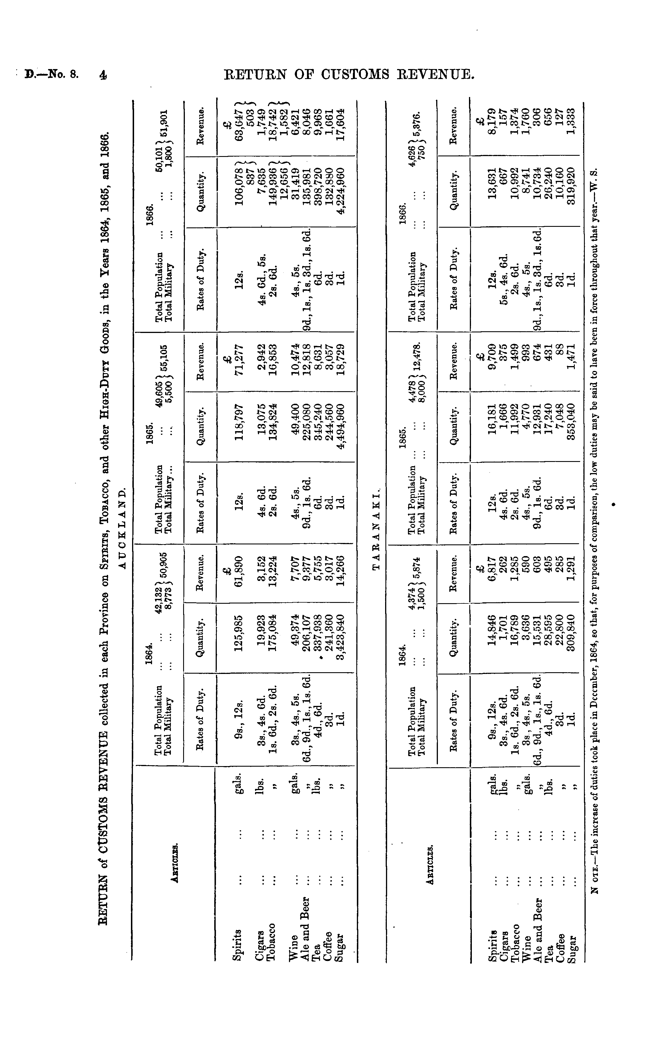 RETURN of CUSTOMS REVENUE collected in each Colony Province on SPIRITS, TOBACCO, and other HIGH-DUTY GOODS, in the Years 1864, 1865, and 1866. AUCKLAND.
