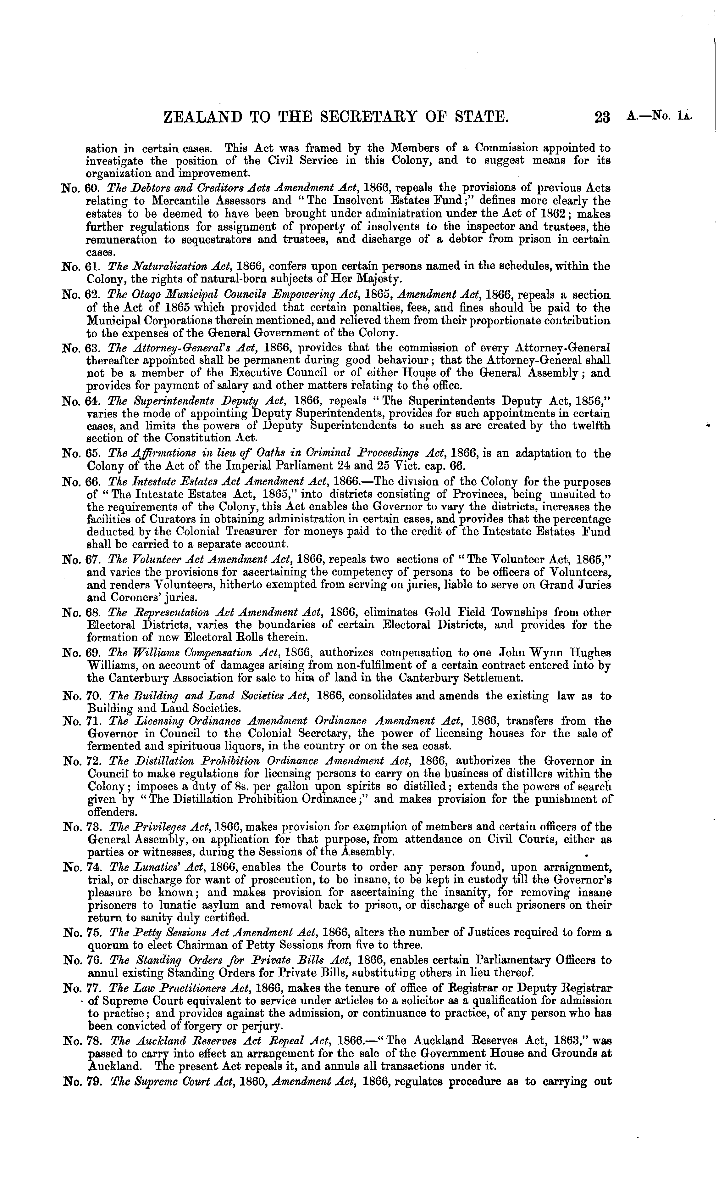 sation in certain cases. This Act was framed by the Members of a Commission appointed to investigate the position of the Civil Service in this Colony, and to suggest means for its organization and improvement. No. 60. The Debtors and Creditors Acts Amendment Act, 1866, repeals the provisions of previous Acts relating to Mercantile Assessors and " The Insolvent Estates Fund;" defines more clearly the estates to be deemed to have been brought under administration under the Act of 1862 ; makes further regulations for assignment of property of insolvents to the inspector and trustees, the remuneration to sequestrators and trustees, and discharge of a debtor from prison in certain cases. No. 61. The Naturalization Act, 1866, confers upon certain persons named in the schedules, within the Colony, the rights of natural-born subjects of Her Majesty. No. 62. The Otago Municipal Councils Empowering Act, 1865, Amendment Act, 1866, repeals a section of the Act of 1865 which provided that certain penalties, fees, and fines should be paid to the Municipal Corporations therein mentioned, and relieved them from their proportionate contribution to the expenses of the General Government of the Colony. No. 63. The Attorney-General's Act, 1866, provides that the commission of every Attorney-General thereafter appointed shall be permanent during good behaviour; that the Attorney-General shall not be a member of the Executive Council or of either House of the General Assembly ; and provides for payment of salary and other matters relating to the office. No. 64. The Superintendents Deputy Act, 1866, repeals " The Superintendents Deputy Act, 1856," varies the mode of appointing Deputy Superintendents, provides for such appointments in certain cases, and limits the powers of Deputy Superintendents to such as are created by the twelfth section of the Constitution Act. No. 65. The Affirmations in lieu of Oaths in Criminal Proceedings Act, 1866, is an adaptation to the Colony of the Act of the Imperial Parliament 24 and 25 Vict. cap. 66. No. 66. The Intestate Estates Act Amendment Act, 1866. —The division of the Colony for the purposes of " The Intestate Estates Act, 1865," into districts consisting of Provinces, being unsuited to the requirements of the Colony, this Act enables the Governor to vary the districts, increases the facilities of Curators in obtaining administration in certain cases, and provides that the percentage deducted by the Colonial Treasurer for moneys paid to the credit of the Intestate Estates Fund shall be carried to a separate account. No. 67. The Volunteer Act Amendment Act, 1866, repeals two sections of " The Volunteer Act, 1865," and varies the provisions for ascertaining the competency of persons to be officers of Volunteers, and renders Volunteers, hitherto exempted from serving on juries, liable to serve on Grand Juries and Coroners' juries. No. 68. The Eepresentation Act Amendment Act, 1866, eliminates Gold Field Townships from other Electoral Districts, varies the boundaries of certain Electoral Districts, and provides for the formation of new Electoral Bolls therein. No. 69. The Williams Compensation Act, 1866, authorizes compensation to one John Wynn Hughes Williams, on account of damages arising from non-fulfilment of a certain contract entered into by the Canterbury Association for sale to him of land in the Canterbury Settlement. No. 70. The Building and Land Societies Act, 1866, consolidates and amends the existing law as to Building and Land Societies. No. 71. The Licensing Ordinance Amendment Ordinance Amendment Act, 1866, transfers from the Governor in Council to the Colonial Secretary, the power of licensing houses for the sale of fermented and spirituous liquors, in the country or on the sea coast. No. 72. The Distillation Prohibition Ordinance Amendment Act, 1866, authorizes the Governor in Council to make regulations for licensing persons to carry on the business of distillers within the Colony; imposes a duty of Bs. per gallon upon spirits so distilled; extends the powers of search given by " The Distillation Prohibition Ordinance;" and makes provision for the punishment of offenders. No. 73. The Privileges Act, 1866, makes provision for exemption of members and certain officers of the General Assembly, on application for that purpose, from attendance on Civil Courts, either as parties or witnesses, during the Sessions of the Assembly. No. 74. The Lunatics' Act, 1866, enables the Courts to order any person found, upon arraignment, trial, or discharge for want of prosecution, to be insane, to be kept in custody till the Governor's pleasure be known; and makes provision for ascertaining the insanity, for removing insane prisoners to lunatic asylum and removal back to prison, or discharge of such prisoners on their return to sanity duly certified. No. 75. The Petty Sessions Act Amendment Act, 1866, alters the number of Justices required to form a quorum to elect Chairman of Petty Sessions from five to three. No. 76. The Standing Orders for Private Bills Act, 1866, enables certain Parliamentary Officers to annul existing Standing Orders for Private Bills, substituting others in lieu thereof. No. 77. The Law Practitioners Act, 1866, makes the tenure of office of Begistrar or Deputy Begistrar of Supreme Court equivalent to service under articles to a solicitor as a qualification for admission to practise; and provides against the admission, or continuance to practice, of any person who has been convicted of forgery or perjury. No. 78. The Auckland Eeserves Act Eepeal Act, 1866.—" The Auckland Beserves Act, 1863," was passed to carry into effect an arrangement for the sale of tho Government House and Grounds at Auckland. The present Act repeals it, and annuls all transactions under it. No. 79. The Supreme Court Act, 1860, Amendment Act, 1866, regulates procedure as to carrying out