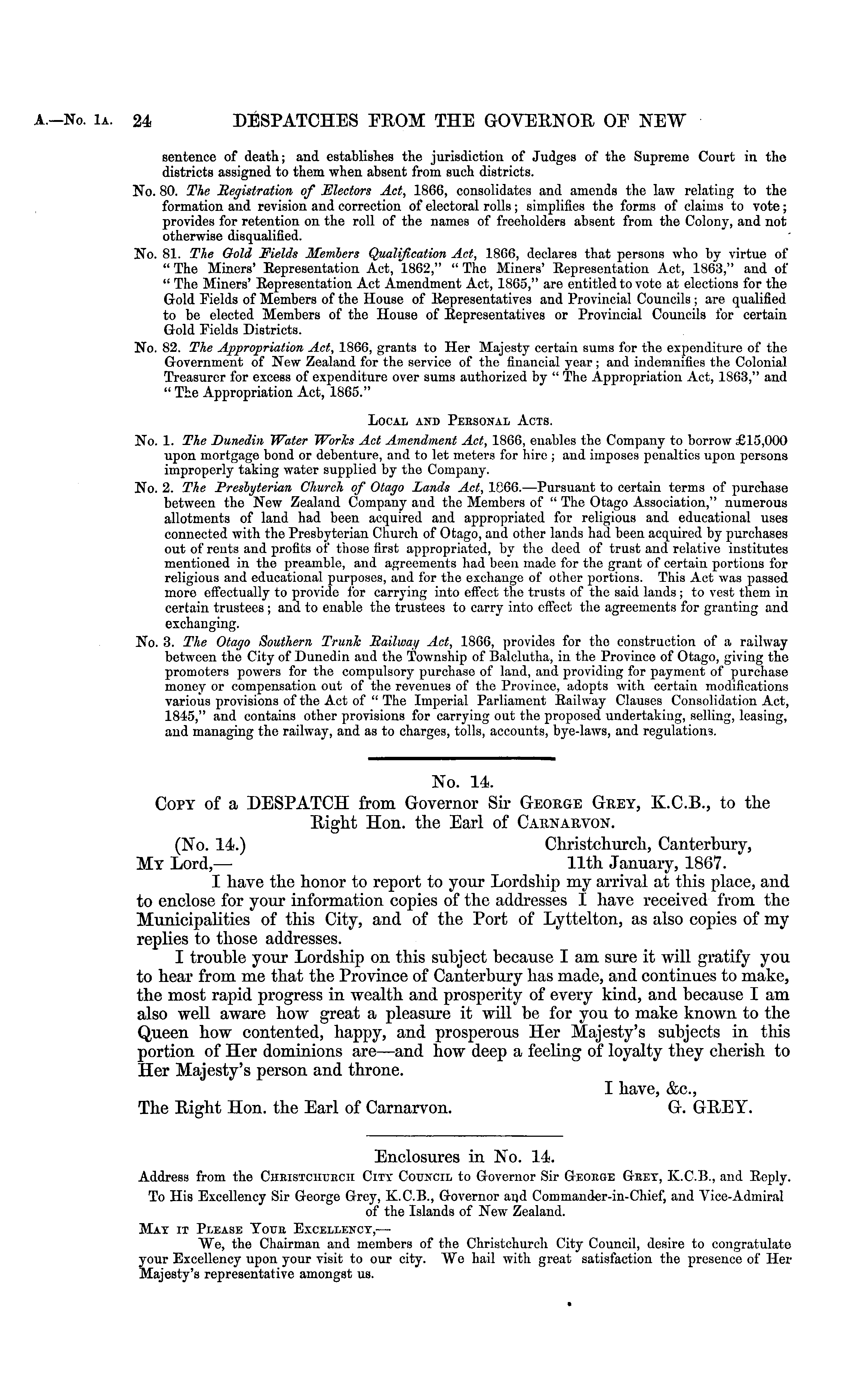 No. 14. Copy of a DESPATCH from Governor Sir George Grey, K.C.8., to the Right Hon. the Earl of Carnarvon. (No. 14.) Christchurch, Canterbury, My Lord, — 11th January, 1867. I have the honor to report to your Lordship my arrival at this place, and to enclose for your information copies of the addresses I have received from the MunicipaHties of this City, and of the Port of Lyttelton, as also copies of my replies to those addresses. I trouble your Lordship on this subject because I am sure it will gratify you to hear from me that the Province of Canterbury has made, and continues to make, the most rapid progress in wealth and prosperity of every kind, and because I am also well aware how great a pleasure it will be for you to make known to the Queen how contented, happy, and prosperous Her Majesty's subjects in this portion of Her dominions are—and how deep a feeling of loyalty they cherish to Her Majesty's person and throne. I have, &c, The Right Hon. the Earl of Carnarvon. G. GREY.