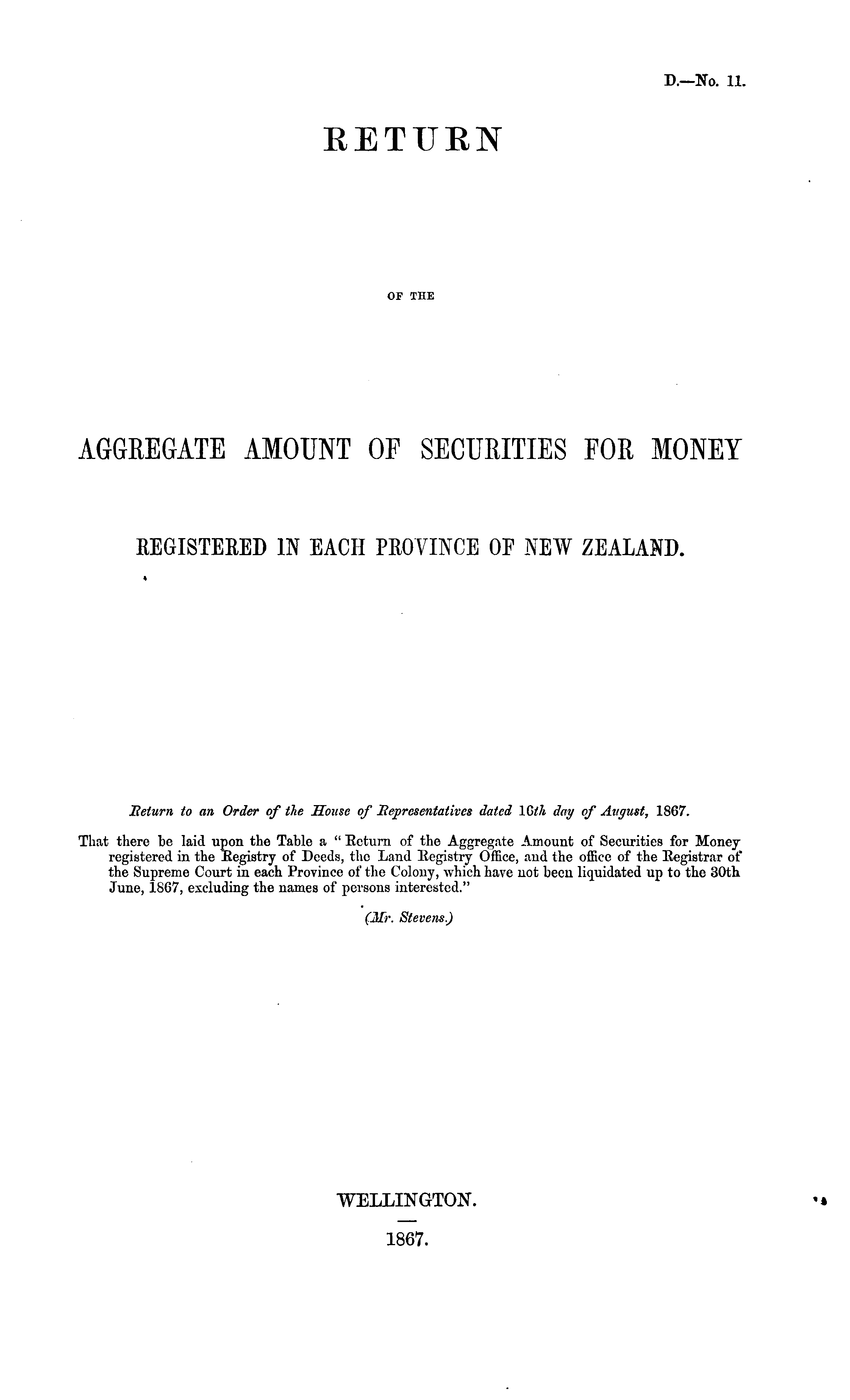 Eclum to an Order of the House of Bepresentatives dated lGth day of August, 1867. That there be laid upon the Table a " Return of the Aggregate Amount of Securities for Money registered in the Begistry of Deeds, the Land Begistry Office, and the office of the Begistrar of the Supreme Court in each Province of the Colony, which have not been liquidated up to the 30th June, 1867, excluding the names of persons interested." (Mr. Stevens.)