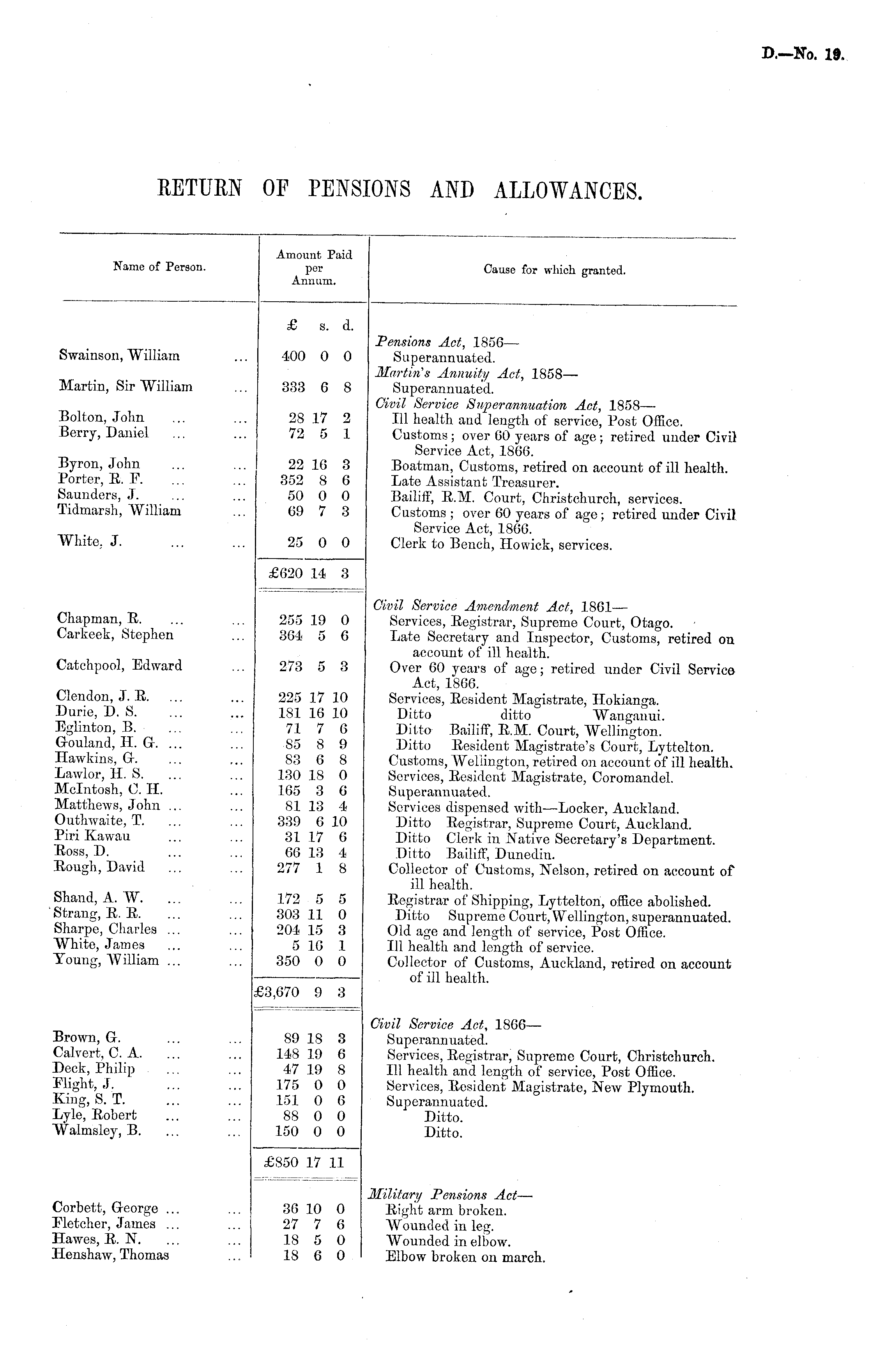 Name of Person. Amount Paid per Annum. Cause for which granted. £ S. d. Swainson, William Martin, Sir William Bolton, John Berry, Daniel Byron, John Porter, R. F. Saunders, J. Tidmarsh, William 400 0 0 333 6 8 28 17 2 72 5 1 22 16 3 352 8 6 50 0 0 69 7 3 Pensions Act, 1856— Superannuated. Martin's Annuity Act, 1858 — Superannuated. Civil Service Superannuation Act, 1858— 111 health and length of service, Post Office. Customs ; over 60 years of age ; retired under Civil Service Act, 1866. Boatman, Customs, retired on account of ill health. Late Assistant Treasurer. Bailiff, R.M. Court, Christchurch, services. Customs ; over 60 years of age; retired under Civil Service Act, 1866. Clerk to Bench, Howick, services. "White, J. 25 0 0 £620 14 3 Chapman, R. Carkeek, Stephen Catchpool, Edward Clendon, J. R. Durie, D. S. Eglinton, B. Gouland, H. G. ... Hawkins, G Lawlor, II. S. Mcintosh, C. H. Matthews, John ... Outhwaite, T. Piri Kawau Ross, D. Rough, David 255 19 0 364 5 6 273 5 3 225 17 10 181 16 10 71 7 6 85 8 9 83 6 8 130 18 0 165 3 6 81 13 4 339 6 10 31 17 0 66 13 4 277 1 S Civil Service Amendment Act, 1861— Services, Registrar, Supreme Court, Otago. Late Secretary and Inspector, Customs, retired on account of ill health. Over 60 years of age; retired under Civil Service Act, 1866. Services, Resident Magistrate, Hokianga. Ditto ditto Wanganui. Ditto Bailiff, R.M. Court, Wellington. Ditto Resident Magistrate's Court, Lyttelton. Customs, Wellington, retired on account of ill health. Services, Resident Magistrate, Coromandel. Superannuated. Services dispensed with —Locker, Auckland. Ditto Registrar, Supreme Court, Auckland. Ditto Cleric in Native Secretary's Department. Ditto Bailiff, Dunedin. Collector of Customs, Nelson, retired on account of ill health. Registrar of Shipping, Lyttelton, office abolished. Ditto Supreme Court, Wellington, superannuated. Old age and length of service, Post Office. Ill health and length of service. Collector of Customs, Auckland, retired on account of ill health. Shand, A. W. ... Strang, R. R. Sharpe, Charles ... White, James Voung, William ... 172 5 5 303 11 0 204 15 3 5 10 1 350 0 0 £3,670 9 3 Brown, G. Calvert, C. A. ... Deck, Philip Flight, J. King, S. T. Lyle, Robert Walmsley, B. 89 18 148 19 47 19 175 0 151 0 88 0 150 0 3 6 8 0 6 0 0 Civil Service Act, 1866—• Superannuated. Services, Registrar, Supreme Court, Christchurch. Ill health and length of service, Post Office. Services, Resident Magistrate, New Plymouth. Superannuated. Ditto. Ditto. £850 17 11 Military Pensions Act — Right arm broken. Wounded in leg. Wounded in elbow. Elbow broken on march. Corbett, George ... Fletcher, James ... Hawes, R. N. Henshaw, Thomas 36 10 0 27 7 6 18 5 0 18 6 0