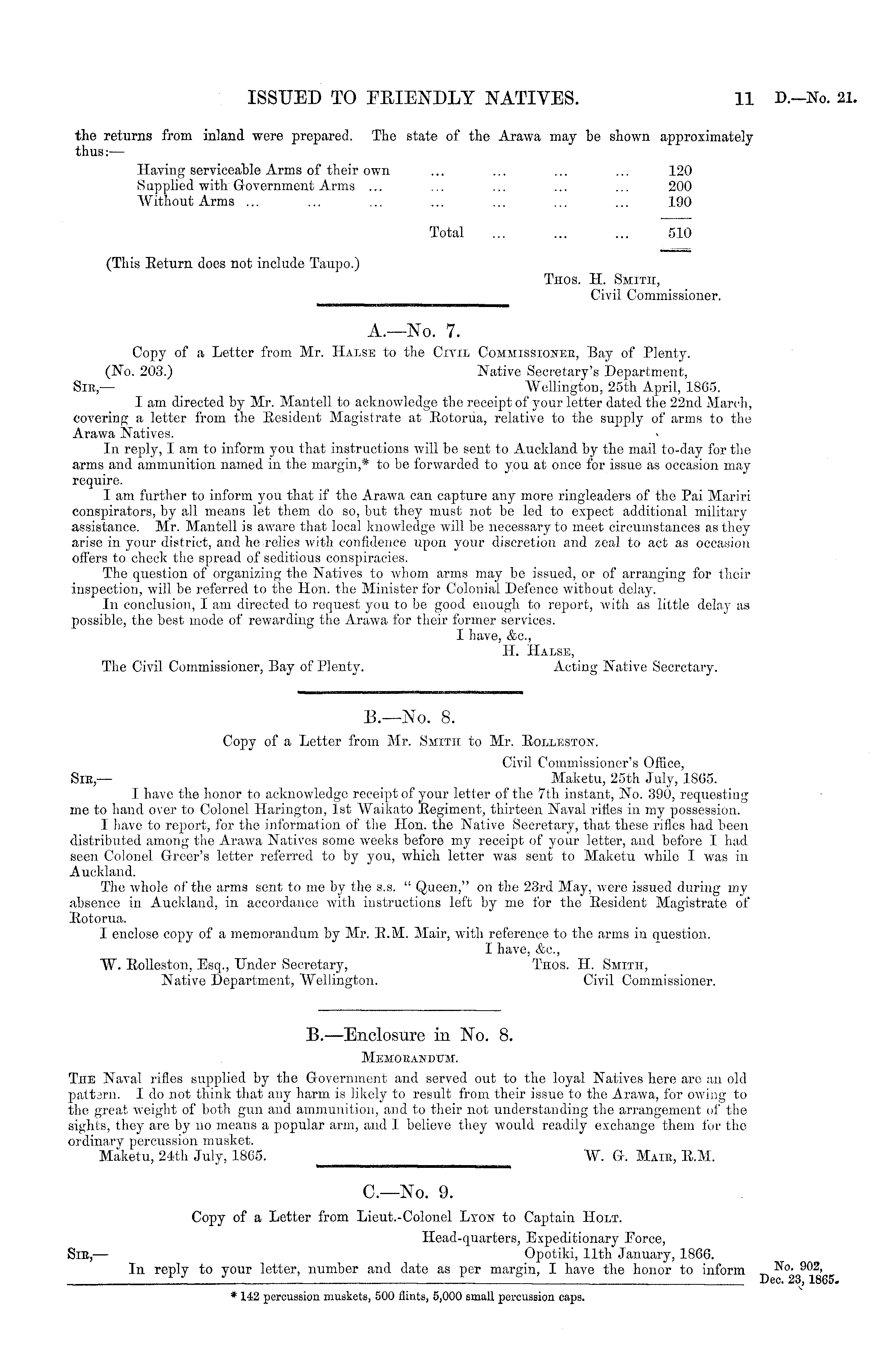 B.—No. 8. Copy of a Letter from Mr. Smith to Mr. Rolleston. Civil Commissioner's Office, Sir,— Maketu, 25th July, 1865. I have the honor to acknowledge receipt of your letter of tho 7th instant, No. 390, requesting me to hand over to Colonel Harington, Ist Waikato Regiment, thirteen Naval rifles in my possession. I have to report, for the information of the Hon. the Native Secretary, that these rifles had been distributed among the Arawa Natives some weeks before my receipt of your letter, and before I had seen Colonel Greer's letter referred to by you, which letter was sent to Maketu while I was in Auckland. The whole of the arms sent to me by the s.s. " Queen," on the 23rd May, were issued during my absence in Auckland, in accordance with instructions left by me for the Resident Magistrate of Rotorua. I enclose copy of a memorandum by Mr. R.M. Mair, with reference to tho arms in question. I have, &c, W. Rolleston, Esq., Under Secretary, Thos. H. Smith, Native Department, Wellington. Civil Commissioner.