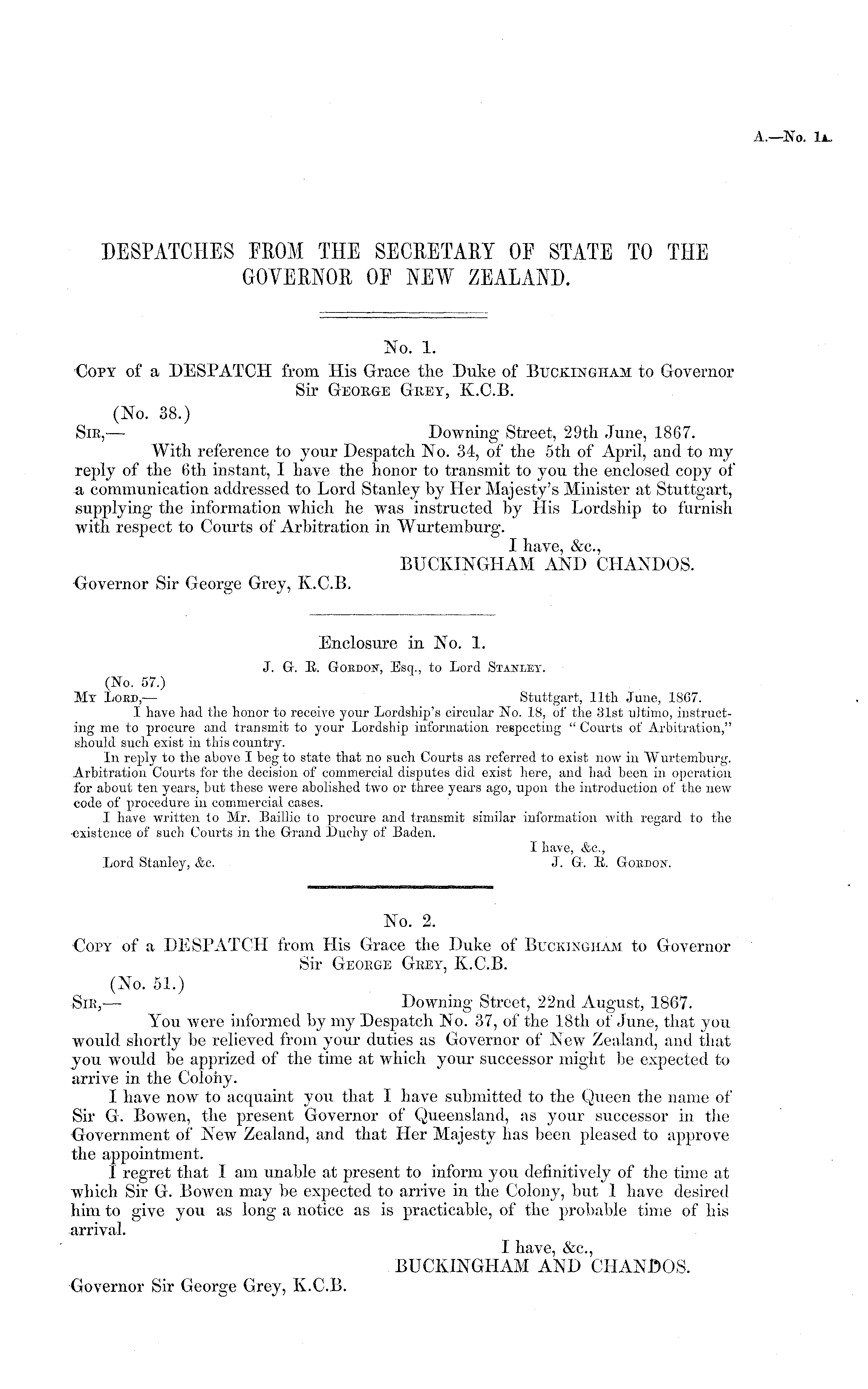 No. 1. Copy of a DESPATCH from His Grace the Duke of Buckingham to Governor Sir George Grey, K.C.B. (No. 38.) Sib, — Downing Street, 29th June, 1867. With reference to your Despatch No. 34, of the sth of April, and to my reply of the 6th instant, I have the honor to transmit to you the enclosed copy of a communication addressed to Lord Stanley by Her Majesty's Minister at Stuttgart, supplying the information which he was instructed by His Lordship to furnish with respect to Courts of Arbitration in Wurtemburg. I have, &c, BUCKINGHAM AND CHANDOS. Governor Sir George Grey, K.C.B.
