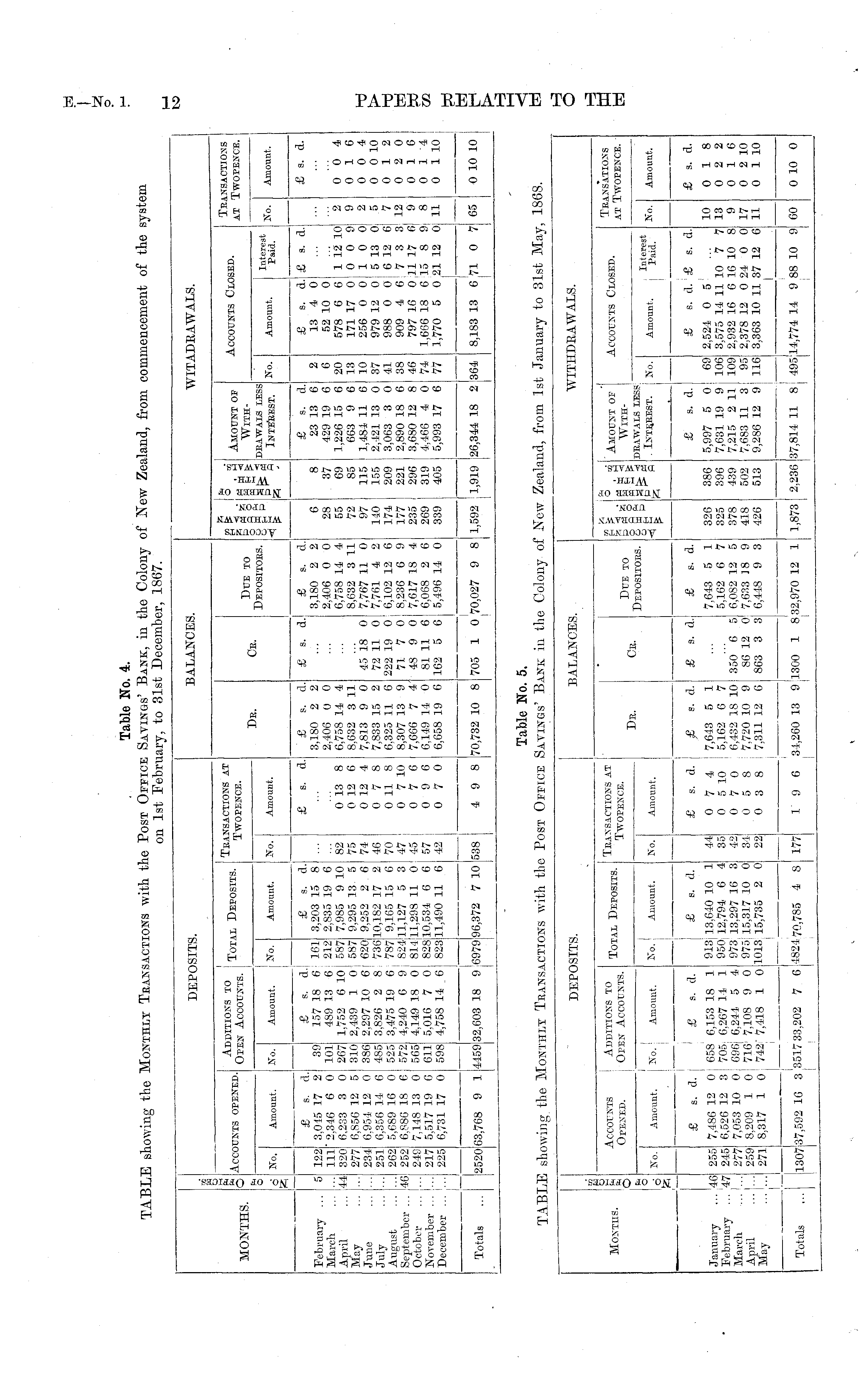 Table No. 4. TABLE showing the MONTHLY TRANSACTIONS with the POST OFFICE SAVINGS' BANK, in the Colony of New Zealand, from commencement of the system on 1st February, to 31st December, 1867.