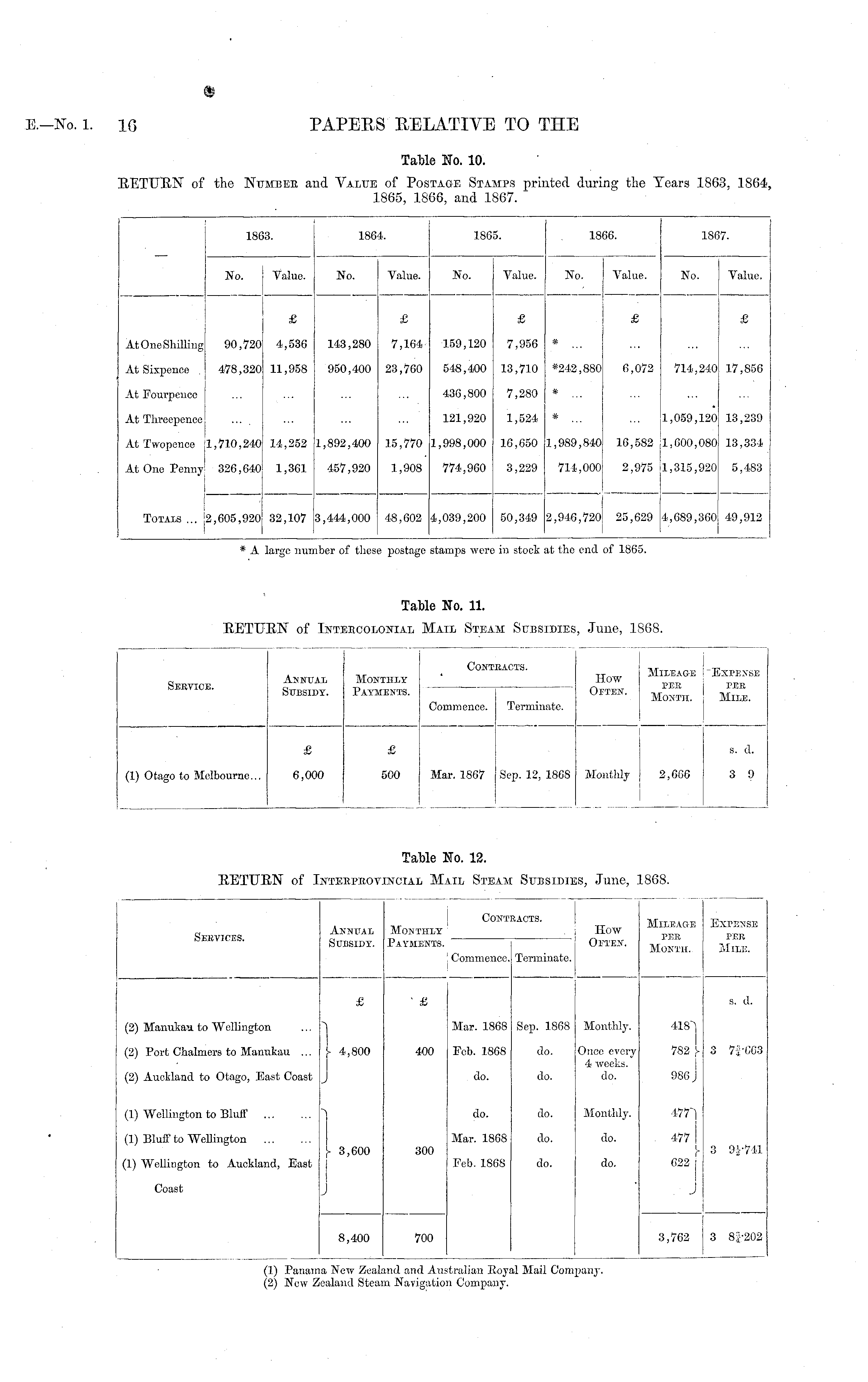 Cont: tACTS. Service. Annual Subsidy. Monthly Payments. How Oeten. Mileage per Month. Expense PER Mile. : Commence. Terminate. ■ £ £ Mar. 1867 Sep. 12, 1868 Monthly 2,666 s. a. (1) Otago to Melbourne... 6,000 500 3 9