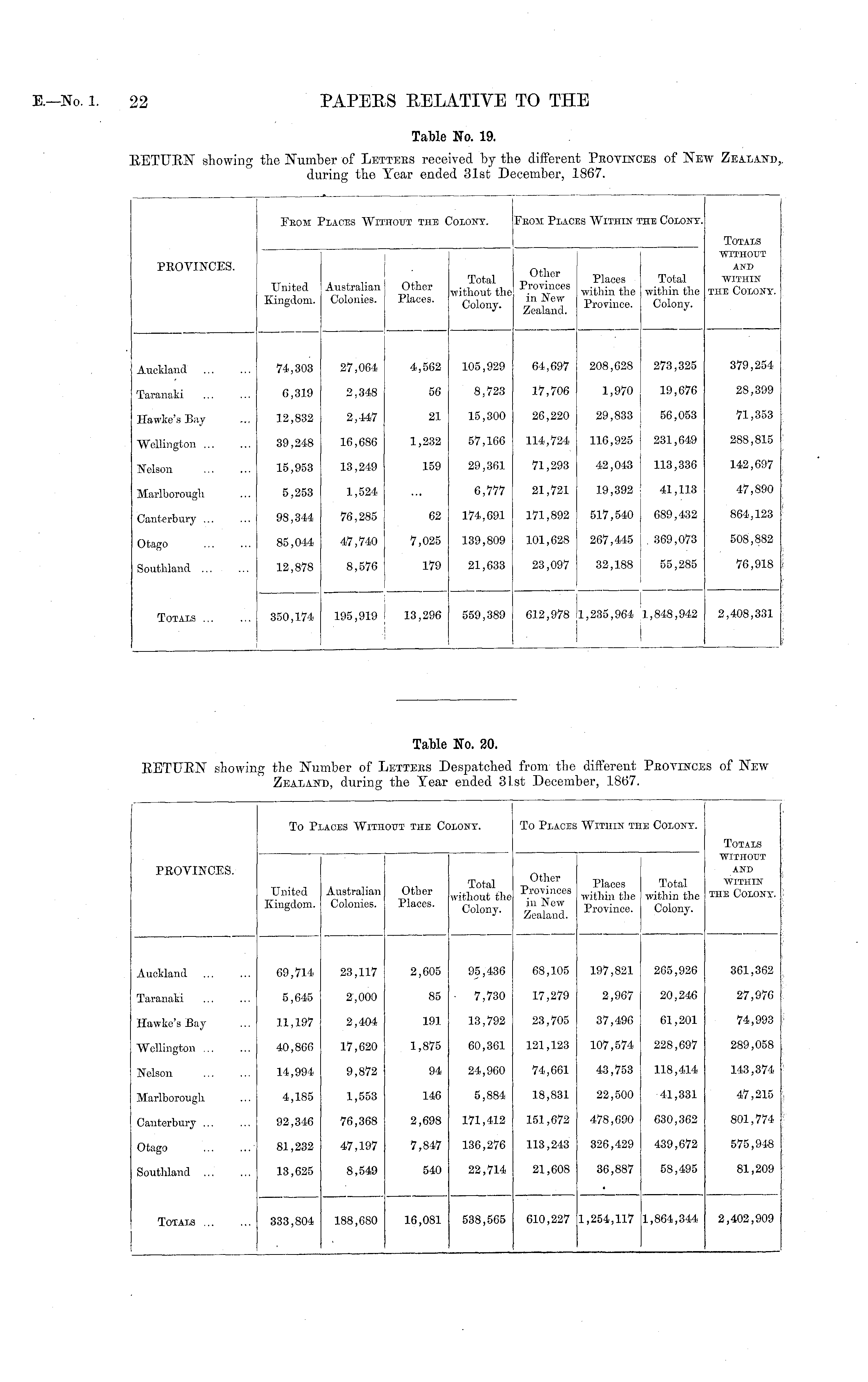 Table No. 20. RETURN showing the Number of LETTERS DESPATCHED from the different PROVINCES of NEW ZEALAND, during the Year ended 31st December, 1867.
