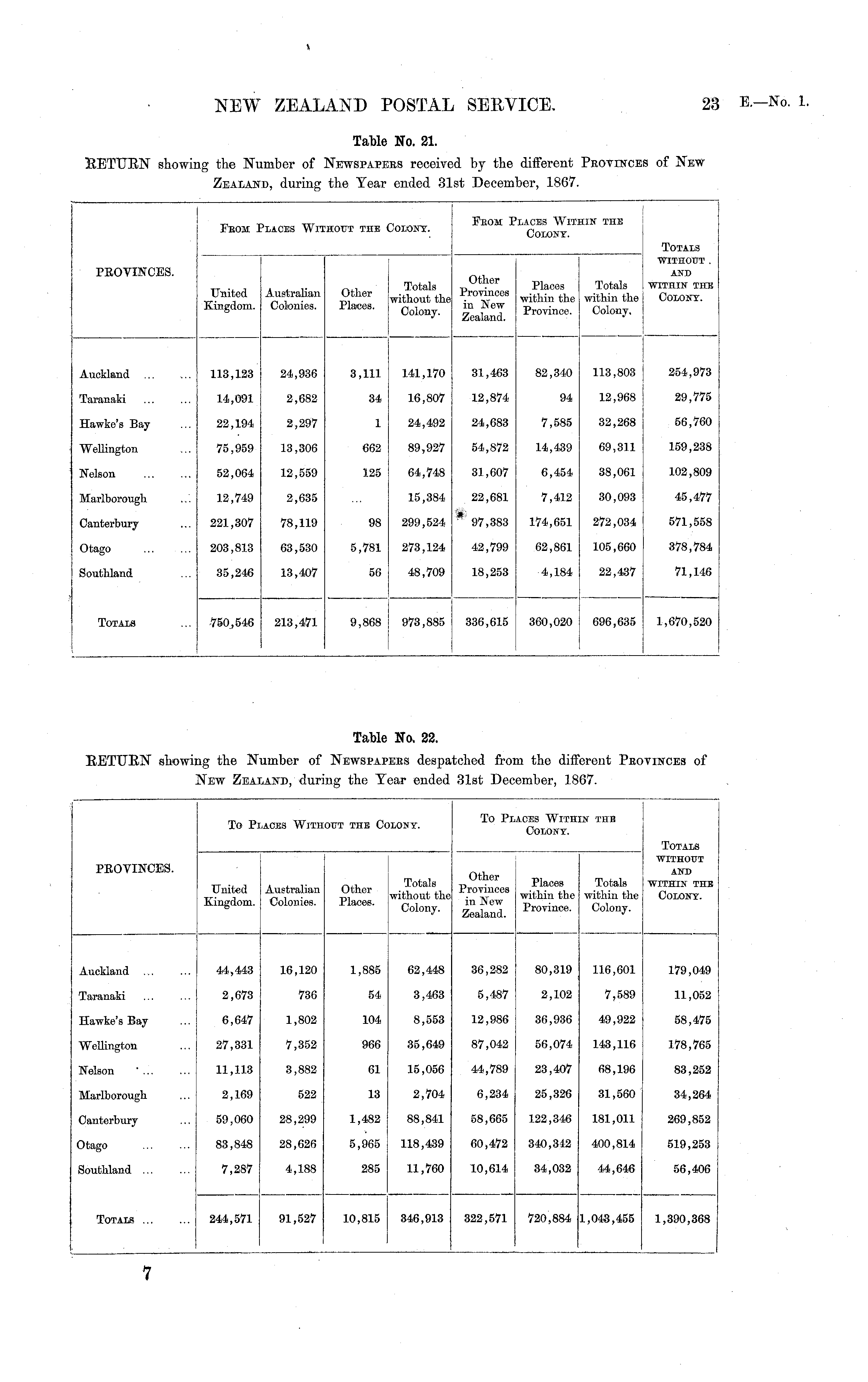 Table No. 22. RETURN showing the Number of NEWSPAPERS despatched from the different PROVINCES of NEW ZEALAND, during the Year ended 31st December, 1867.