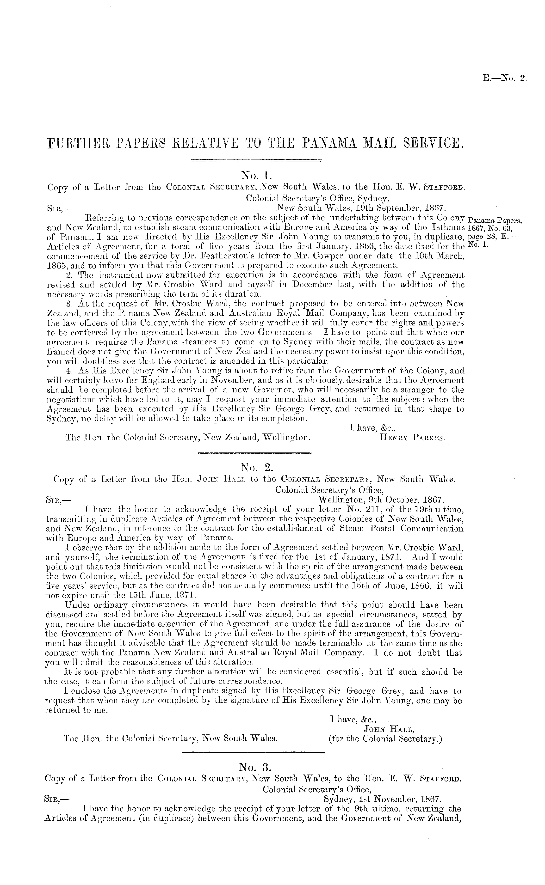 No. 1. Copy of a Letter from the Colonial Secbetaey, New South Wales, to the Hon. E. W. Staepobd. Colonial Secretary's Office, Sydney, Sir,— New South Wales, 19th September, 1867. Referring to previous correspondence on the subject of the undertaking between this Colony and New Zealand, to establish steam communication with Europe and America by way of the Isthmus of Panama, I am now directed by His Excellency Sir John Young to transmit to you, in duplicate, Articles of Agreement, for a term of five years from the first January, 1866, the date fixed for the commencement of the service by Dr. Eeatherston's letter to Mr. Cowper under date the 10th March, 1865, and to inform you that this Government is prepared to execute such Agreement. 2. The instrument now submitted for execution is in accordance with the form of Agreement revised and settled by Mr. Crosbie Ward and myself in December last, with the addition of the necessary words prescribing the term of its duration. 3. At the request of Mr. Crosbie Ward, the contract proposed to be entered into between New Zealand, and the Panama New Zealand and Australian Royal Mail Company, has been examined by the law officers of this Colony,with the view of seeing whether it will fully cover the rights and powers to be conferred by the agreement between the two Governments. I have to point out that while our agreement requires the Panama steamers to come on to Sydney with their mails, the contract as now framed does not give the Government of New Zealand the necessary power to insist upon this condition, you will doubtless see that the contract is amended in this particular. 4. As His Excellency Sir John Young is about to retire from tho Government of the Colony, and will certainly leave for England early in November, and as it is obviously, desirable that the Agreement should be completed before the arrival of a new Governor, who will necessarily be a stranger to the negotiations which have led to it, may I request your immediate attention to the subject; when the Agreement has been executed by His Excellency Sir George Grey, and returned in that shape to Sydney, no delay will be allowed to take place in its completion. I have, &c, The Hon. the Colonial Secretary, New Zealand, Wellington. Henry Paekes.