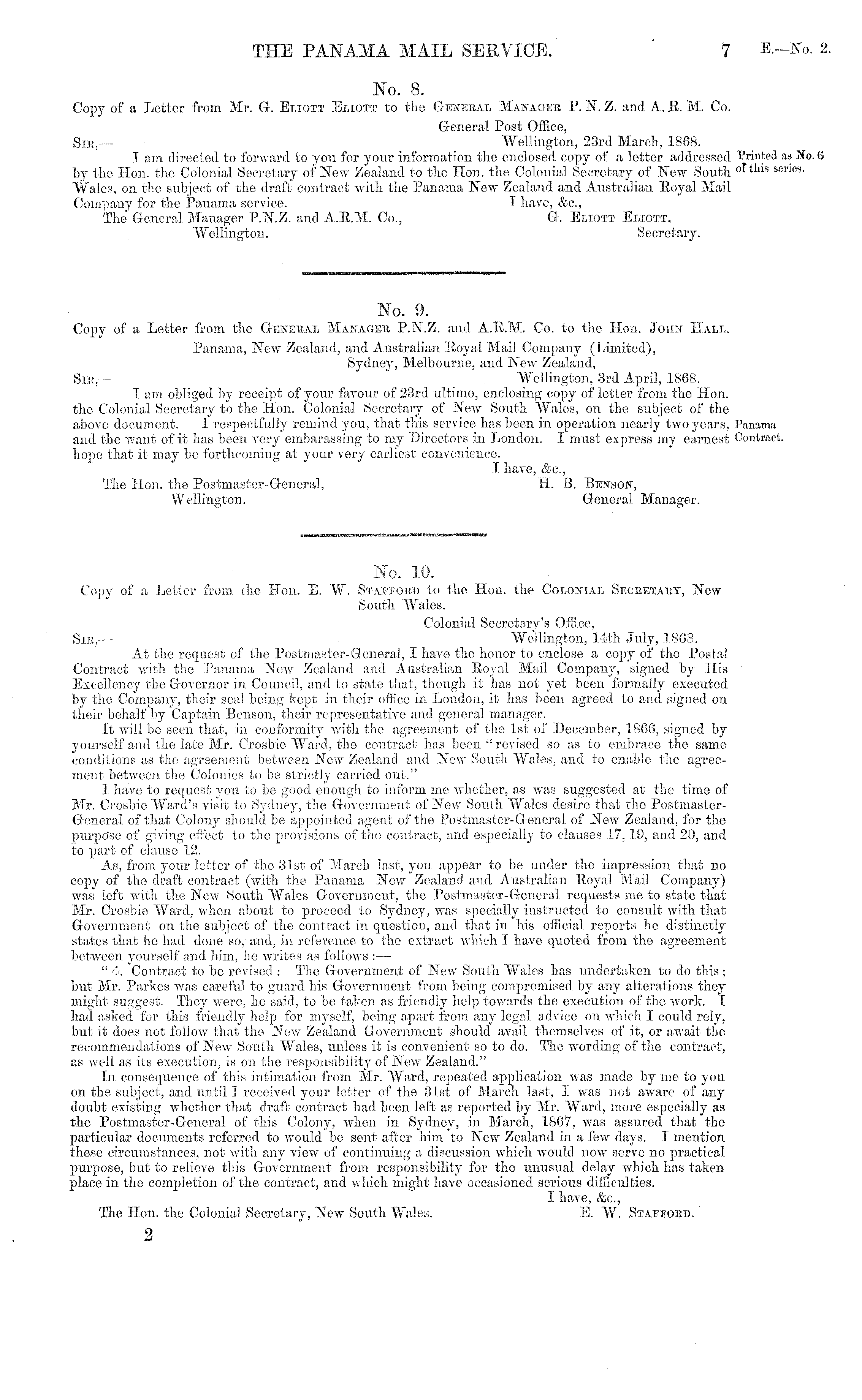 No. 8. Copy of a Letter from Mr. G. Eliott Eliott to the General Manager P. N. Z. and A. R. M. Co. General Post Office, Sir,— Wellington, 23rd March, 1868. I am directed to forward to you for your information the enclosed copy of a letter addressed by the Hon. the Colonial Secretary of Now Zealand to the Hon. the Colonial Secretary of New South Wales, on the subject of the draft contract with the Panama New Zealand and Australian Royal Mail Company for the Panama service. I have, &c, The General Manager P.N.Z. and A.R.M. Co., G. Eliott Eliott, Wellington. Secretary.