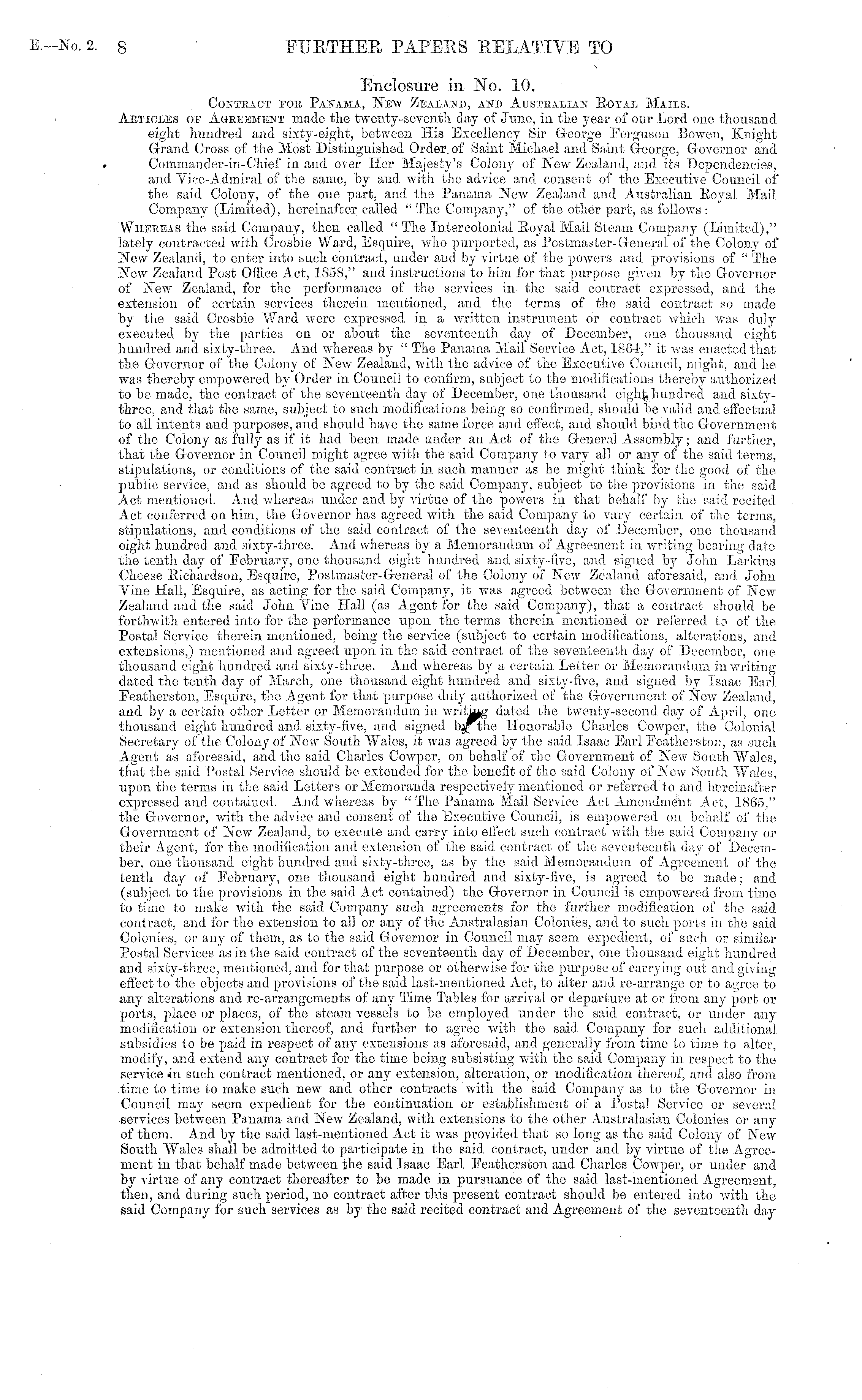 Enclosure in No. 10. Contract for Panama, New Zealand, and Australian Royal Mails. Articles of Agreement made the twenty-seventh day of June, in the year of our Lord one thousand eight hundred and sixty-eight, between His Excellency Sir George Ferguson Bowen, Knight Grand Cross of the Most Distinguished Order of Saint Michael and Saint George, Governor and Commander-in-Chief in and over Her Majesty's Colony of New Zealand, and its Dependencies, and Vice-Admiral of the same, by and with the advice and consent of the Executive Council of" the said Colony, of the one part, and the Panama New Zealand and Australian Royal Mail Company (Limited), hereinafter called " The Company," of the other part, as follows : Whereas the said Company, then called " Tho Intercolonial Royal Mail Steam Company (Limited)," lately contracted with Crosbie Ward, Esquire, who purported, as Postmaster-General of the Colony of New Zealand, to enter into such contract, under and by virtue of the powers and provisions of " The New Zealand Post Office Act, 1858," and instructions to him for that purpose given by the Governor of Isew Zealand, for the performance of tho services in the said contract expressed, and the extension of certain services therein mentioned, and the terms of the said contract so made by the said Crosbie Ward were expressed in a written instrument or contract which was duly executed by the parties on or about the seventeenth day of December, one thousand eight hundred and. sixty-three. And whereas by " The Panama Mail Service Act, 1864," it was enacted that the Governor of the Colony of New Zealand, with the advice of the Executive Council, might, and he was thereby empowered by Order in Council to confirm, subject to the modifications thereby authorized to bo made, the contract of the seventeenth day of December, one thousand eigh^hundred and sixtythree, and that the same, subject to such modifications being so confirmed, should Be valid and effectual to all intents and purposes, and. should have the same force and effect, and should bind the Government of the Colony as fully as if it had been made under an Act of tho General Assembly ; and further, that the Governor in Council might agree with the said Company to vary all or any of the said terms, stipulations, or conditions of the said contract in such manner as he might think for the good of the public service, and as should be agreed to by the said Company, subject to the provisions in the said Act mentioned. And whereas under and by virtue of the powers in that behalf by tho said recited Act conferred on him, the Governor has agreed witli the said Company to vary certain of the terms, stipulations, and conditions of the said contract of the seventeenth clay of December, one thousand eight hundred and sixty-three. And whereas by a Memorandum of Agreement in writing bearing date the tenth day of February, one thousand eight hundred and sixty-five, and signed by John Larking Cheese Richardson, Esquire, Postmaster-General of the Colony of New Zealand aforesaid, and John Vine Hall, Esquire, as acting for the said Company, it was agreed between the Government of New Zealand and the said John Vine Hall (as Agent for the said Company), that a contract should be forthwith entered into for the performance upon the terms therein mentioned or referred to of the Postal Service therein mentioned, being the service (subject to certain modifications, alterations, and extensions,) mentioned and agreed upon in the said contract of the seventeenth day of December, one thousand eight hundred and sixty-three. And whereas b}<" a certain Letter or Memorandum in writing dated the tenth day of March, one thousand eight hundred and sixty-five, and signed by Isaac Earl Eeatherston, Esquire, the Agent for that purpose duly authorized of the Government of New Zealand, and by a certain other Letter or Memorandum in writmg dated the twenty-second day of April, one thousand eight hundred and sixty-five, and signed h^the Honorable Charles Cowper, the Colonial. Secretary of the Colony of Now South Wales, it was agreed by the said Isaac Earl Featberston, as such Agent as aforesaid, and the said Charles Cowper, on behalf of the Government of New South Wales, that the said Postal Service should be extended for the benefit of the said Colony of New South Wales, upon the terms in the said Letters or Memoranda respectively mentioned or referred to and hereinafter expressed and contained. And whereas by " The Panama Mail Service Act Amendnwit Act, 1865," the Governor, with the advice and consent of the Executive Council, is empowered on behalf of the Government of New Zealand, to execute and carry into effect such contract with the said Company or their Agent, for the modification and extension of the said contract of the seventeenth day of December, one thousand eight hundred and sixty-three, as by tho said Memorandum of Agreement of tho tenth day of February, one thousand eight hundred and sixty-five, is agreed to bo made; and (subject to the provisions in the said Act contained) the Governor in Council is empowered from time to time to make with the said Company such agreements for tho further modification of the said contract, and for the extension to all or any of the Australasian Colonies, and to such ports in tho said Colonies, or any of them, as to the said Governor in Council may seem expedient, of such or similar Postal Services as in the said contract of the seventeenth day of December, one thousand eight hundred and sixty-three, mentioned, and for that purpose or otherwise for the purpose of carrying out and giving effect to the objects and provisions of the said last-mentioned Act, to alter and re-arrange or to agree to any alterations and re-arrangements of any Time Tables for arrival or departure at or from any port or ports, place or places, of the steam vessels to be employed under the said contract, or under any modification or extension thereof, and further to agr