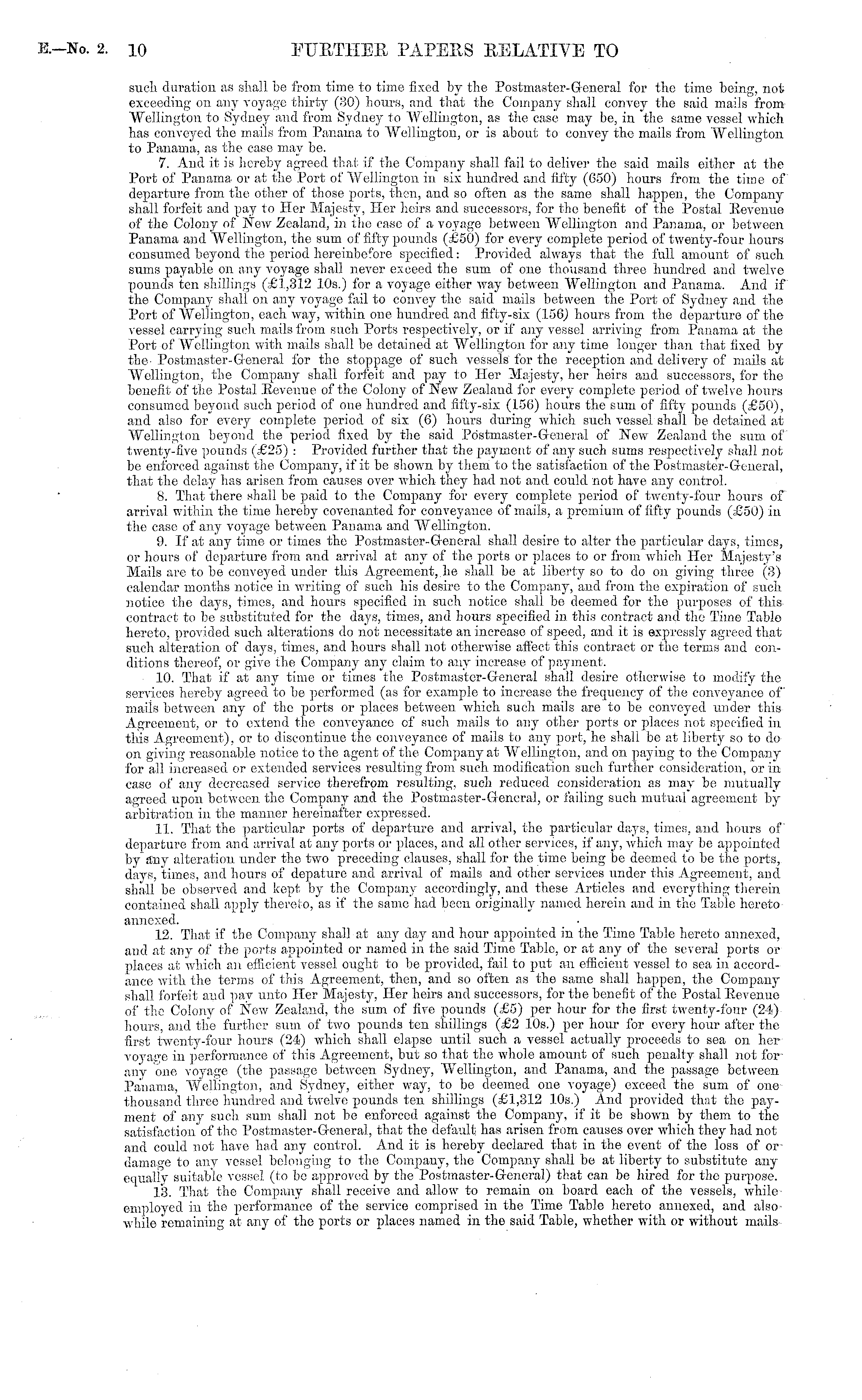 such duration as shall be from time to time fixed by the Postmaster-General for the time being, not exceeding on any voyage thirty (30) hours, and that the Company shall convey the said mails from Wellington to Sydney and from Sydney to Wellington, as the case may be, in the same vessel which has conveyed the mails from Panama to Wellington, or is about to convey the mails from Wellington to Panama, as the case may be. 7. And it is hereby agreed that if the Company shall fail to deliver the said mails either at the Port of Panama or at the Port of Wellington in six hundred and fifty (650) hours from the time of departure from the other of those ports, then, and so often as the same shall happen, the Company shall forfeit and pay to Her Majesty, Her heirs and successors, for tho benefit of the Postal Revenue of the Colony of New Zealand, in the case of a voyage between Wellington and Panama, or between Panama and Wellington, the sum of fifty pounds (£SO) for every complete period of twenty-four hours consumed beyond the period hereinbefore specified: Provided always that the full amount of such sums payable on any voyage shall never exceed the sum of ono thousand three hundred and twelve pounds ten shillings (£1,312 10s.) for a voyage either way between Wellington and Panama. And if" the Company shall on any voyage fail to convey the said mails between the Port of Sydney and the Port of Wellington, each way, within one hundred and fifty-six (156) hours from the departure of the vessel carrying such mails from such Ports respectively, or if any vessel arriving from Panama at the Port of Wellington with mails shall be detained at Wellington for any time longer than that fixed by the- Postmaster-General for the stoppage of such vessels for the reception and delivery of mails at Wellington, the Company shall forfeit and pay to Her Majesty, her heirs and successors, for tho benefit of the Postal Revenue of the Colony of New Zealand for every complete period of twelve hours consumed beyond such period of one hundred and fifty-six (156) hours the sum of fifty pounds (£SO), and also for every complete period of six (6) hours during which, such vessel shall be detained at Wellington beyond the period fixed by the said Postmaster-General of New Zealand the sum of twenty-five pounds (£25) : Provided further that the payment of any such sums respectively shall not be enforced against the Company, if it be shown by them to the satisfaction of the Postmaster-General, that the delay has arisen from causes over which they had not and could not have any control. 8. That there shall be paid to the Company for every complete period of twenty-four hours of arrival within the time hereby covenanted for conveyance of mails, a premium of fifty pounds (£SO) in the case of any voyage between Panama and Wellington. 9. If at any time or times the Postmaster-Gen era! shall desire to alter the particular days, times, or hours of departure from and arrival at any of the ports or places to or from which Her Majesty's Mails are to be conveyed under this Agreement,.he shall be at liberty so to do on giving three (3) calendar months notice in writing of such his desire to the Company', and from the expiration of such notice the days, times, and hours specified in such notice shall be deemed for the purposes of this contract to be substituted for the days, times, and hours specified in. this contract and the Time Table hereto, provided such alterations do not necessitate an increase of speed, and it is espressly agreed that such alteration of days, times, and hours shall not otherwise affect this contract or the terms and conditions thereof, or give the Company any claim to any increase of payment. 10. That if at an}'' time or times the Postmaster-General shall desire otherwise to modify the services hereby agreed to be performed (as for example to increase the frequency of tho conveyance of" mails between any of the ports or places between which such mails are to be convoyed under this Agreement, or to extend the conveyance of such mails to any other ports or places not specified in this Agreement), or to discontinue the conveyance of mails to any port, he shall be at liberty so to do on giving reasonable notice to the agent of the Company at Wellington, and on paying to the Company for all increased or extended services resulting from such modification such further consideration, or in case of any decreased service therefrom resulting, such reduced consideration as may be mutually agreed upon between the Company and tho Postmaster-General, or failing such mutual agreement by arbitration in the manner hereinafter expressed. 11. That the particular ports of departure and arrival, the particular days, times, and hours of departure from and arrival at any ports or places, and all other services, if any, which may be appointed by any alteration under the two preceding clauses, shall for the time being be deemed to be the ports, days, times, and hours of depature and arrival of mails and other services under this Agreement, and shall be observed and kept by the Company accordingly, and these Articles and everything therein contained shall apply thereto, as if the same had been original]}' named herein and in the Table hereto annexed. _ • 12. That if the Company' shall at any day and hour appointed in the Time Table hereto annexed, and at any of the ports appointed or named in the said Time Table, or at any of the several ports or places at which an efficient vessel ought to be provided, fail to put an efficient vessel to sea in accordance with the terms of this Agreement, then, and so often as the same shall happen, the Company shall forfeit and pay unto Her Majesty, Her heirs and successors, for the benefit of the Postal Revenue of the Colony of New Zealand, the sum of five pounds (£5) per hour for the first twenty-four (24) hours, and the further sum of two pounds ten shillings (£2 10s.) per hour for every hour afte