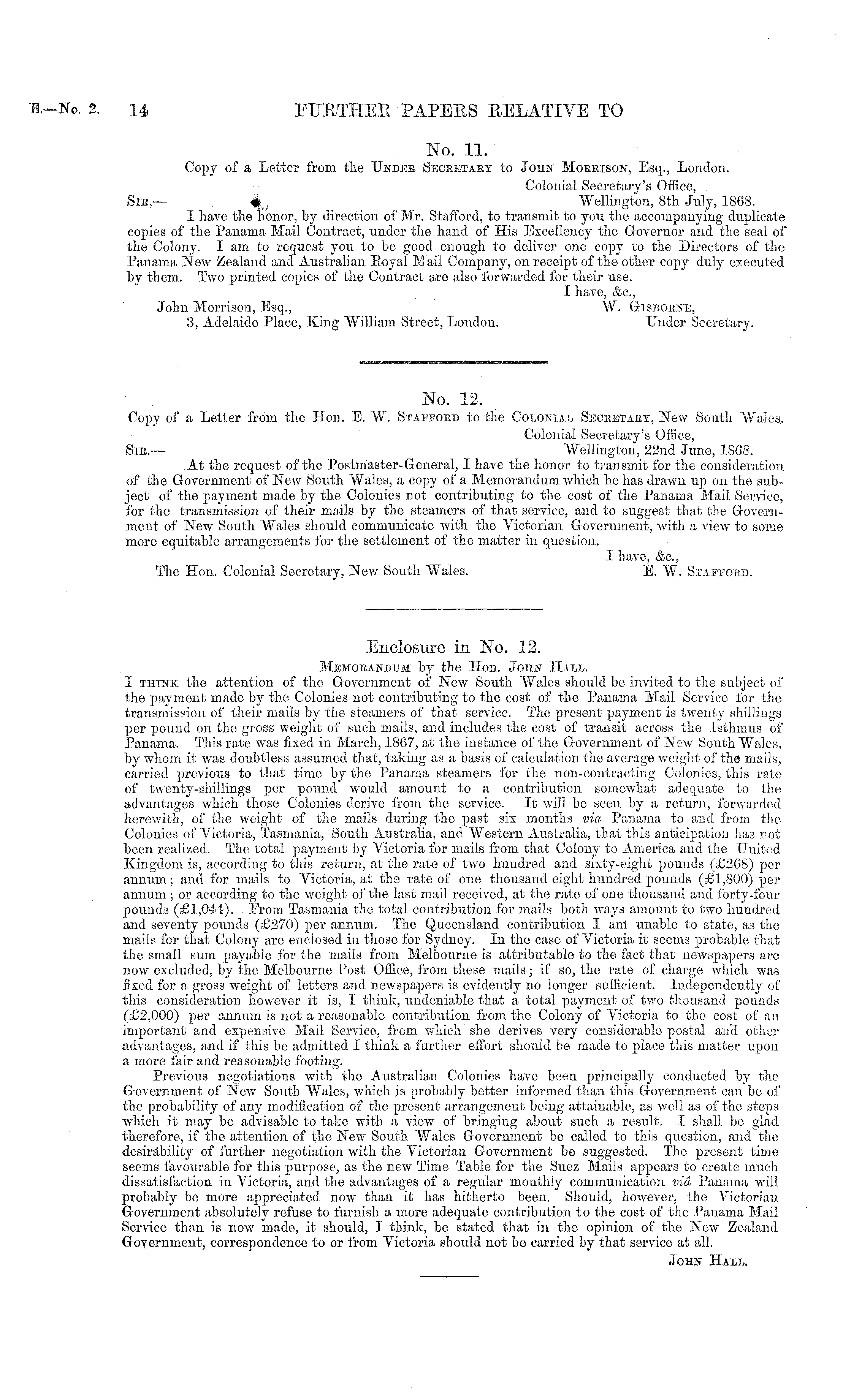 No. 11. Copy of a Letter from the Under Secretary to John Morrison, Esq., London. Colonial Secretary's Office, . Sir,— * Wellington, Bth July, 1868. I have the honor, by direction of Air. Stafford, to transmit to you the accompanying duplicate copies of the Panama Mail Contract, under the hand of His Excellency the Governor and the seal of the Colony. lam to request you to be good enough to deliver one copy to the Directors of the Panama New Zealand and Australian Royal Mail Company, on receipt of the other copy duly executed by them.. Two printed copies of the Contract are also forwarded for their use. I have, &c, John Morrison, Esq., W. Gisborne, 3, Adelaide Place, King William Street, London; Under Secretary.
