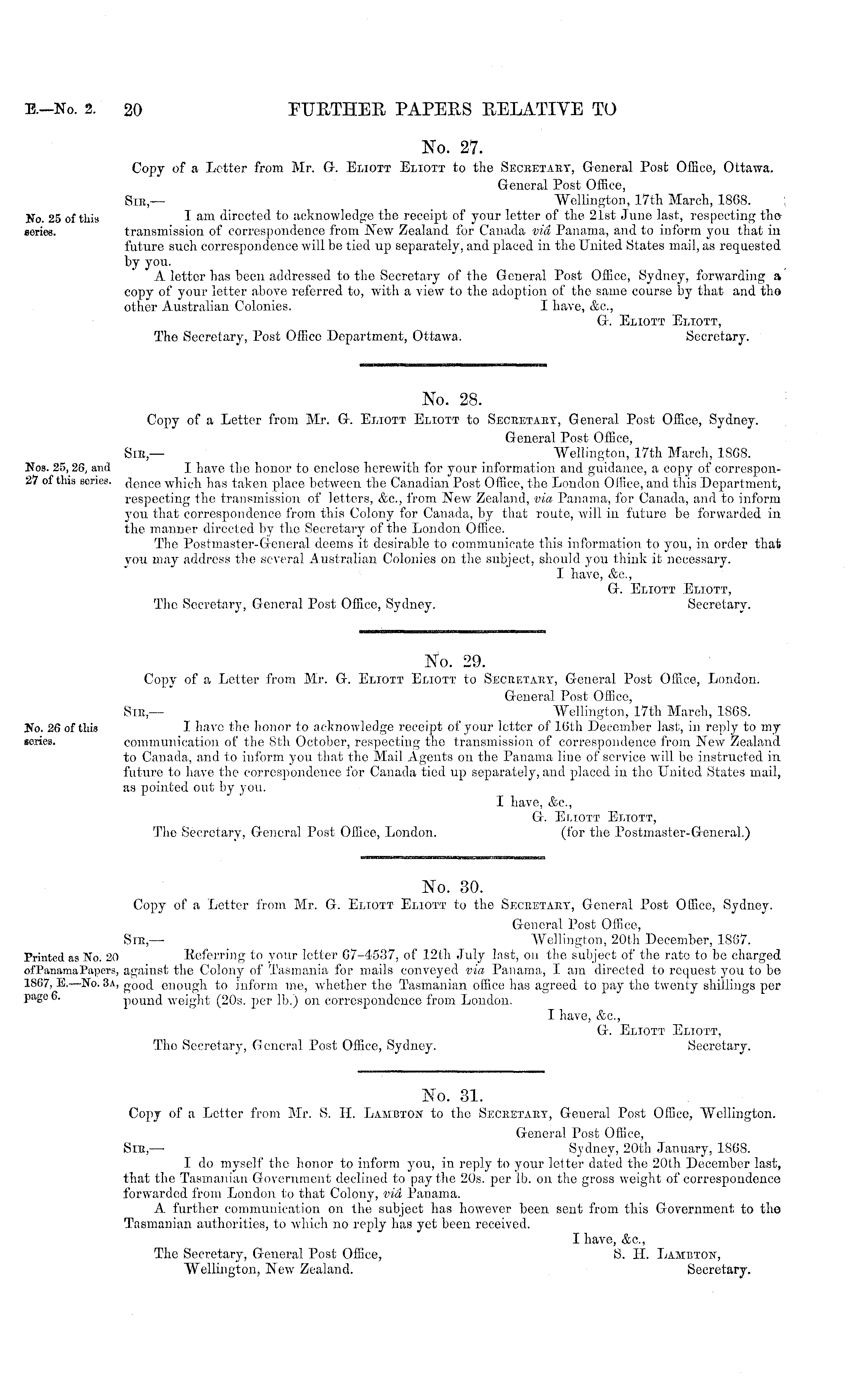 No. 29. Copy of a Letter from Mr. G. Eliott Eliott to Seceetary, General Post Office, London. General Post Office, SrE,— Wellington, 17th March, 1868. I have the honor to acknowledge receipt of your letter of 16th December last, in reply to my communication of the Bth October, respecting the transmission of correspondence from New Zealand to Canada, and to inform you that the Mail Agents on the Panama line of service will be instructed in future to have the correspondence for Canada tied up separately, and placed in the United States mail, as pointed out by you. I have, &c, G. Eliott Eltott, The Secretary, General Post Office, London. (for the Postmaster-General.)