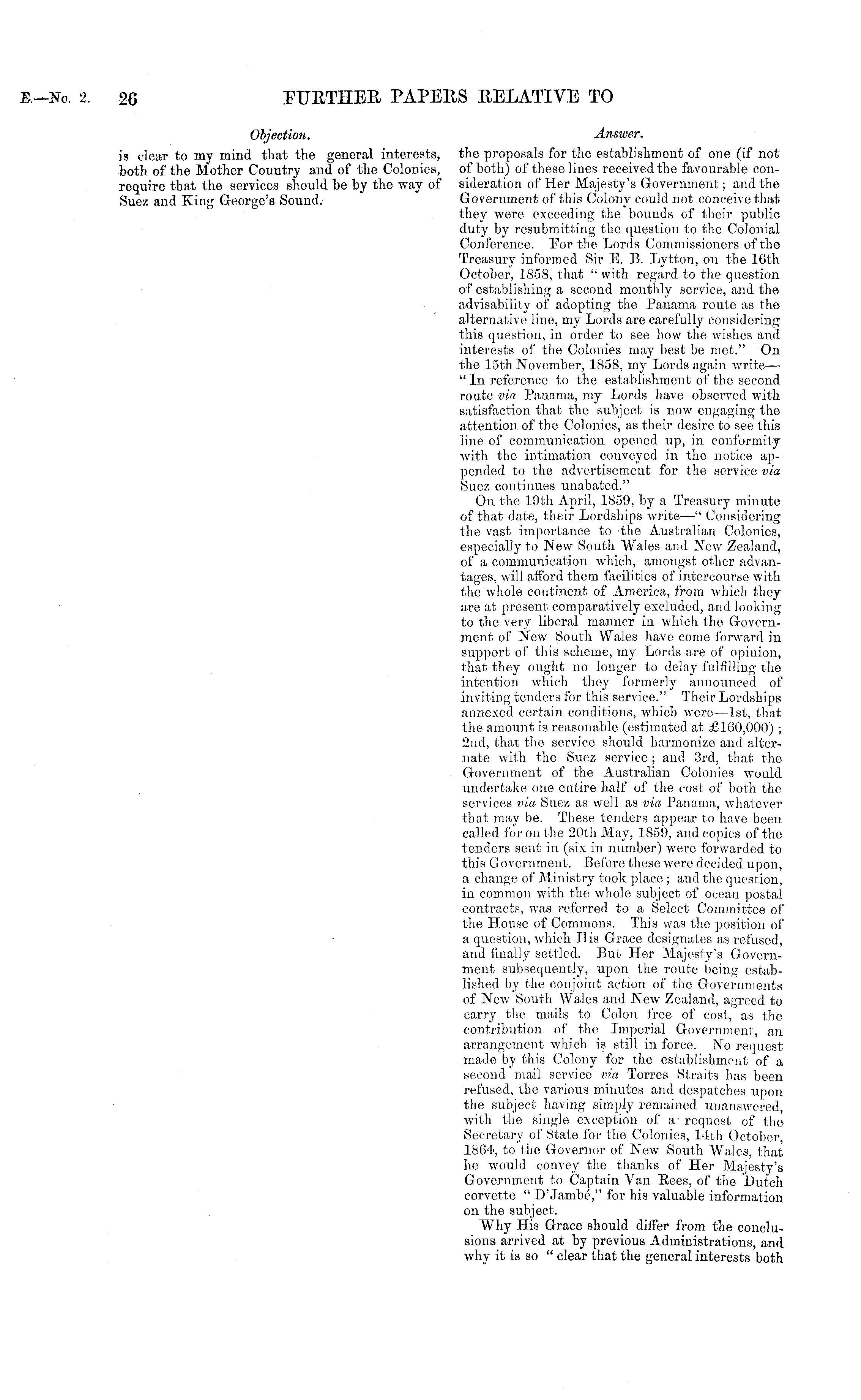 Answer. the proposals for the establishment of one (if not of both) of these lines received tho favourable consideration of Her Majesty's Government; and the Government of this Colony could not conceive that they were exceeding the bounds of their public, duty by resubmitting the question to the Colonial Conference. For the Lords Commissioners of the Treasury informed Sir E. B. Lytton, on the 16th October, 1858, that " with regard to the question of establishing a second monthly service, and the advisability of adopting the Panama route as the alternative line, my Lords are carefully considering this question, in order to see how the wishes and interests of the Colonies may best be met." On the 15th November, 1858, my Lords again write — " In reference to the establishment of the second route via Panama, my Lords have observed with satisfaction that the subject is now engaging the attention of the Colonies, as their desire to see this line of communication opened up, in conformity with the intimation conveyed in the notice appended to the advertisement for the service via Suez continues unabated." On the 19th April, 1859, by a Treasury minute of that date, their Lordships write —" Considering the vast importance to the Australian Colonies, especially to New South Wales and New Zealand, of a communication which, amongst other advantages, will afford them facilities of intercourse with the whole continent of America, from which they are at present comparatively excluded, and looking to the very liberal manner in which tho Government of New South Wales have come forward in support of this scheme, my Lords are of opinion, that they ought no longer to delay fulfilling the intention -which they formerly announced of inviting tenders for this service." Their Lordships annexed certain conditions, which were —Ist, that the amount is reasonable (estimated at £160,000) ; 2nd, that the service should harmonize and alternate with the Suez service ; and 3rd, that the Government of the Australian Colonies would undertake one entire half of the cost of both the services via Suez as well as via Panama, whatever that may be. These tenders appear to have been called for on the 20th May, 1859, and copies of the tenders sent in (six in number) were forwarded to this Government. Before these were decided upon, a change of Ministry took place ; and the question, in common with the whole subject of ocean postal contracts, was referred to a Select Committee of the House of Commons. This was the position of a question, which His Grace designates as refused, and finally settled. But Her Majesty's Government subsequently, upon the route being established by the conjoint action of the Governments of New South Wales and New Zealand, agreed to carry the mails to Colon free of cost, as tho contribution of the Imperial Government, an arrangement which is still in force. No request made by this Colony for the establishment of a second mail service via Torres Straits has been refused, the various minutes and despatches upon the subject having simply remained unanswered, with the single exception of a- request of the Secretary of State for the Colonies, 14th October, 1864, to tho Governor of New South Wales, that he would convoy the thanks of Her Majesty's Government to Captain Van Rees, of the Dutch corvette " D'Jambe," for his valuable information on the subject. Why His Grace should differ from the conclusions arrived at by previous Administrations, and why it is so " clear that the general interests both