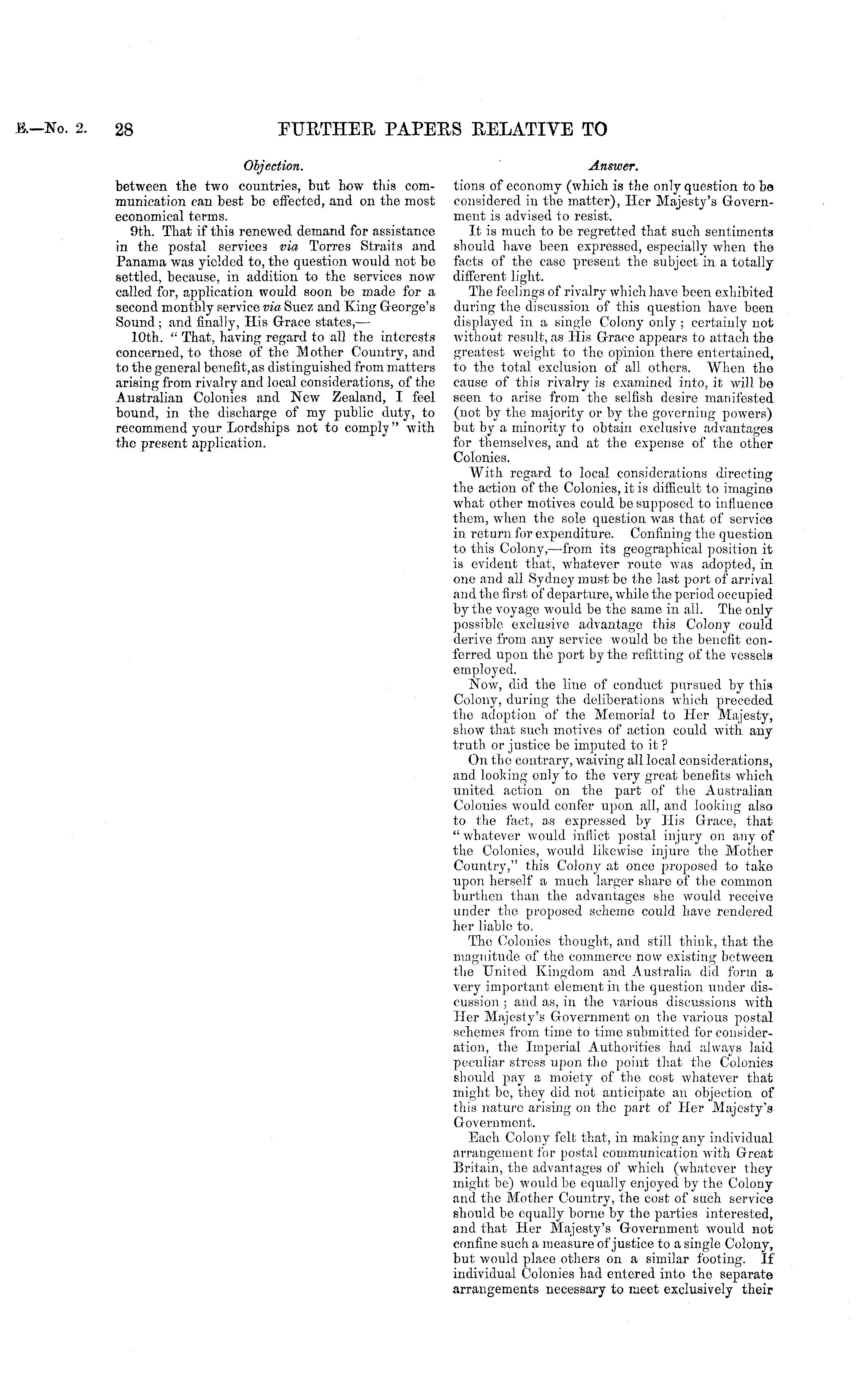 Answer. tions of economy (which is the only question to be considered in the matter), Her Majesty's Government is advised to resist. It is much to be regretted that such sentiments should have been expressed, especially when the facts of the case present the subject in a totally different light. The feelings of rivalry which have been exhibited during the discussion of this question have been displayed in a single Colony only ; certainly not without result, as His Grace appears to attach the greatest weight to the opinion there entertained, to the total exclusion of all others. When the cause of this rivalry is examined into, it will be seen to arise from the selfish desire manifested (not by the majority or by the governing powers) but by a minority to obtain exclusive advantages for themselves, and at the expense of the other Colonies. With regard to local considerations directing the action of the Colonies, it is difficult to imagino what other motives could be supposed to influence them, when the sole question was that of service in return for expenditure. Confining the question to this Colony, —from its geographical position it is evident that, whatever route was adopted, in one and all Sydney must be the last port of arrival and the first of departure, while the period occupied by the voyage would be the same in all. The only possible exclusive advantage this Colony could derive from any service would be the benefit conferred upon the port by the refitting of the vessels employed. Now, did the line of conduct pursued by this Colony, during the deliberations which preceded the adoption of the Memorial to Her Majesty, show that such motives of action could with any truth or justice be imputed to it ? On the contrary, waiving all local considerations, and looking only to the very great benefits which united action on the part of the Australian Colonies would confer upon all, and looking also to the fact, as expressed by His Grace, that " whatever would inflict postal injury on any of the Colonies, would likewise injure the Mother Country," this Colony at once proposed to take upon herself a much larger share of the common burthen than the advantages she would receive under the proposed scheme could have rendered her liable to. The Colonies thought, and still think, that the magnitude of the commerce now existing between the United Kingdom and Australia did form a very important element in the question under discussion ; and as, in the various discussions with Her Majesty's Government on the various postal schemes from time to time submitted for consideration, the Imperial Authorities had always laid peculiar stress upon the point that the Colonies should pay a moioty of the cost whatever that might be, they did not anticipate an objection of this nature arising on the part of Her Majesty's Government. Each Colony felt that, in making any individual arrangement for postal communication with Great Britain, the advantages of which (whatever they might be) would be equally enjoyed by the Colony and the Mother Country, the cost of such service should be equally borne by the parties interested, and that Her Majesty's Government would not confine such a measure ofjustice to a single Colony, but would place others on a similar footing. If individual Colonies had entered into the separate arrangements necessary to meet exclusively their