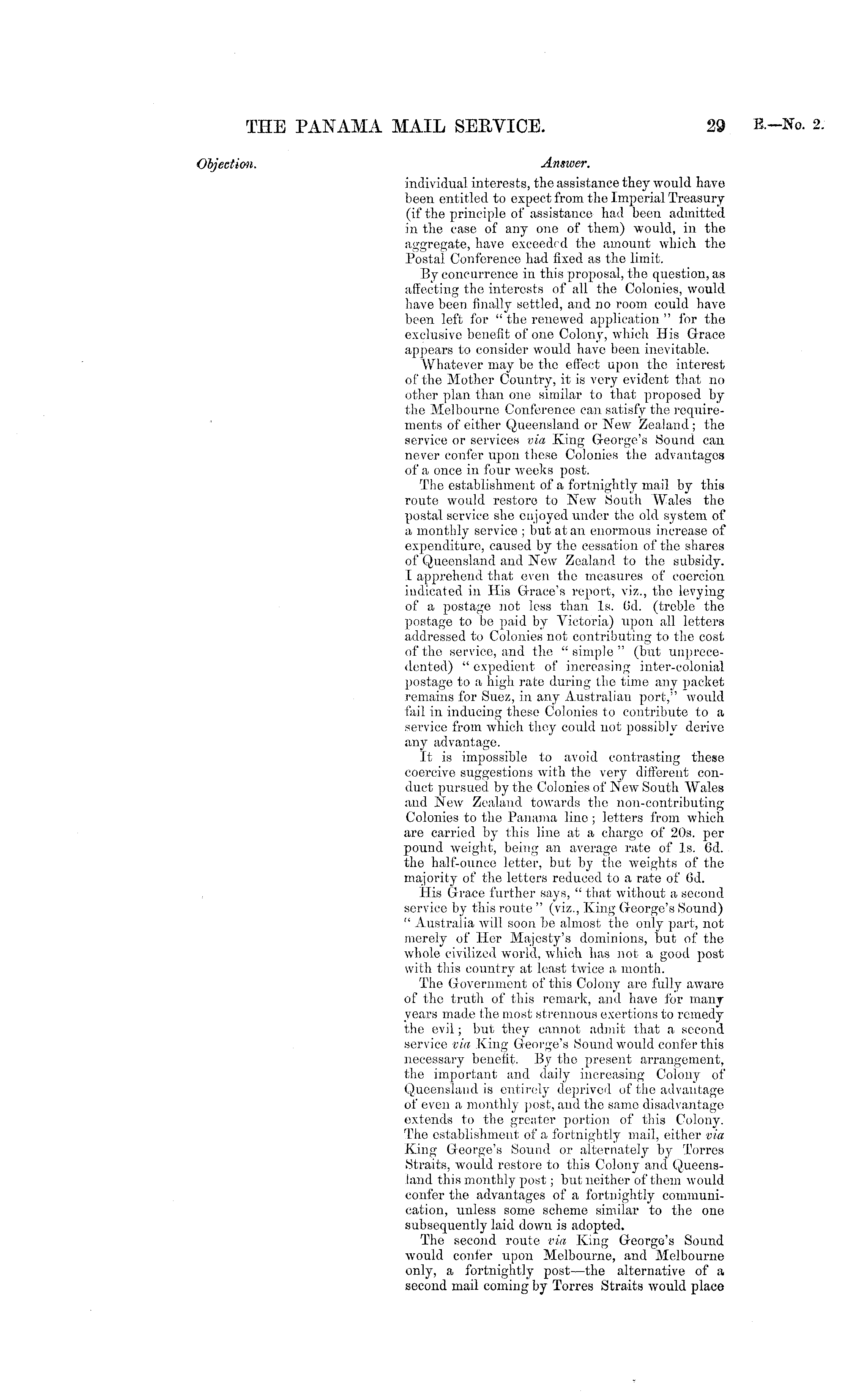 Answer. Individual interests, the assistance they would have been entitled to expect from the Imperial Treasury (if the principle of assistance had been admitted in the case of any one of them) would, in the aggregate, have exceeded the amount which the Postal Conference had fixed as the limit. By concurrence in this proposal, the question, as affecting the interests of all the Colonies, would have been finally settled, and no room could have been left for " the renewed application " for the exclusive benefit of one Colony, which His Grace appears to consider would have been inevitable. Whatever may be the effect upon the interest of the Mother Country, it is very evident that no other plan than one similar to that proposed by the Melbourne Conference can satisfy the requirements of either Queensland or New Zealand ; the service or services via King George's Sound can never confer upon those Colonies the advantages of a once in four weeks post. The establishment of a fortnightly mail by this route would restore to New South Wales the postal service she enjoyed under the old system of a monthly service ; but at an enormous increase of expenditure, caused by the cessation of the shares of Queensland and Now Zealand to the subsidy. I apprehend that even the measures of coercion indicated in His Grace's report, viz., the levying of a postage not less than Is. 6d. (treble the postage to be paid by Victoria) upon all letters addressed to Colonies not contributing to the cost of the service, and the " simple " (but unprecedented) " expedient of increasing inter-colonial postage to a high rate during the time any packet remains for Suez, in any Australian port," would fail in inducing these Colonies to contribute to a service from which they could not possibly derive any advantage. It is impossible to avoid contrasting these coercive suggestions with the very different conduct pursued by the Colonies of New South Wales and New Zealand towards the non-contributing Colonies to the Panama lino ; letters from which are carried by this line at a charge of 20s. per pound weight, being an average rate of Is. 6d. the half-ounce letter, but by the weights of the majority of the letters reduced to a rate of 6d. His Grace further says, " that without a second service by this route " (viz., King George's Sound) " Australia will soon be almost the only part, not merely of Her Majesty's dominions, but of the whole civilized world, which has not a good post with this country at least twice a month. The Government of this Colony are fully aware of the truth of this remark, and have for many years made the most strenuous exertions to remedy the evil; but they cannot admit that a second service via King George's Sound would confer this necessary benefit. By the present arrangement, the important and daily increasing Colony of Queensland is entirely deprived of the advantage of even a monthly post, and the same disadvantage extends to the greater portion, of this Colony. The establishment of a fortnightly mail, either via King George's Sound or alternately by Torres Straits, would restore to this Colony and Queensland this monthly post; but neither of them would confer the advantages of a fortnightly communication, unless some scheme similar to the one subsequently laid down is adopted. The second route via King George's Sound w rould confer upon Melbourne, and Melbourne only, a fortnightly post—the alternative of a second mail coming by Torres Straits would place