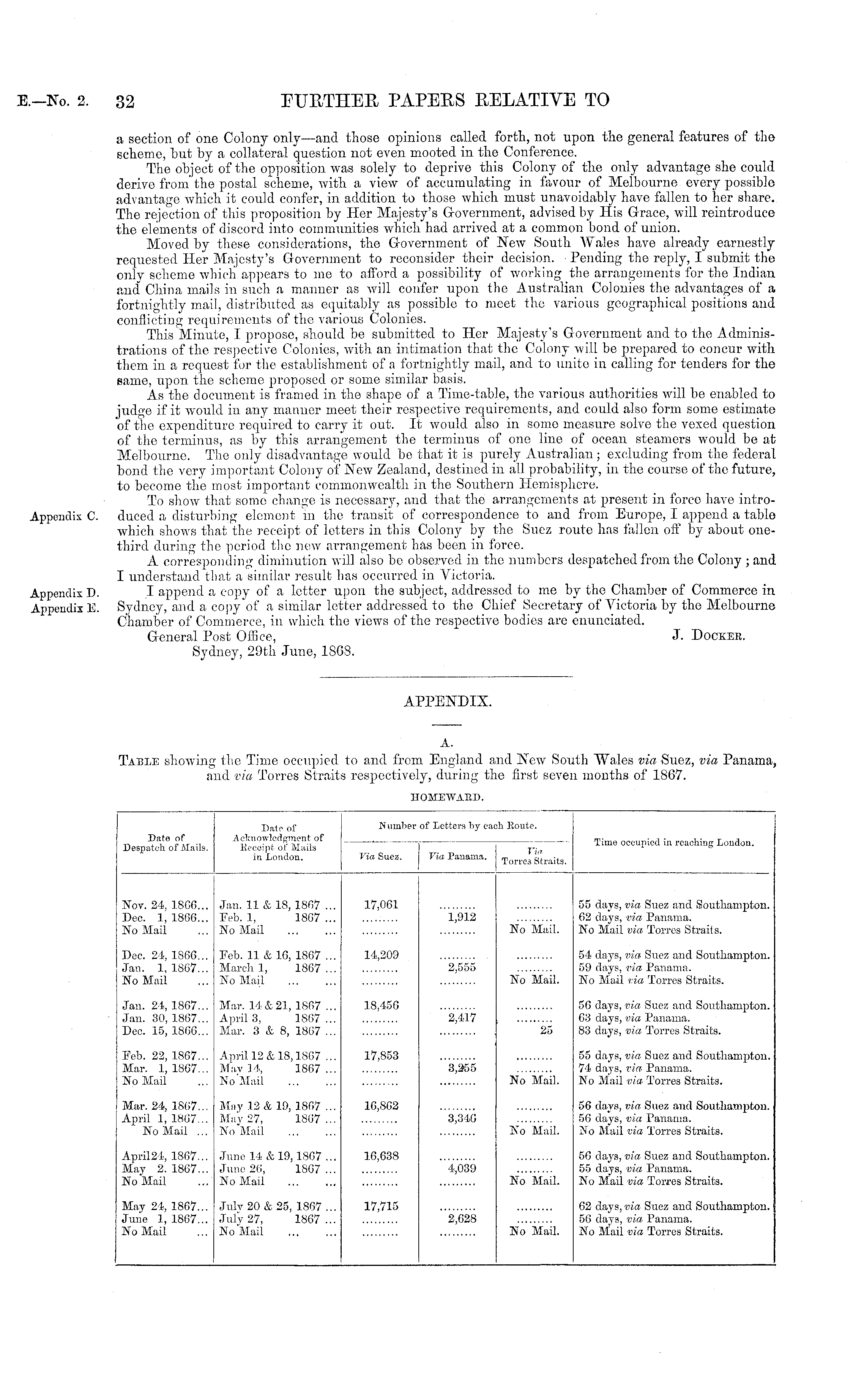 a section of one Colony only —and those opinions called forth, not upon the general features of tho scheme, but by a collateral question not even mooted in the Conference. The object of the opposition was solely to deprive this Colony of the only advantage she could derive from' the postal scheme, with a view of accumulating in favour of Melbourne every possible advantage which it could confer, in addition to those which must unavoidably have fallen to her share. The rejection of this proposition by Her Alajesty's Government, advised by His Grace, will reintroduce the elements of discord into communities which had arrived at a common bond of union. Moved by these considerations, the Government of New South Wales have already earnestly requested Her Majesty's Government to reconsider their decision. Pending the reply, I submit the only scheme which appears to me to afford a possibility of working the arrangements for the Indian and China mails in such a manner as will confer upon the Australian Colonies the advantages of a fortnightly mail, distributed as equitably as possible to meet tho various geographical positions and conflicting requirements of the various Colonies. This Minute, I propose, should be submitted to Her Majesty's Government and to the Administrations of the respective Colonies, with an intimation that the Colony will be prepared to concur with them in a request for the establishment of a fortnightly mail, and to unite in calling for tenders for the same, upon the scheme proposed or some similar basis. As the document is framed in the shape of a Time-table, the various authorities will be enabled to judge if it would in any manner meet their respective requirements, and could also form some estimate of the expenditure required to carry it out. It would also in some measure solve the vexed question of the terminus, as by this arrangement the terminus of one line of ocean steamers would be at Melbourne. The only disadvantage would be that it is purely Australian; excluding from the federal bond tho very important Colony of New Zealand, destined in all probability, in the course of the future, to become the most important commonwealth in the Southern Hemisphere. To show that some change is necessary, and that the arrangements at present in force have introduced a disturbing element in the transit of correspondence to and from Europe, I append a table which shows that the receipt of letters in this Colony by the Suez route has fallen off by about onethird during the period the new arrangement has been in force. A corresponding diminution will also be observed in the numbers despatched from the Colony ; and I understand that a similar result has occurred in Victoria. I append a copy of a letter upon the subject, addressed to mo by tho Chamber of Commerce in Sydney, and a copy of a similar letter addressed to the Chief Secretary of Victoria by the Melbourne Chamber of Commerce, in which tho views of the respective bodies are enunciated. General Post Office, J. Dockee. Sydney, 29th June, 1808.