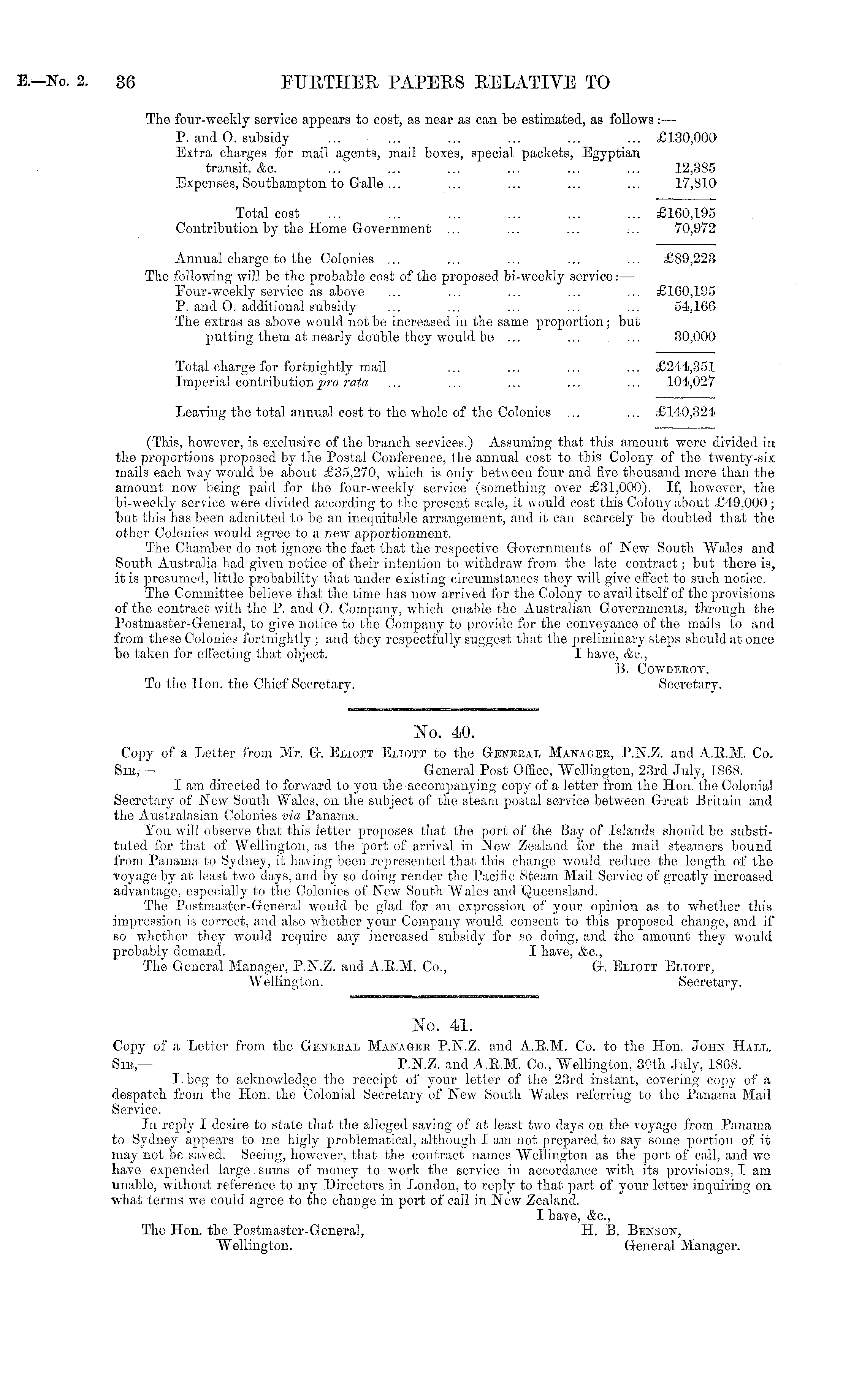 No. 41. Copy of a Letter from the Geneeal Manages P.N.Z. and A.R.M. Co. to the Hon. John Hall. Sib— P.N.Z. and A.R.M. Co., Wellington, 30th July, 1808. I.beg to acknowledge the receipt of your letter of tho 23rd instant, covering copy of a despatch from tho Hon. tho Colonial Secretary of New South Wales referring to the Panama Mail Service. In reply I desire to state that the alleged saving of at least two days on the voyage from Panama to Sydney appears to me higly problematical, although I am not prepared to say some portion of it may not be saved. Seeing, however, that the contract names Wellington as the port of call, and we have expended large sums of money to work the service in accordance with its provisions, I am unablo, without reference to my Directors in London, to reply to that part of your letter inquiring on what terms we could agree to the change in port of call in New Zealand. I have, &c, The Hon. the Postmaster-General, 11. B. Benson, Wellington. General Manager.