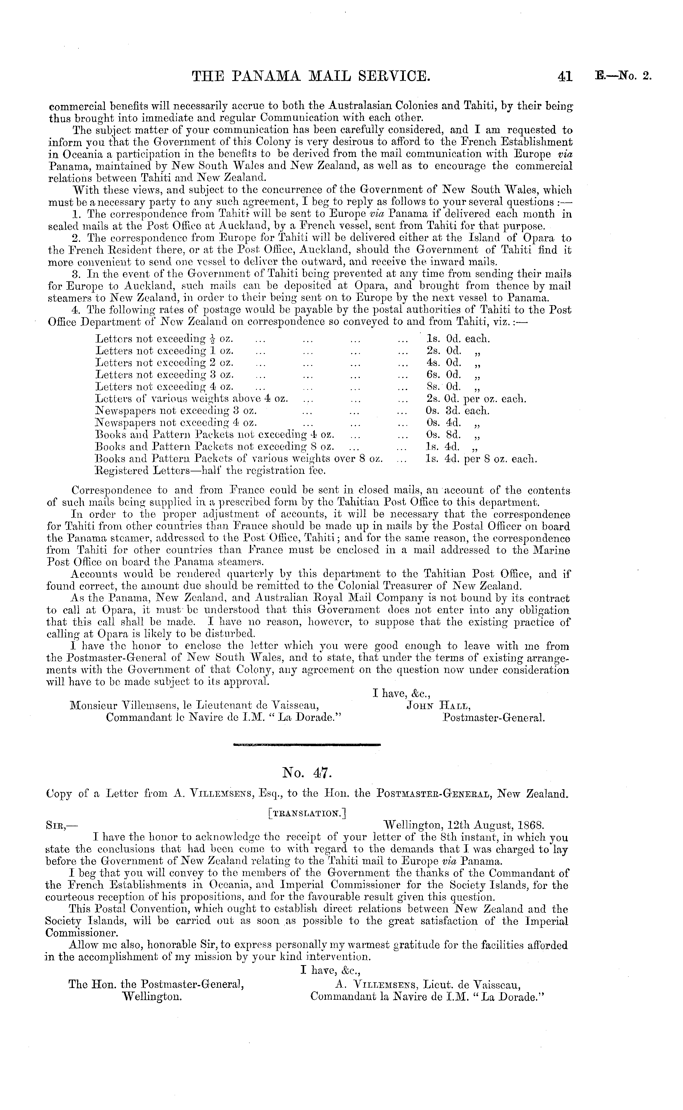 No. 47. Copy of a Letter from A. Villemsens, Esq., to the Hon. the Postmaster-General, New Zealand. [translation.] Sir,— Wellington, 12th August, 1868. I have the honor to acknowledge the receipt of your letter of tho Bth instant, in which you state the conclusions that had been come to with regard to the demands that I was charged to lay before the Government of New Zealand relating to the Tahiti mail to Europe via Panama. I beg that you will convey to the members of the Government the thanks of the Commandant of the French Establishments in Oceania, and Imperial Commissioner for the Society Islands, for the courteous reception of his propositions, and for the favourable result given this question. This Postal Convention, which ought to establish direct relations between New Zealand and the Society Islands, will be carried out as soon as possible to the great satisfaction of the Imperial Commissioner. Allow me also, honorable Sir, to express personally my warmest gratitude for the facilities afforded in the accomplishment of my mission by your kind intervention. I have, &c, The Hon. the Postmaster-General, A. Villemsens, Lieut, de Vaisseau, Wellington. Commandant la Naviro de I.M. "La Dorade."