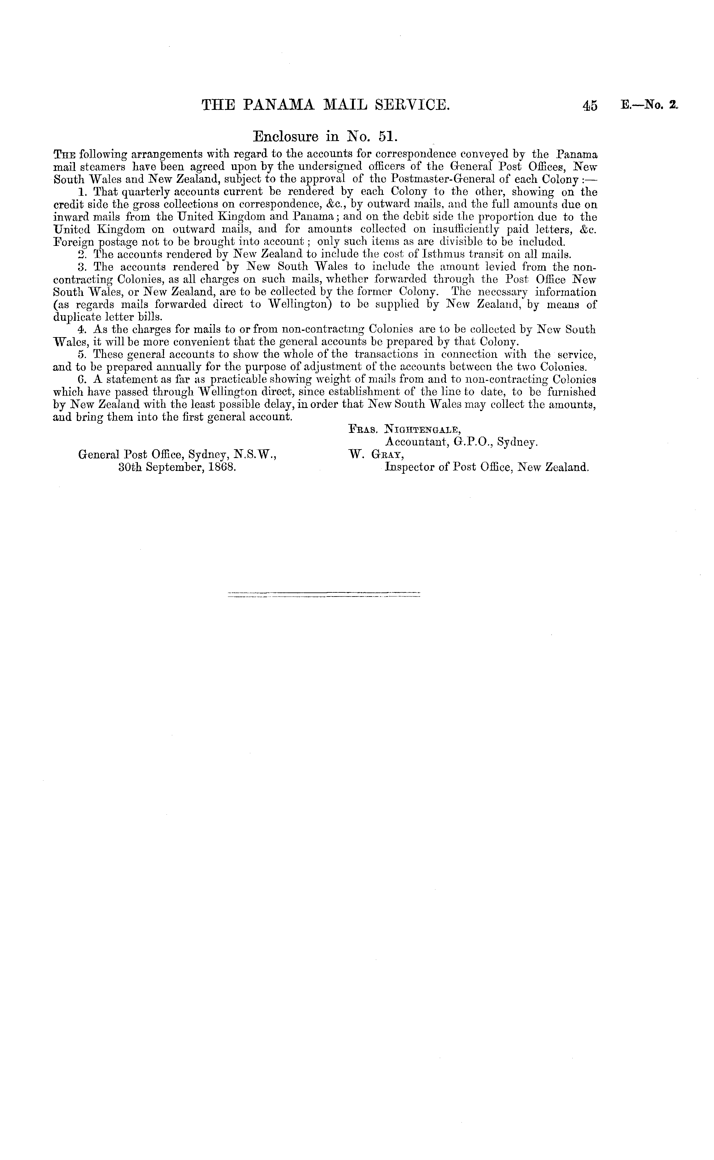 Enclosure in No. 51. The following arrangements with regard to the accounts for correspondence conveyed by the Panama mail steamers have been agreed upon by the undersigned officers of the General Post Offices, New South Wales and New Zealand, subject to the approval of the Postmaster-General of each Colony:— 1. That quarterly accounts current be rendered by each Colony to the other, showing on the credit side the gross collections on correspondence, &c, by outward mails, and the full amounts due on inward mails from the United Kingdom and Panama; and. on the debit side the proportion due to the United Kingdom on outward mails, and for amounts collected on insufficiently paid letters, &c. Foreign postage not to be brought into account; only such items as are divisible to be included. 2. The accounts rendered by New Zealand to include the cost of Isthmus transit on all mails. 3. The accounts rendered by New South Wales to include the amount levied from the noncontracting Colonies, as all charges on such mails, whether forwarded through the Post Office New South Wales, or New Zealand, are to be collected by the former Colony. The necessary information (as regards mails forwarded direct to Wellington) to be supplied by New Zealand, by means of duplicate letter bills. 4. As the charges for mails to or from non-contracting Colonies are to be collected by New South Wales, it will be more convenient that the general accounts bo prepared by that Colony. 5. These general accounts to show the whole of the transactions in connection with the service, and to be prepared annually for the purpose of adjustment of the accounts between the two Colonies. 6. A statement as far as practicable showing weight of mails from and to non-contracting Colonies which have passed through Wellington direct, since establishment of the line to date, to be furnished by New Zealand with the least possible delay, in order that Now South Wales may collect the amounts, and bring them into the first general account. Fras. Nightengale, Accountant, G.P.0., Sydney. General Post Office, Sydney, N.S.W., W. Gray, 30th September, 1868. Inspector of Post Office, New Zealand.