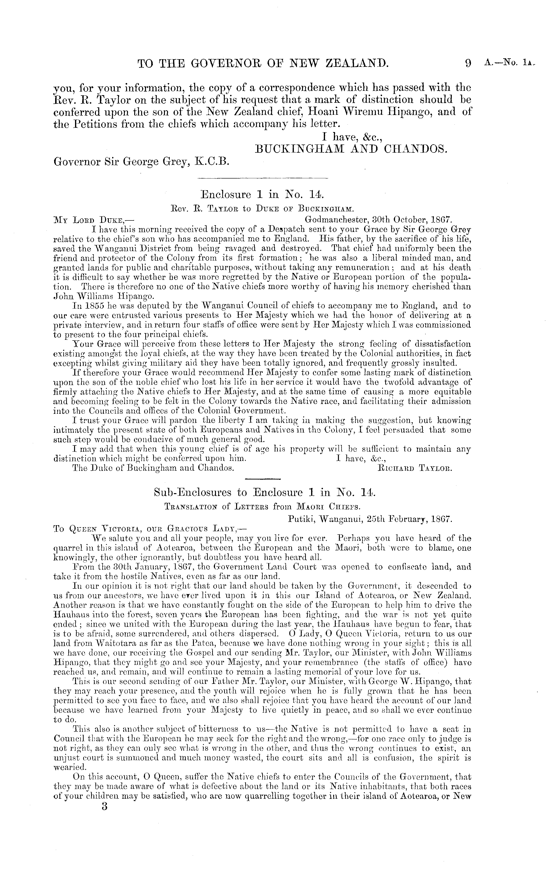 Sub-Enclosures to Enclosure 1 in No. 14. Translation of Letters from Maori Chiefs. Putiki, Wanganui, 25th February, 1867. To Queen Victoria, our Gracious Lady, — Wo salute you and all your people, may you lire for ever. Perhaps you have heard of the quarrel in tins island of Aotearoa, between the European and the Maori, both were to blame, one knowingly, the other ignorantly, but doubtless you have heard all. Prom the 30th January, 1867, the Government Land Court was opened to confiscate land, and take it from the hostile Natives, even as far as oar land, In our opinion it is not right that our laud should be taken by the Government, it descended to iis from our ancestors, we have eTcr lived upon it in this our Island of Aotearoa, or New Zealand. Another reason is that we have constantly fought on the side of the European to help him to drive the liauhaus into the forest, seven years the European has been fighting, and the war is not yet quite ended ; since we united with the European during the last year, the Hauhaua have begun to fear, that is to be afraid, some surrendered, and others dispersed. 0 Lady, O Queen Yictoria, return to us our land from Waitotara as far as the Patea, because we have done nothing wrong in your sight; this is all we have done, our receiving the Gospel and our sending Mr. Taylor, our Minister, with John Williams Hipango, that they might go and see your Majesty, and your remembrance (the staffs of office) have reached us, and remain, and will continue to remain a lasting memorial of your love for us. This is our second sending of our Father Mr. Taylor, our Minister, with George W. Hipango, that they may reach your presence, and the youth will rejoice when he is fully grown that he has been permitted to see you face to face, and we also shall rejoice that you have heard the account of our land because we have learned from your Majesty to live quietly in peace, and so shall we ever continue to do. This also is another subject of bitterness to us —the Native is not permitted to have a seat in Council that with the European he may seek for the right and the wrong, —for one race only to judge is not right, as they can only see what is wrong in the other, and thus the wrong continues to exist, an unjust court is summoned and much money wasted, the court sits and all is confusion, the spirit is ■wearied. On this account, O Queen, suffer the Native chiefs to enter the Councils of the Government, that they may be made aware of what is defective about the land or its Native inhabitants, that both races of your children may be satisfied, who are now quarrelling together in their island of Aotearoa, or New 3