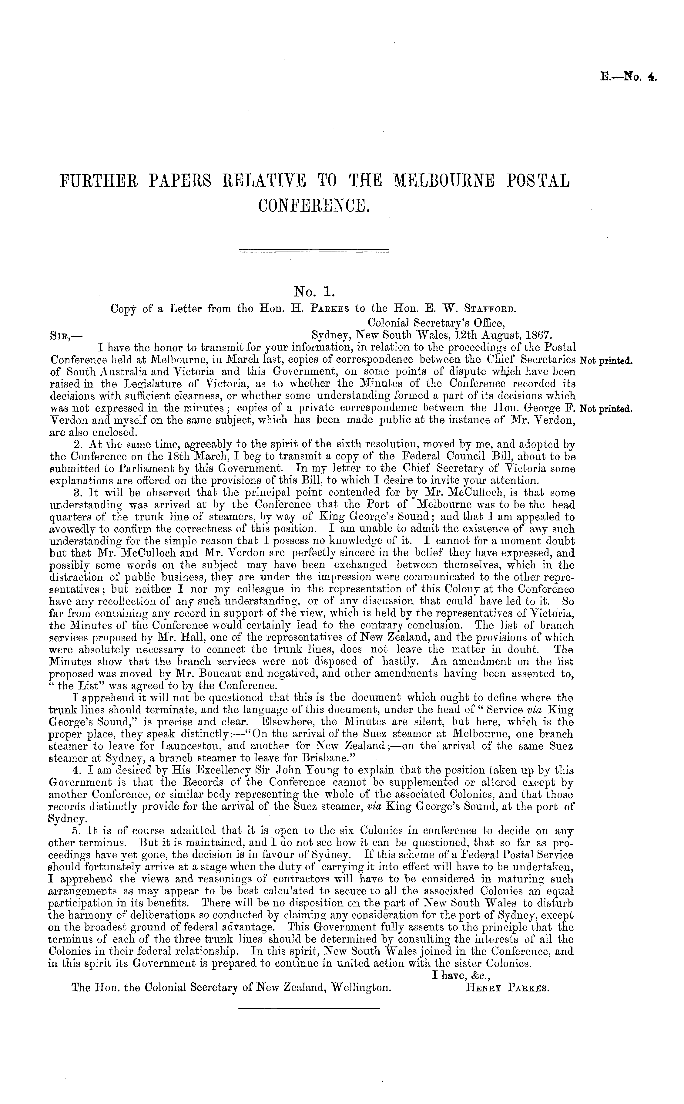 No. 1. Copy of a Letter from the Hon. H. Paekes to the Hon. E. W. Stappoed. Colonial Secretary's Office, Sic,— Sydney, New South Wales, 12th August, 1867. I have the honor to transmit for your information, in relation to the proceedings of the Postal Conference held at Melbourne, in March last, copies of correspondence between tho Chief Secretaries of South Australia and Victoria and this Government, on some points of dispute which have been raised in the Legislature of Victoria, as to whether the Minutes of the Conference recorded its decisions with sufficient clearness, or whether some understanding formed a part of its decisions which was not expressed in the minutes ; copies of a private correspondence between the Hon. George F. Verdon and myself on the same subject, which has been made public at the instance of Mr. Verdon, are also enclosed. 2. At the same time, agreeably to the spirit of the sixth resolution, moved by me, and adopted by the Conference on the 18th March, I beg to transmit a copy of the Federal Council Bill, about to bo submitted to Parliament by this Government. In my letter to the Chief Secretary of Victoria some explanations are offered on the provisions of this Bill, to which I desire to invite your attention. 3. It will be observed that the principal point contended for by Mr. McCulloch, is that some understanding was arrived at by the Conference that the Port of Melbourne was to be the head quarters of the trunk line of steamers, by way of King George's Sound; and that lam appealed to avowedly to confirm the correctness of this position. I am unable to admit the existence of any such understanding for the simple reason that I possess no knowledge of it. I cannot for a moment doubt but that Mr. McCulloch and Mr. Verdon are perfectly sincere in the belief they have expressed, and possibly some words on the subject may have been exchanged between themselves, which in the distraction of public business, they are under the impression were communicated to the other representatives ; but neither I nor my colleague in the representation of this Colony at the Conference have any recollection of any such understanding, or of any discussion that could have led to it. So far from containing any record in support of the view, which is held by the representatives of Victoria, the Minutes of the Conference would certainly lead to the contrary conclusion. The list of branch services proposed by Mr. Hall, one of the representatives of New Zealand, and the provisions of which were absolutely necessary to connect the trunk lines, does not leave the matter in doubt. The Minutes show that the branch services were not disposed of hastily. An amendment on the list proposed was moved by Mr. Boucaut and negatived, and other amendments having been assented to, " the List" was agreed to by the Conference. I apprehend it will not be questioned that this is the document which ought to define where the trunk lines should terminate, and the language of this document, under the head of " Service via King George's Sound," is precise and clear. Elsewhere, the Minutes are silent, but here, which is the proper place, they speak distinctly:—"On the arrival of the Suez steamer at Melbourne, one branch steamer to leave for Launceston, and another for New Zealand; —on the arrival of the same Suez steamer at Sydney, a branch steamer to leave for Brisbane." 4. I am desired by His Excellency Sir John Young to explain that the position taken up by this Government is that the Eecords of the Conference cannot be supplemented or altered except by another Conference, or similar body representing the whole of the associated Colonies, and that those records distinctly provide for the arrival of the Suez steamer, via King George's Sound, at the port of Sydney. 5. It is of course admitted that it is open to the six Colonies in conference to decide on any other terminus. But it is maintained, and Ido not see how it can be questioned, that so far as proceedings have yet gone, the decision is in favour of Sydney. If this scheme of a Federal Postal Service should fortunately arrive at a stage when the duty of carrying it into effect will have to be undertaken, I apprehend the views and reasonings of contractors will have to be considered in maturing such arrangements as may appear to be best calculated to secure to all the associated Colonies an equal participation in its benefits. There will be no disposition on the part of New South Wales to disturb the harmony of deliberations so conducted by claiming any consideration for the port of Sydney, except on the broadest ground of federal advantage. This Government fully assents to the principle that the terminus of each of tho three trunk lines should be determined by consulting the interests of all the Colonies in their federal relationship. In this spirit, New South Wales joined in the Conference, and in this spirit its Government is prepared to continue in united action with the sister Colonies. I have, &c, The Hon. the Colonial Secretary of New Zealand, Wellington. Henet Paekes.