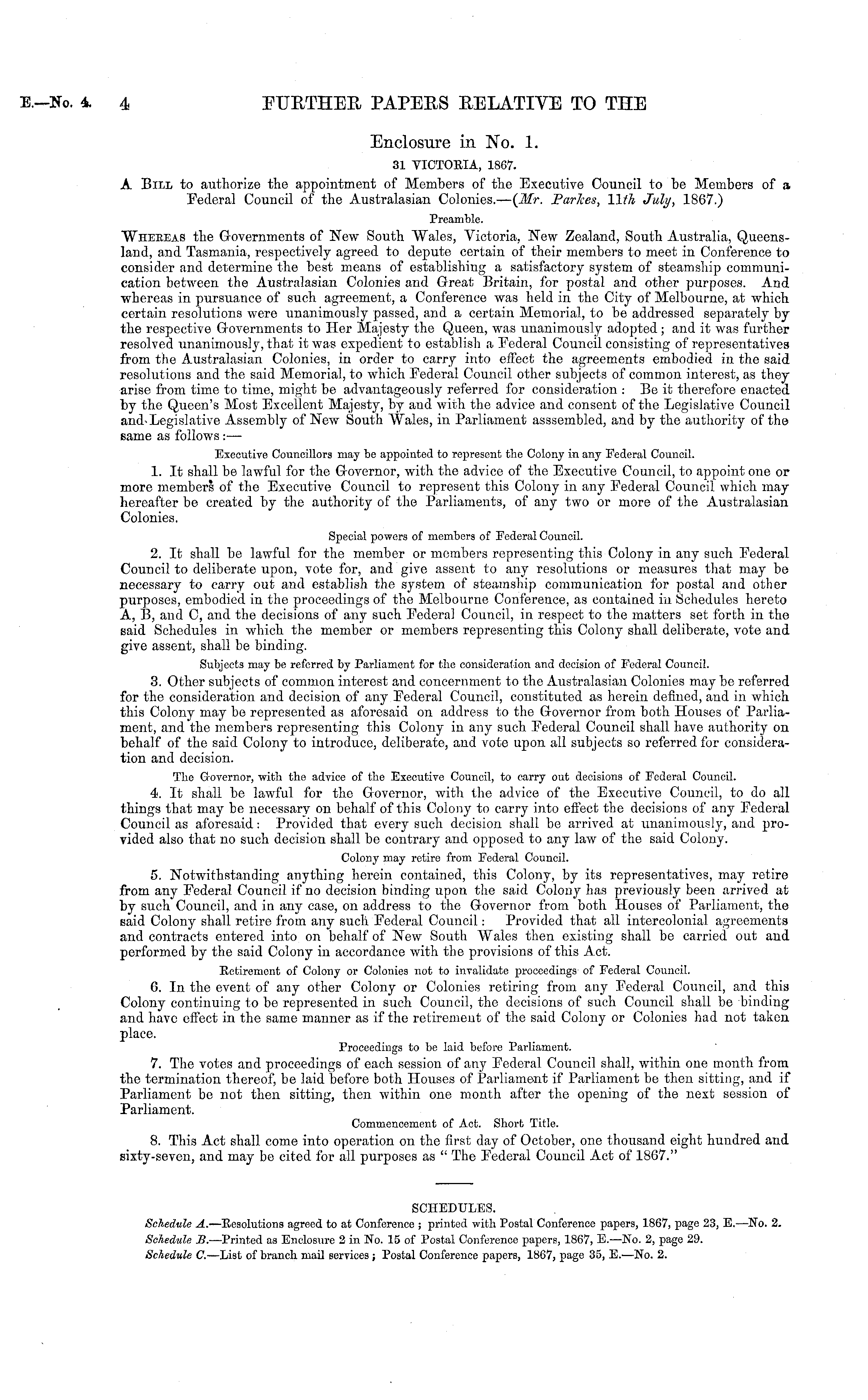 Enclosure in No. 1. 31 VICTORIA, 1867. A Bill to authorize the appointment of Members of the Executive Council to be Members of a Federal Council of the Australasian Colonies. — (Mr. Parkes, 11th July, 1867.) Preamble. Wheeeas the Governments of New South Wales, Victoria, New Zealand, South Australia, Queensland, and Tasmania, respectively agreed to depute certain of their members to meet in Conference to consider and determine the best means of establishing a satisfactory system of steamship communication between the Australasian Colonies and Great Britain, for postal and other purposes. And whereas in pursuance of such agreement, a Conference was held in the City of Melbourne, at which certain resolutions were unanimously passed, and a certain Memorial, to be addressed separately by the respective Governments to Her Majesty the Queen, was unanimously adopted; and it was further resolved unanimously, that it was expedient to establish a Federal Council consisting of representatives from the Australasian Colonies, in order to carry into effect the agreements embodied in the said resolutions and the said Memorial, to which Federal Council other subjects of common interest, as they arise from time to time, might be advantageously referred for consideration : Be it therefore enacted by the Queen's Most Excellent Majesty, by and with the advice and consent of the Legislative Council and Legislative Assembly of New South Wales, in Parliament asssembled, and by the authority of the same as follows: — Executive Councillors may be appointed to represent the Colony in any Federal Council. 1. It shall be lawful for the Governor, with the advice of tho Executive Council, to appoint one or more members of the Executive Council to represent this Colony in any Federal Council which may hereafter be created by the authority of the Parliaments, of any two or more of the Australasian Colonies. Special powers of members of Federal Council. 2. It shall be lawful for the member or members representing this Colony in any such Federal Council to deliberate upon, vote for, and give assent to any resolutions or measures that may bo necessary to carry out and establish the system of steamship communication for postal and other purposes, embodied in the proceedings of the Melbourne Conference, as contained hi Schedules hereto A, B, and C, and tho decisions of any such Federal Council, in respect to the matters set forth in the said Schedules in which the member or members representing this Colony shall deliberate, vote and give assent, shall be binding. Subjects may be referred by Parliament for the consideration and decision of Federal Council. 3. Other subjects of common interest and concernment to the Australasian Colonies may be referred for the consideration and decision of any Federal Council, constituted as herein defined, and in which this Colony may be represented as aforesaid on address to the Governor from both Houses of Parliament, and the members representing this Colony in any such Federal Council shall have authority on behalf of the said Colony to introduce, deliberate, and vote upon all subjects so referred for consideration and decision. The Governor, with the advice of the Executive Council, to carry out decisions of Federal Council. 4. It shall be lawful for the Governor, with the advice of the Executive Council, to do all things that may be necessary on behalf of this Colony to carry into effect the decisions of any Federal Council as aforesaid: Provided that every such decision shall be arrived at unanimously, and provided also that no such decision shall be contrary and opposed to any law of the said Colony. Colony may retire from Federal Council. 5. Notwithstanding anything herein contained, this Colony, by its representatives, may retire from any Federal Council if no decision binding upon the said Colony has previously been arrived at by such Council, and in any case, on address to the Governor from both Houses of Parliament, the said Colony shall retire from any such Federal Council: Provided that all intercolonial agreements and contracts entered into on behalf of New South Wales then existing shall be carried out and performed by the said Colony in accordance with the provisions of this Act. Retirement of Colony or Colonies not to invalidate proceedings of Federal Council. 6. In the event of any other Colony or Colonies retiring from any Federal Council, and this Colony continuing to be represented in such Council, the decisions of such Council shall be binding and have effect in the same manner as if tho retirement of the said Colony or Colonies had not taken place. Proceedings to be laid before Parliament. 7. The votes and proceedings of each session of any Federal Council shall, within one month from the termination thereof, be laid before both Houses of Parliament if Parliament be then sitting, and if Parliament be not then sitting, then within one month after the opening of the next session of Parliament. Commencement of Act. Short Title. 8. This Act shall come into operation on the first day of October, one thousand eight hundred and sixty-seven, and may bo cited for all purposes as " The Federal Council Act of 1867."