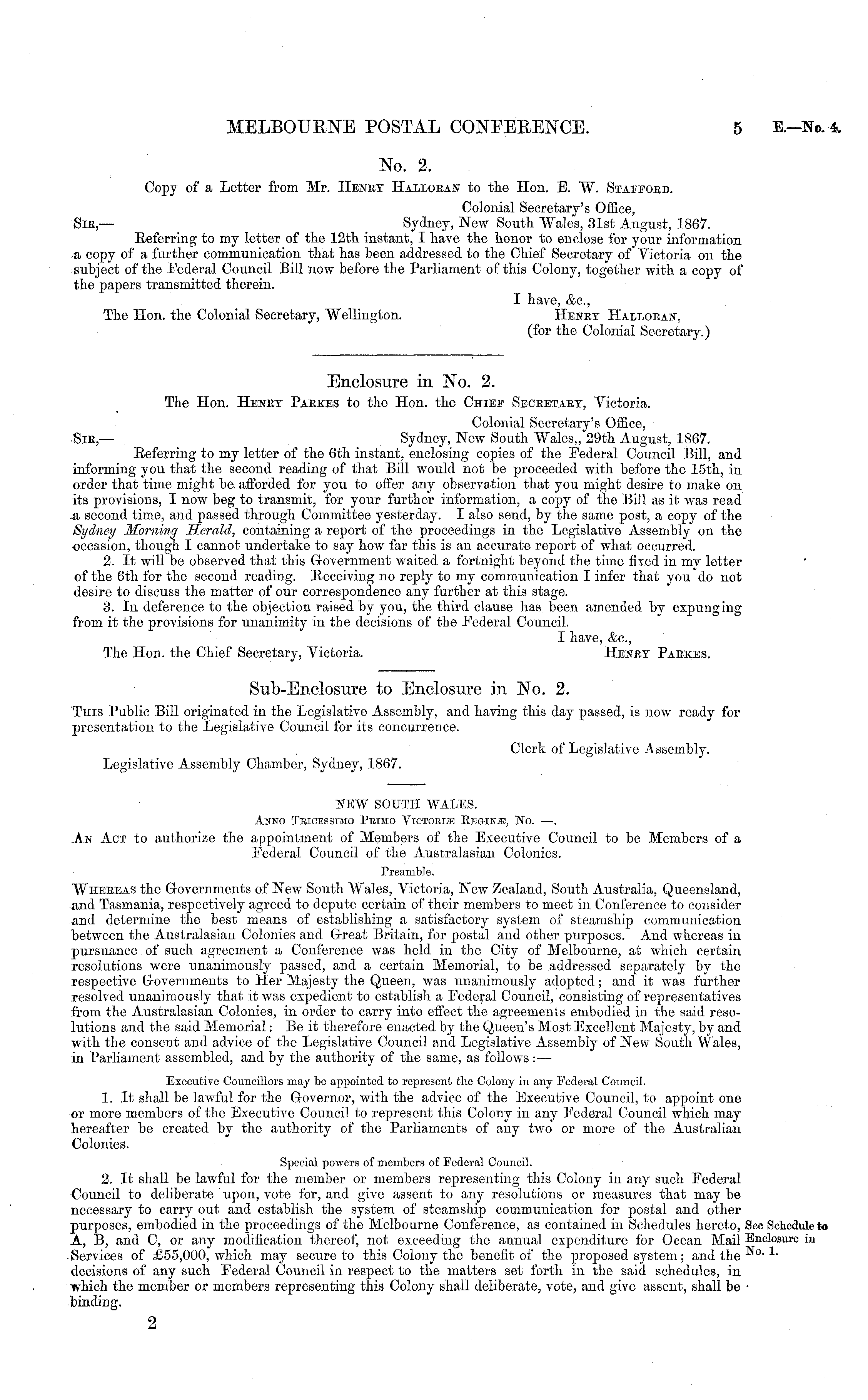 No. 2. Copy of a Letter from Mr. Heney Halloean to the Hon. E. W. Stapfoed. Colonial Secretary's Office, Sic,— Sydney, New South Wales, 31st August, 1867. Eefcrring to my letter of the 12th instant, I have the honor to enclose for your information a copy of a further communication that has been addressed to the Chief Secretary of Victoria on the subject of the Federal Council Bill now before the Barliament of this Colony, together with a copy of the papers transmitted therein. I have, &c, The Hon. tho Colonial Secretary, Wellington. Heney Halloean. (for the Colonial Secretary.)