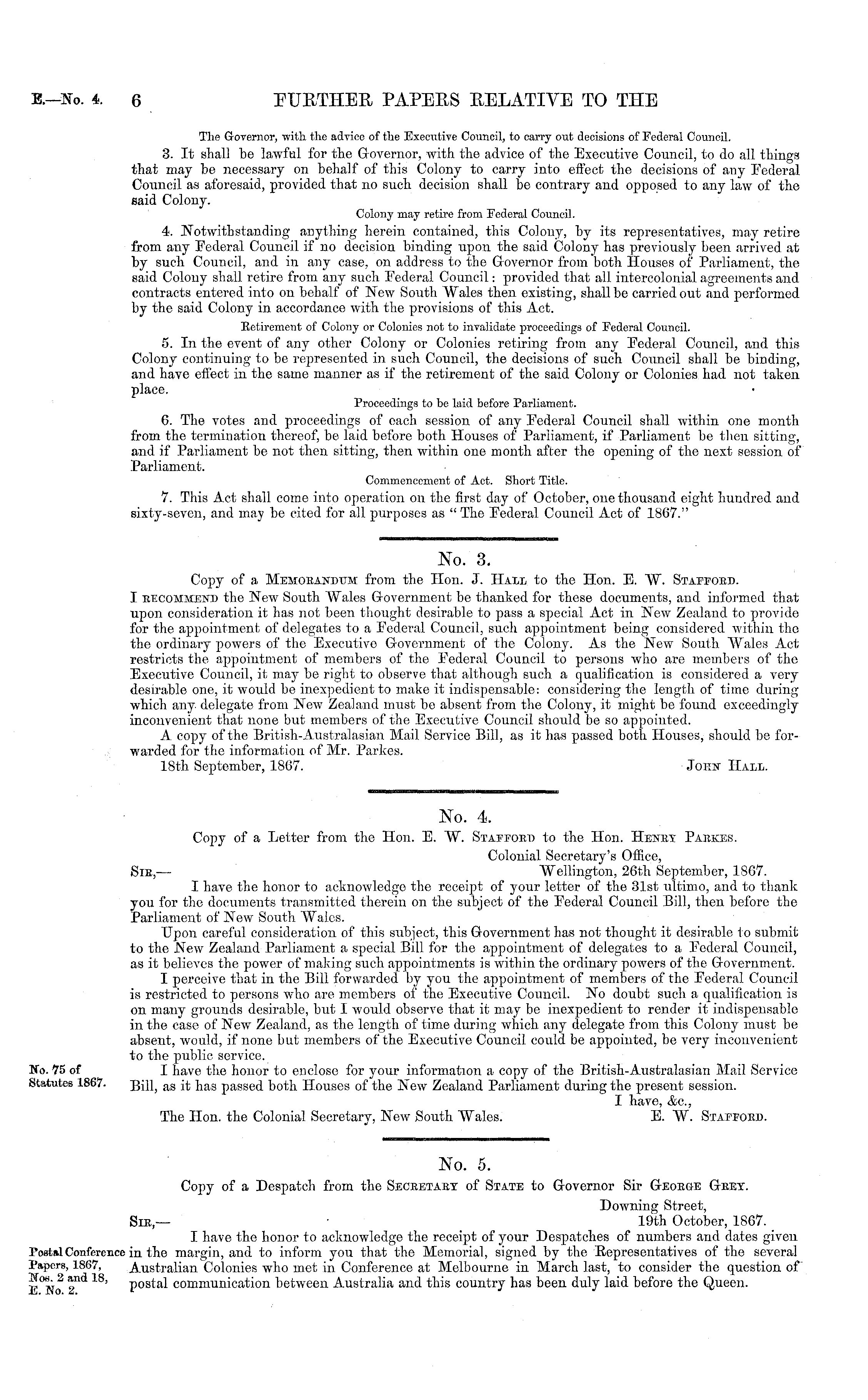 No. 3. Copy of a Memoeandum from the Hon. J. Hall to tho Hon. E. W. Staffoed. I becommend the New South Wales Government be thanked for these documents, and informed that upon consideration it has not been thought desirable to pass a special Act in New Zealand to provide for the appointment of delegates to a Federal Council, such appointment being considered within tho the ordinary powers of the Executive Government of the Colony. As the New South Wales Act restricts the appointment of members of the Federal Council to persons who are members of the Executive Council, it may bo right to observe that although such a qualification is considered a very desirable one, it would be inexpedient to make it indispensable: considering the length of time during which any. delegate from New Zealand must bo absent from the Colony, it might be found exceedingly inconvenient that none but members of the Executive Council should be so appointed. A copy of the British-Australasian Mail Service Bill, as it has passed both Houses, should bo forwarded for the information of Mr. Parkes. 18th September, 1867. John Hall.
