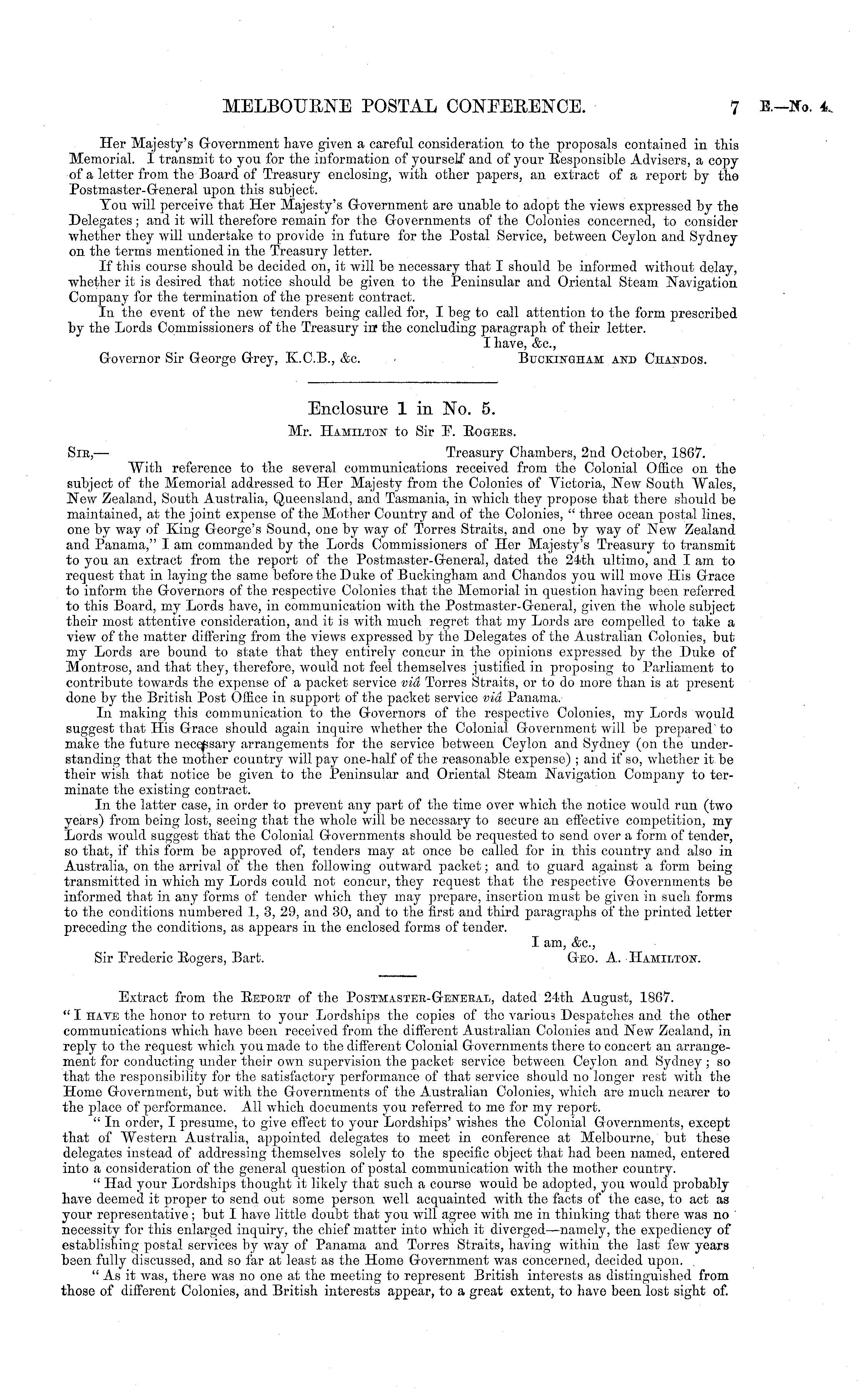 Enclosure 1 in No. 5. Mr. Hamilton to Sir F. Eogees. Sic, — Treasury Chambers, 2nd October, 1867. With reference to the several communications received from the Colonial Office on the subject of the Memorial addressed to Her Majesty from the Colonies of Victoria, New South Wales, New Zealand, South Australia, Queensland, and Tasmania, in which they propose that there should be maintained, at the joint expense of the Mother Country and of the Colonies, " three ocean postal lines, one by way of King George's Sound, one by way of Torres Straits, and one by way of New Zealand and Panama," I am commanded by the Lords Commissioners of Her Majesty's Treasury to transmit to you an extract from the report of tho Postmaster-General, dated the 24th ultimo, and I am to request that in laying the same before the Duke of Buckingham and Chandos you will move His Grace to inform the Governors of the respective Colonies that the Memorial in question having been referred to this Board, my Lords have, in communication with the Postmaster-General, given the whole subject their most attentive consideration, and it is with much regret that my Lords are compelled to take a view of the matter differing from the views expressed by the Delegates of the Australian Colonies, but my Lords are bound to state that they entirely concur in the opinions expressed by the Duke of Montrose, and that they, therefore, would not feel themselves justified in proposing to Parliament to contribute towards the expense of a packet service via Torres Straits, or to do more than is at present done by the British Bost Office in support of the packet service via Panama. In making this communication to the Governors of the respective Colonies, my Lords would suggest that His Grace should again inquire whether the Colonial Government will be prepared'to make the future necessary arrangements for the service between Ceylon and Sydney (on the understanding that the mother country will pay one-half of the reasonable expense) ; and if so, whether it be their wish that notice be given to the Peninsular and Oriental Steam Navigation Company to terminate the existing contract. In the latter case, in order to prevent any part of the time over which the notice would run (two years) from being lost, seeing that the whole will be necessary to secure an effective competition, my Lords would suggest that the Colonial Governments should be requested to send over a form of tender, so that, if this form be approved of, tenders may at once be called for in this country and also in Australia, on the arrival of the then following outward packet; and to guard against a form being transmitted in which my Lords could not concur, they request that tho respective Governments be informed that in any forms of tender which they may prepare, insertion must be given in such forms to the conditions numbered 1, 3, 29, and 30, and to the first and third paragraphs of the printed letter preceding the conditions, as appears in the enclosed forms of tender. I am, &c, Sir Frederic Eogers, Bart. Geo. A. Hamilton. Extract from the Eepokt of the Postmastee-Geneeal, dated 24th August, 1867. " I hate the honor to return to your Lordships the copies of tho various Despatches and the other communications which have been received from the different Australian Colonies and New Zealand, in reply to the request which you made to the different Colonial Governments there to concert an arrangement for conducting under their own supervision the packet service between Ceylon and Sydney ; so that the responsibility for the satisfactory performance of that service should no longer rest with the Home Government, but with the Governments of the Australian Colonies, which are much nearer to the place of performance. All which documents you referred to me for my report. " In order, I presume, to give effect to your Lordships' wishes the Colonial Governments, except that of Western Australia, appointed delegates to meet in conference at Melbourne, but these delegates instead of addressing themselves solely to the specific object that had been named, entered into a consideration of the general question of postal communication with the mother country. " Had your Lordships thought it likely that such a course would be adopted, you would probably have deemed it proper to send out some person well acquainted with the facts of the case, to act as your representative; but I have little doubt that you will agree with me in thinking that there was no necessity for this enlarged inquiry, the chief matter into which it diverged—namely, the expediency of establishing postal services by way of Panama and Torres Straits, having within the last few years been fully discussed, and so far at least as the Home Government was concerned, decided upon. " As it was, there was no one at the meeting to represent British interests as distinguished from those of different Colonies, and British interests appear, to a great extent, to have been lost sight of.