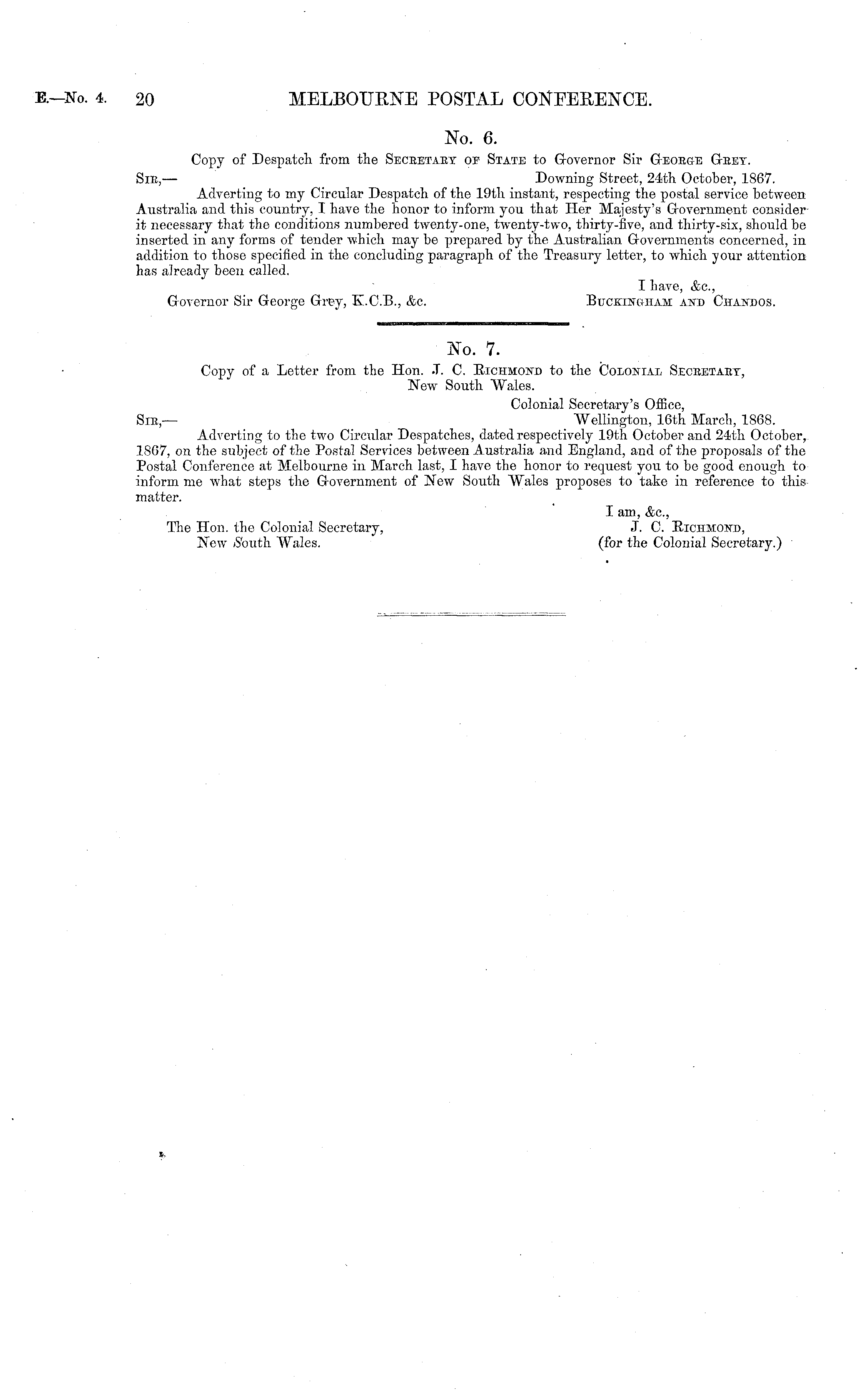 No. 6. Copy of Despatch from the Seceetaby op State to Governor Sir Geoege Geey. Sic,— Downing Street, 24th October, 1867. Adverting to my Circular Despatch of the 19th instant, respecting tho postal service between Australia and this country, I have the honor to inform you that Her Majesty's Government consider it necessary that tho conditions numbered twenty-one, twenty-two, thirty-five, and thirty-six, should be inserted in any forms of tender which may be prepared by the Australian Governments concerned, in addition to those specified in the concluding paragraph of the Treasury letter, to which your attention has already been called. I have, &c, Governor Sir George Grey, X.C.8., &c. Buckingham and Ciiandos.