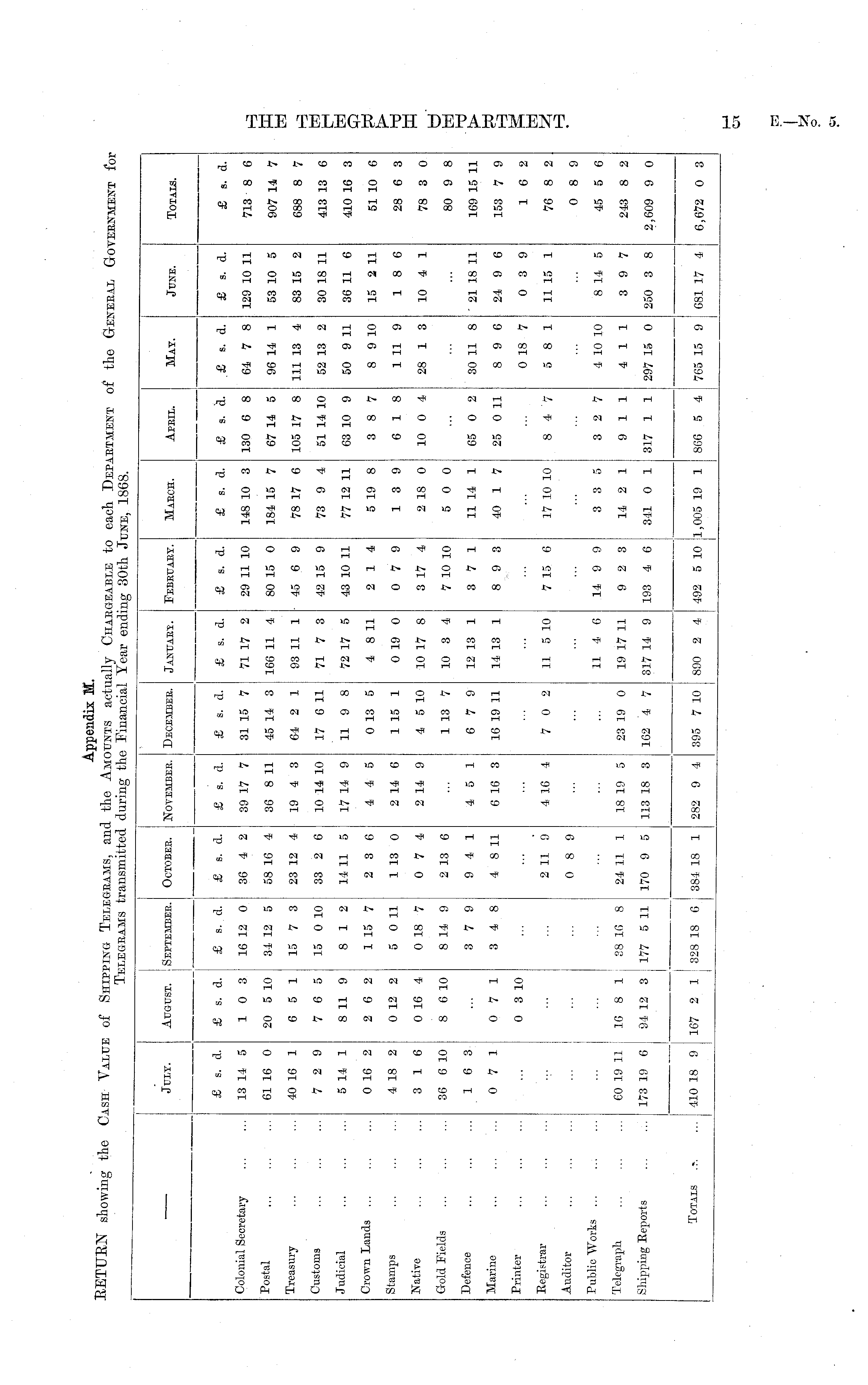 Appendix M. RETURN showing the CASH VALUE of SHIPPING TELEGRAMS, and the AMOUNTS actually CHARGEABLE to each DEPARTMENT of the GENERAL GOVERNMENT for TELEGRAMS transmitted during the Financial Year ending 30th JUNE, 1868.