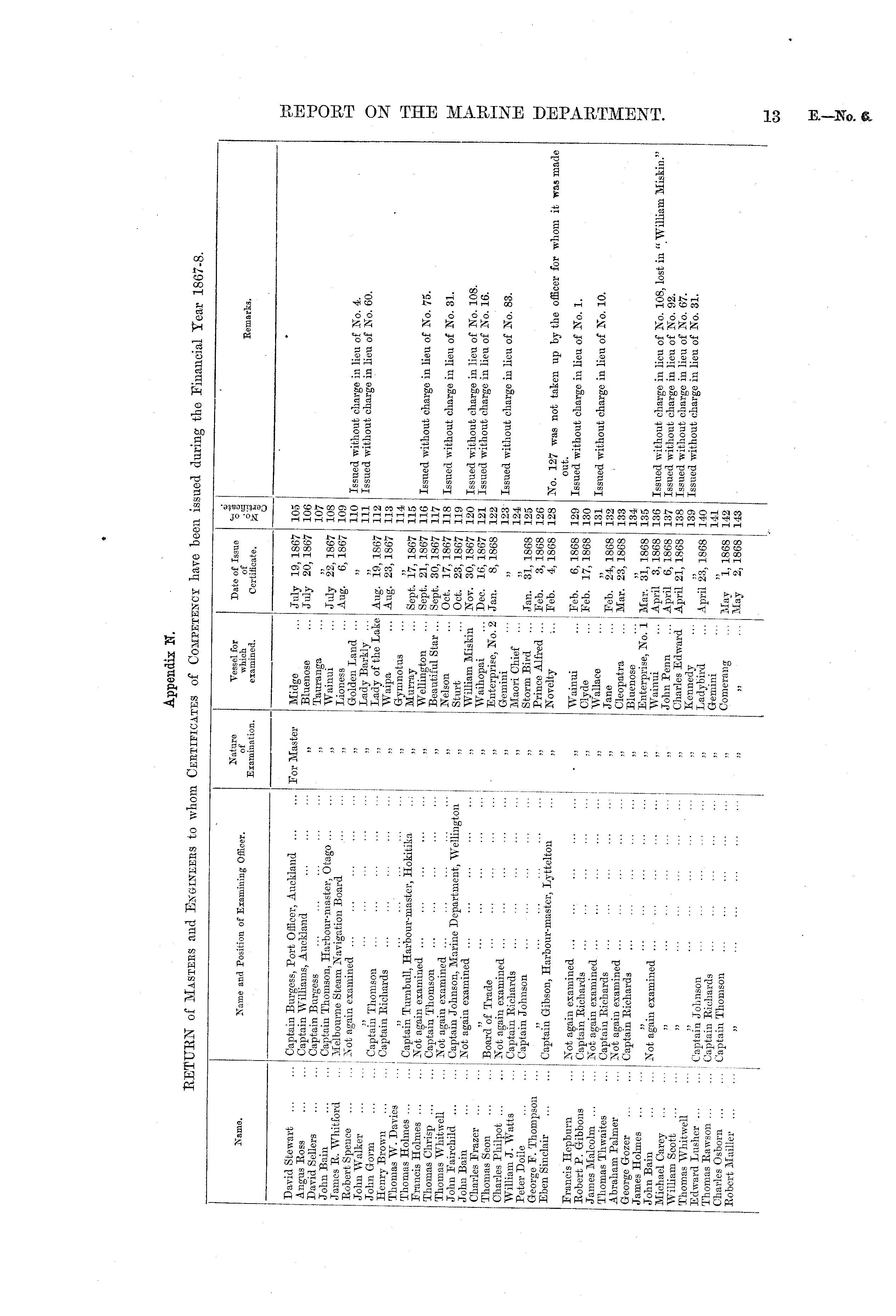 Appendix 11. EBftJSN of Masters and Ejc&cteees to whom Certificates of Competency have been issued during the Financial Year 1867-8.