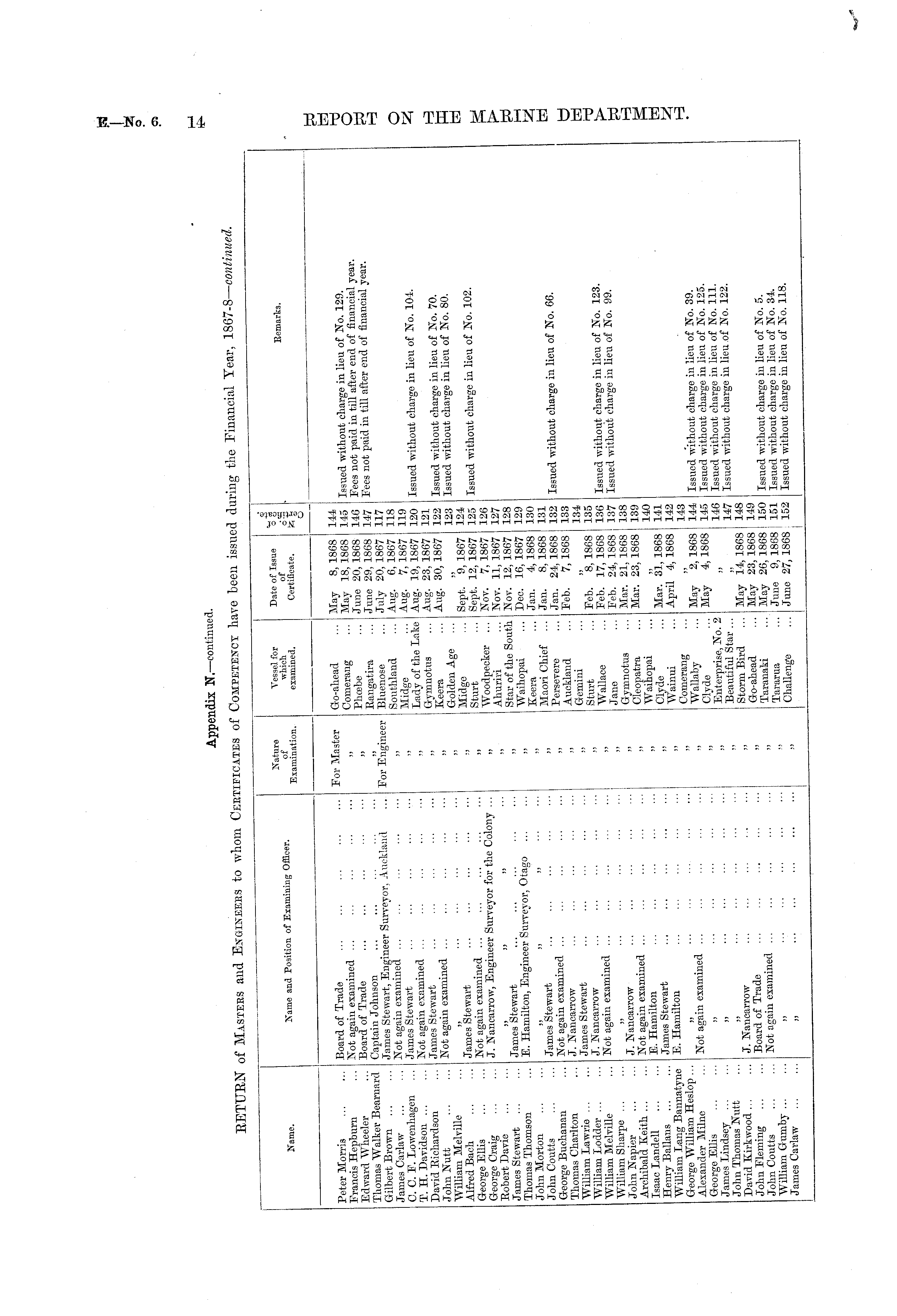 Appendix N.— continued. EETURN of Masters and Engineebs to whom Certificates of Competency have been issui id du: ring the Financial Tear, 1867-8— continued. Nature of Examination. Vessel for which examined. Date of Issue of Certificate. D Remarks. Name and Position of Examining Officer. Name. I Peter Morris Francis Hepburn Edward Wheeler Thomas Walker Bearnard Gilbert Brown James Carlaw C. C. F. Lowenhagen T. H. Davidson David Richardson John Nutt William Melville Alfred Bach George Ellis George Craig Robert Davie James Stewart Thomas Thomson John Morton John Coutts George Buchanan Thomas Charlton William Lawrie ... William Lodder ... William Melville William Sharpe John Napier Archibald Keith Isaac Landell Henry Ballans William Lang Bannatyne George William Heslop ... Alexander Milne George Ellis James Lindsey John Thomas' Nutt David Kirkwood ... John Fleming John Coutts William Gumby ... James Oarlaw Board of Trade Not again examined ... Board of Trade Captain Johnson James Stewart, Engineer Surveyor, Auckland Not again examined James Stewart Not again examined ... James Stewart Not again examined ... For Master j) For Engineer Go-ahead Comerang Phoebe Kangatira Bluenose Southland Midge Lady of the Lake G-ymnotus Keera Golden Age Midge Sturt Woodpecker ... Ahuriri Star of the South Waihopai Keera Maori Chief Persevere Auckland Gemini Start Wallace Jane Gymnotus Cleopatra Waihopai Clyde Wainui Comerang Wallaby Clyde Enterprise, No. 2 Beautiful Star ... | Storm Bird Go-ahead Taranaki Tararua Challenge May 8, 18G8 May 18, 1868 June 20, 1868 June 29, 1868 July 20, 1867 Aug. 6, 1867 Aug. 7, 1867 Aug. 19, 1867 Aug. 23, 1867 Aug. 30, 1867 144 145 146 147 117 118 119 120 121 122 123 124 125 126 127 128 129 130 131 132 133 134 135 136 137 138 139 140 141 142 143 144 145 146 147 I 148 I 149 ! 150 i 151 152 Issued without charge in lieu of No. 129. Fees not paid in till after end of financial year. Fees not paid in till after end of financial year. Issued without charge in lieu of No. 10-1. Issued without charge in lieu of No. 70. Issued without charge in lieu of No. 80. James Stewart Not again examined J. Nancarrow, Engineer Surveyor for the Colony ... )> Sept. 9, 1867 Sept. 12, 1867 Nov. 7, 1867 Nov. 11, 1867 Nov. 12, 1867 Dec. 16, 1867 Jan. 4, 1868 Jan. 8, 1868 | Jan. 24, 1868 Eeb. 7, 1868 j) Issued without charge in lieu of No. 102. )? ), 3) » James Stewart E. Hamilton, Engineer Surveyor, Otago i) Issued without charge in lieu of No. 66. ;j James Stewart Not again examined ... J. Nancarrow James Stewart J. Nancairow ... ... ... ■ • ■ - Not again examined ... " >> Issued without charge in lieu of No. 123. Issued without charge in liexi of No. 99. " Feb. 8, 1868 Eeb. 17, 1868 Feb. 24, 1868 Mar. 21, 1868 Mar. 23, 1868 „ J. Nancarrow Not again examined ... E. Hamilton James Stewart E.Hamilton " » j) Mar. 31, 1868 April 4, 1868 ■>•> „ Not again examined ... ,, jj May "2, 1868 May 4, 1868 Issued without charge in lieu of No. 39.^ Issued without charge in lieu of No. 125. Issued without charge in lieu of No. 111. Issued without charge in lieu of No. 122. - )) J. Nanearrow Board of Trade Not again examined ... „ » May 14, 1868 May 23, 1868 May 26, 1868 June 9, 1868 June 27, 1868 Issued without charge in lieu of No. 5. Issued without charge in lieu of No. 34. Issued without charge in lieu of No. 118, ,, » » »