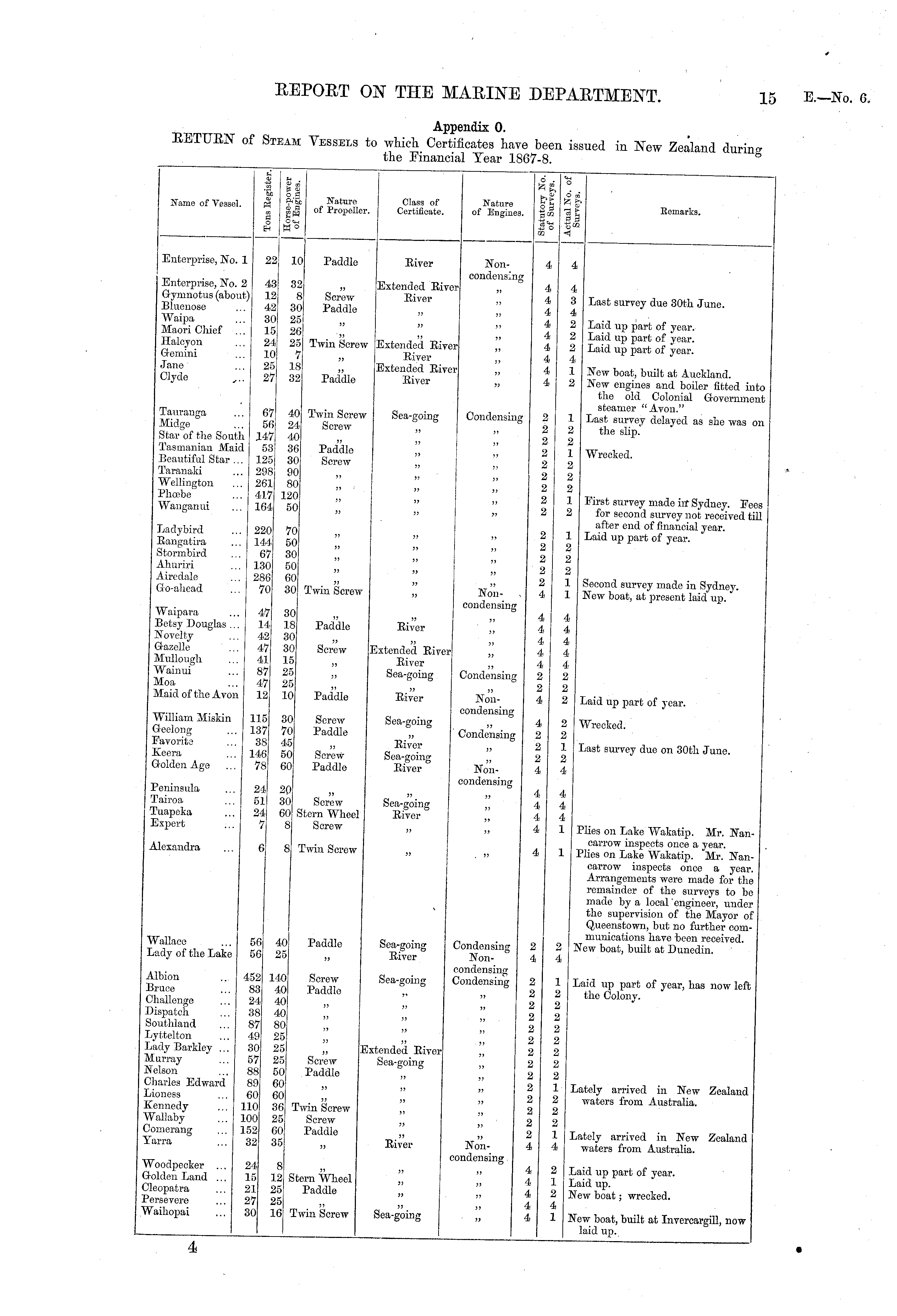 Appendix 0. EETTJRN of Steam Vessels to which Certificates have been issued in New Zealand during the Financial Tear 1867-8. &