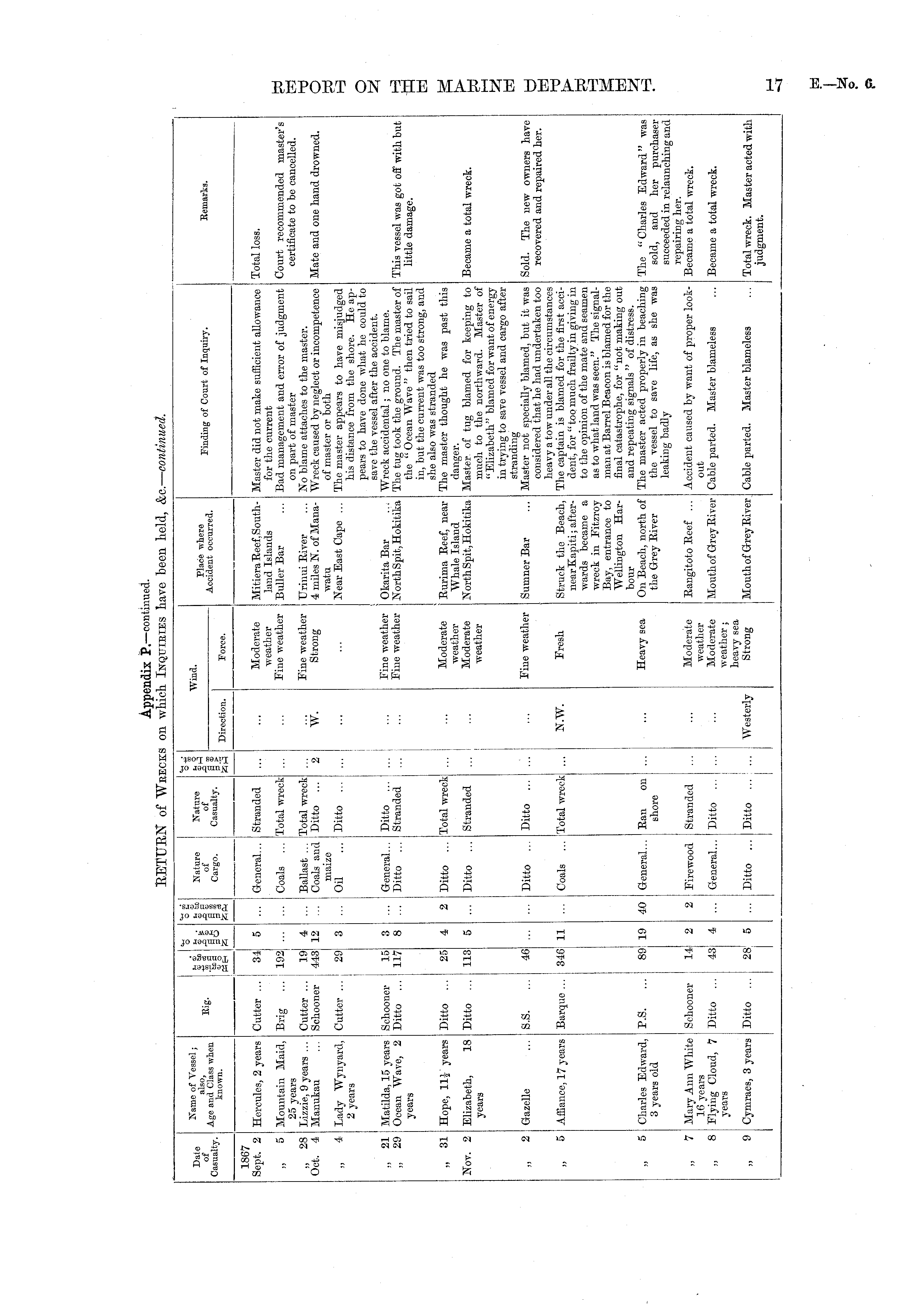 Appendix 3?,—continued. RETURN of "VVeecks on which Inquibies have been held, &c. — continued. Date of Casualty. 1867 Sept. 2 Kame of Vessel; also, Age and Class when known. Hercules, 2 years Rig. If Ma j ! Cutter ... | 34 Brig ... 192 Cutter ... 19 Schooner 443 Cutter ... 29 O Jo I 1 5 It Nature of Cargo. G-encral... TCature of Casualty. Stranded 11 Direction. i Wind. Force. Moderate weather I Fine weather j ii-CciaeiiL occurred. Mitiera Reef, Southland Islands Buller Bar Place where Master did not make sufficient allowance for the current Bad management and error of judgment on part of master jSTo blame attaches to the master. Wreck caused by neglect or incompetence of master or both The master appears to have misjudged his distance from the shore. He appears to have done what he could to save the vessel after the accident. Wreck accidental; no one to blame. The tug took the ground. The master of the " Ocean Wave " then tried to sail in, but the current was too strong, and she also was stranded The master thought he was past this danger. Master of tug blamed for keeping to much to the northward. Master of "Elizabeth" blamed for want of energy in trying to save vessel and cargo after stranding Master not specially blamed, but it was considered that he had undertaken too heavy a tow under all the circumstances The captain is blamed for the first accident, for "too much frailty in giving in to the opinion of the mate and seamen as to what land was seen." The signalman at Barrel Beacon is blamed for the final catastrophe, for "not making out and repeating signals" of distress. The master acted properly in beaching the vessel to save life, as she was leaking badly Finding of Court of Inquiry. Total loss. Keniarks. ,, 5 Mountain Maid. 25 years Lizzie, 9 years ... Manukau Coals Total wreck ... Court recommended master's certificate to be cancelled. „ 28 Oct. 4 4 12 Ballast ... Coals and maize Oil Total wreck | Ditto ... 2 w. Fine weather Strong TJrinui River 4 miles N. of Manawatu Near East Cape ... Mate and one hand drowned. » 4 Lady Wynyard, 2 years o 3 Ditto ... ! This vessel was got off with but little damage. J) 21 29 Matilda, 15 years Ocean Wave, 2 years Schooner 15 Ditto ... 117 15 117 3 8 General... | Ditto ... Ditto ... j Stranded Fine weather Fine weather Okarita Bar NorthSpit, Hokitika , Hope, 11 j years Ditto ... 25 Ditto ... [Total wreck ■ j Moderate weather Moderate weather Rurima Reef, near Whale Island North Spit, Hokitika „ 31 Not. 2 Elizabeth, 18 Ditto ... 113 25 113 4 5 2 Ditto ... Stranded Became a total wreck. years 2 Gazelle ... Affiance, 17 years S.S. ... 46 Barque ... 346 -1(5 Ditto ... Ditto ... Total wreck N.W. Fine weather Fresh Sunnier Ear Struck the Beach, near Kapiti; afterwards became a wreck in Fitzroy Bay, entrance to Wellington Harbour On Beach, north of the Grey River Sold. The new owners have recovered and repaired her. >> 5 Coals 346: 11 !) 5 Charles Edward, 3 years old P.S. 89' 19 40 General... Ran on shore Heavy sea The " Charles Edward" was sold, and her purchaser succeeded in relaunching and repairing her. Became a total wreck. Mary Ann White 16 years Flying Cloud, 7 years Schooner Firewood Stranded Moderate weather Moderate weather; heavy sea Strong Rangitoto Reef ... Accident caused by want of proper lookout Cable parted. Master blameless 7 14 2 2 8 Ditto ... 43 4 General... Ditto ... Mouth of Grey River Became a total wreck. J) 9 Cymraes, 3 years Ditto .., Ditto ... Ditto ... Westerly Mouth of Grey River Cable parted. Master blameless Total wreck. Master acted with judgment. 28'